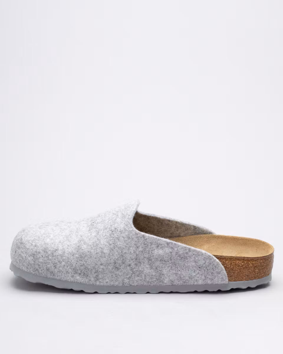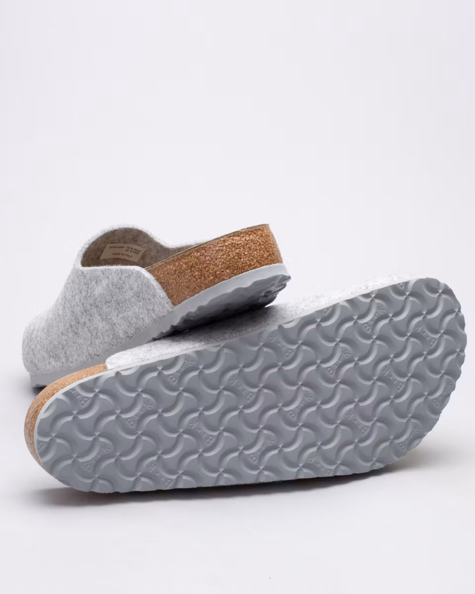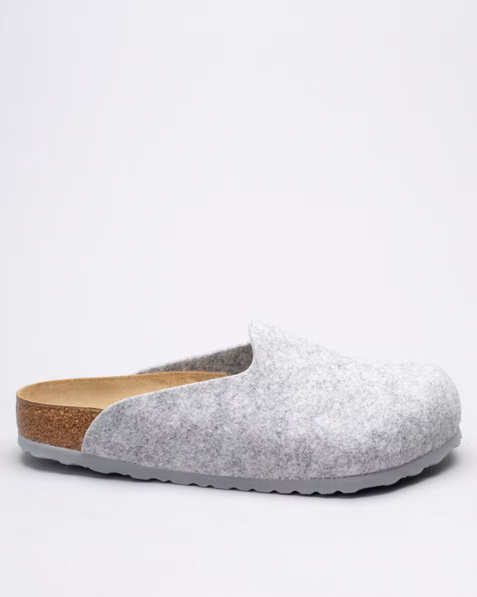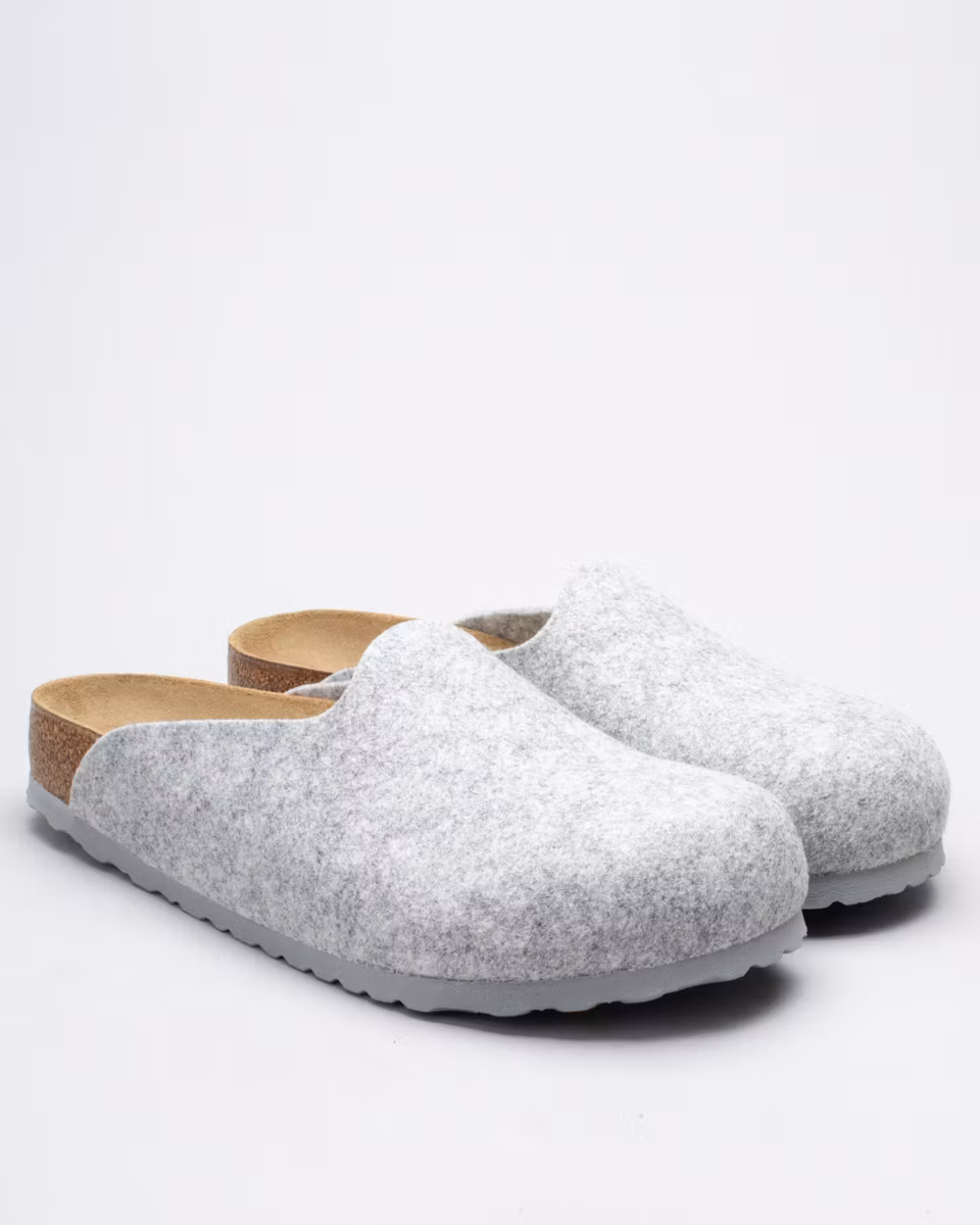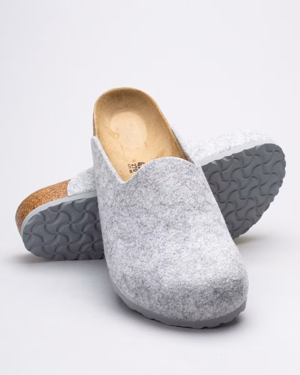 Amsterdam is a closed clog-style sandal from Birkenstock. Upper in light grey felted wool blend with 70% wool. Leather-lined cork footbed. Outsole in EVA rubber. Regular width. Made in Germany.