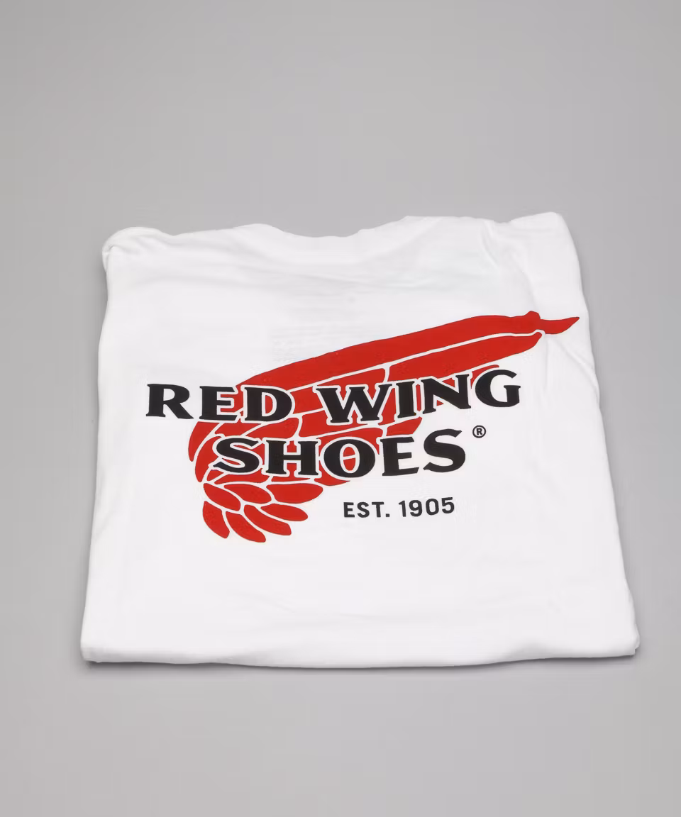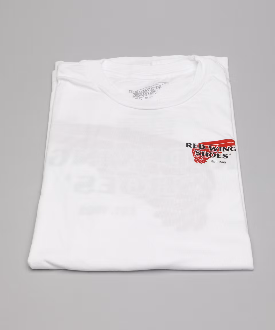 White T-Shirt from Red Wing Shoes. Logo on chest and back. 100% cotton. Made in USA.