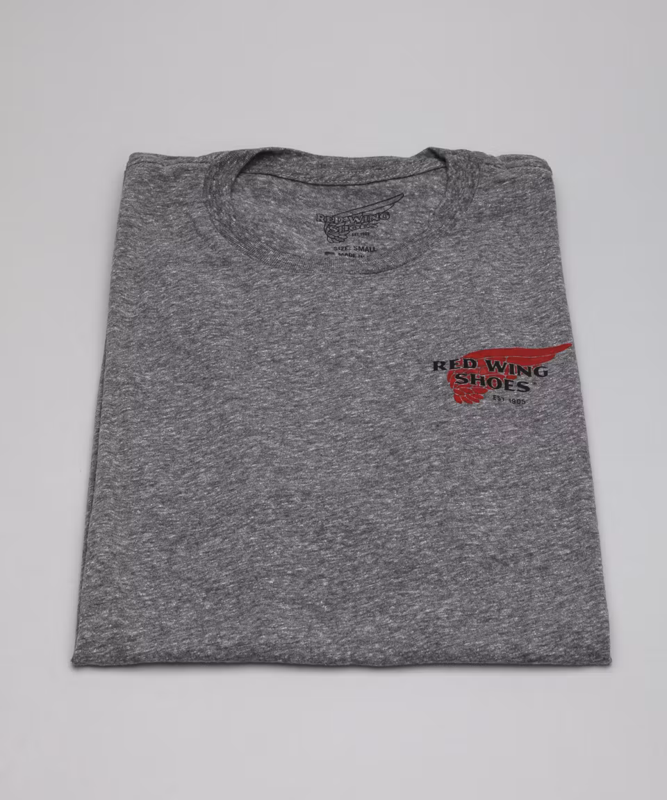 Grey T-Shirt from Red Wing Shoes. Logo on chest and back. 100% cotton. Made in USA.