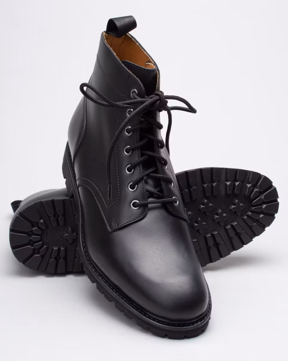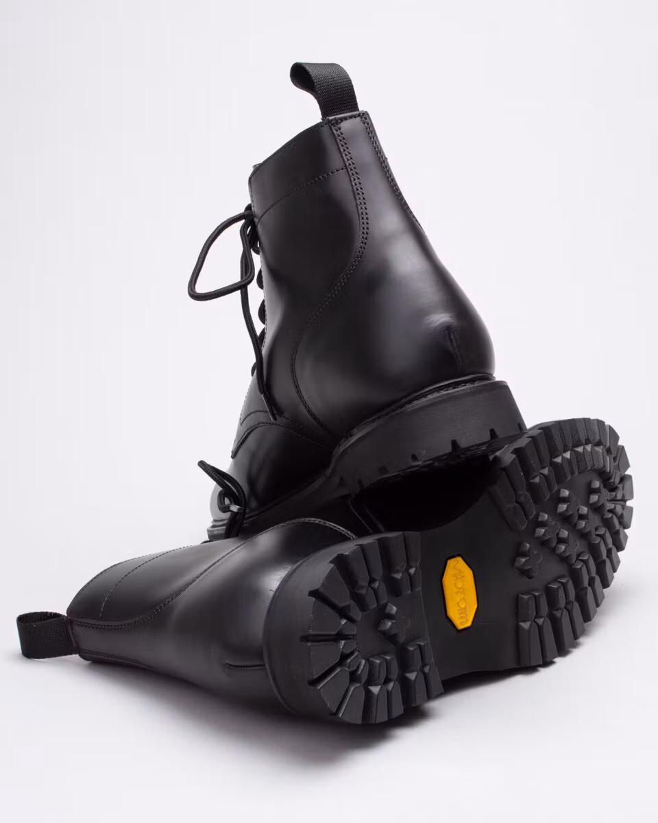 Derby boot with plain toe from Spanish Berwick. Upper in black, oiled, chromex leather. Full leather lining. Leather insole. Vibram Montagna lugged rubber outsole. Textile pull-loops. Goodyear welted construction with storm welt. Made in Spain. Last: HO297