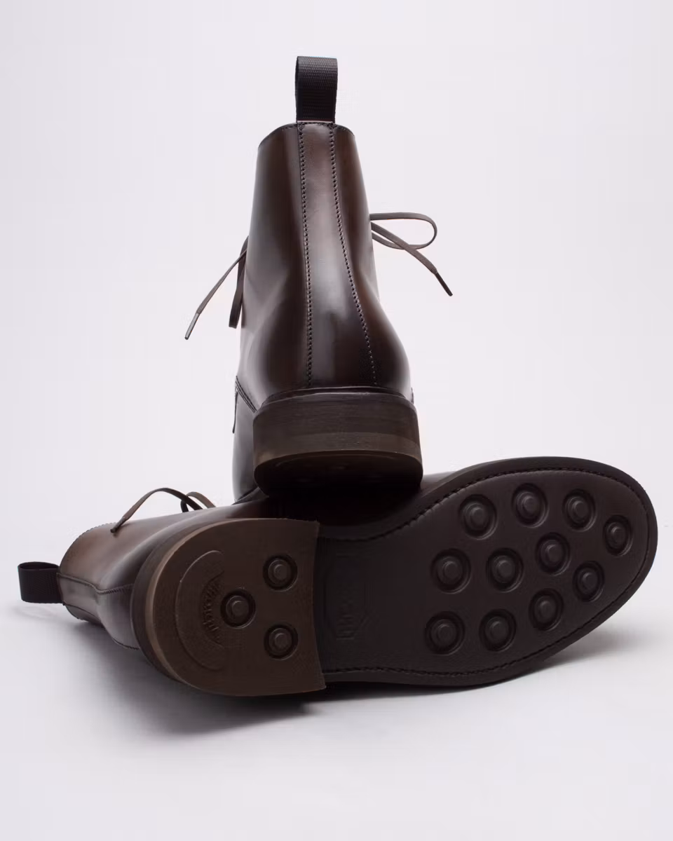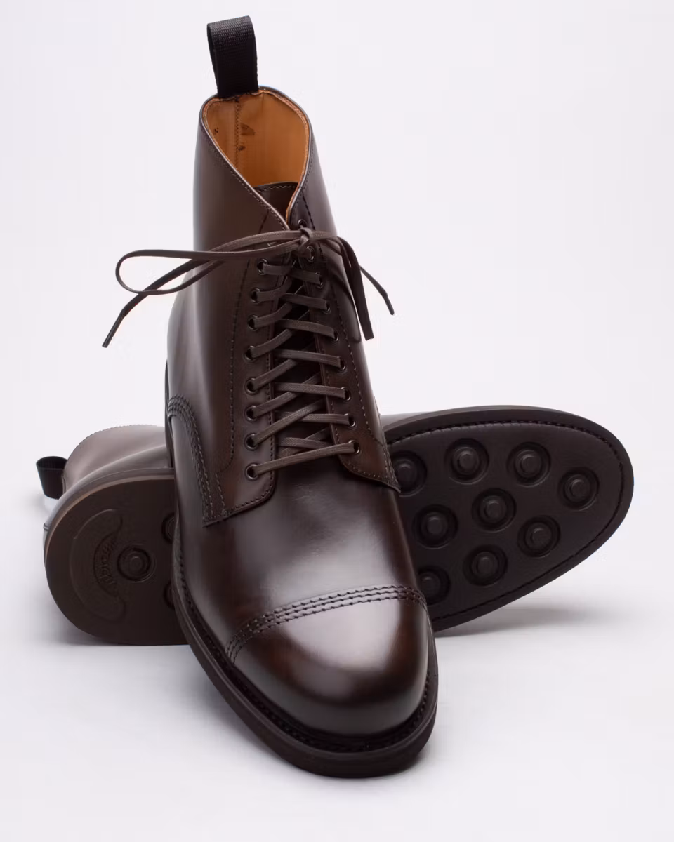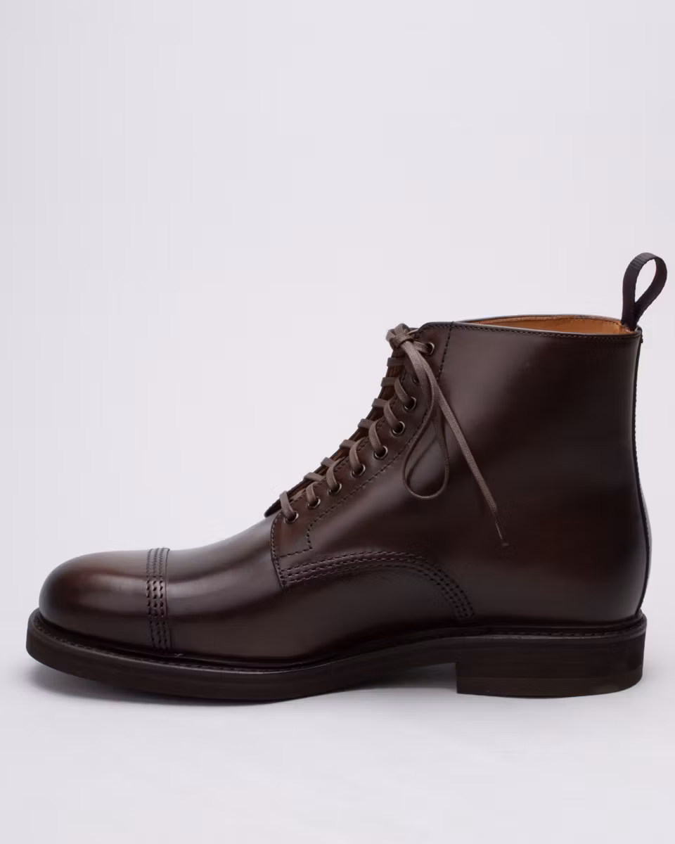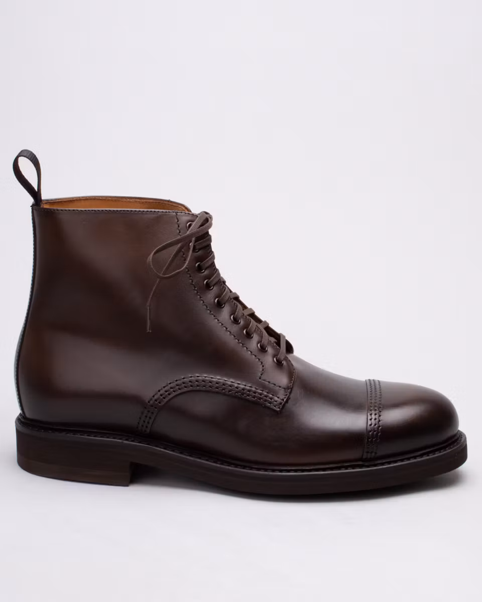 Derby boot with cap toe. Upper in dark brown calfskin. Fully leather-lined. Leather insole. Vibram® Eton rubber outsole. Goodyear welted construction with storm welt. Made in Spain. Last: HO768.