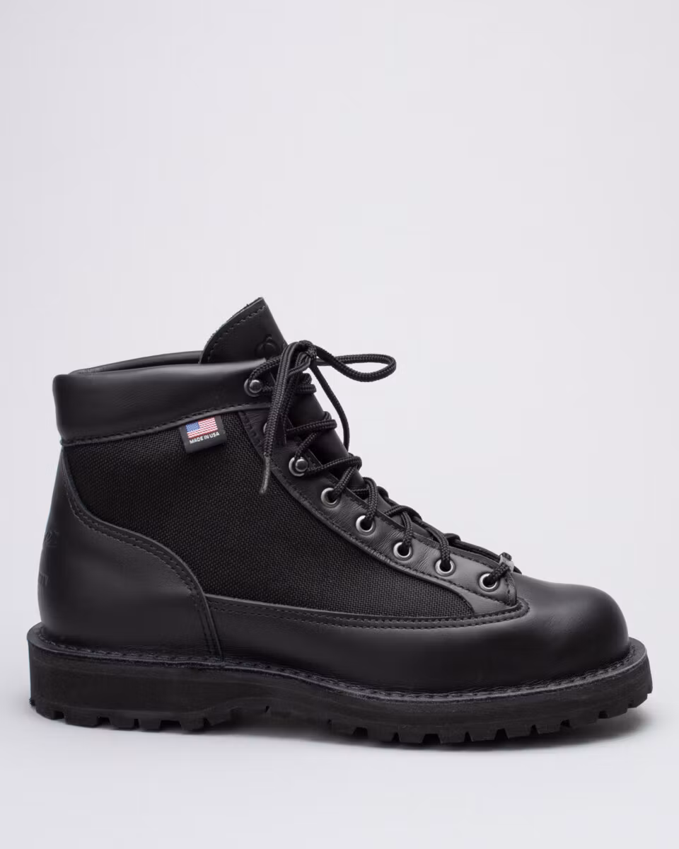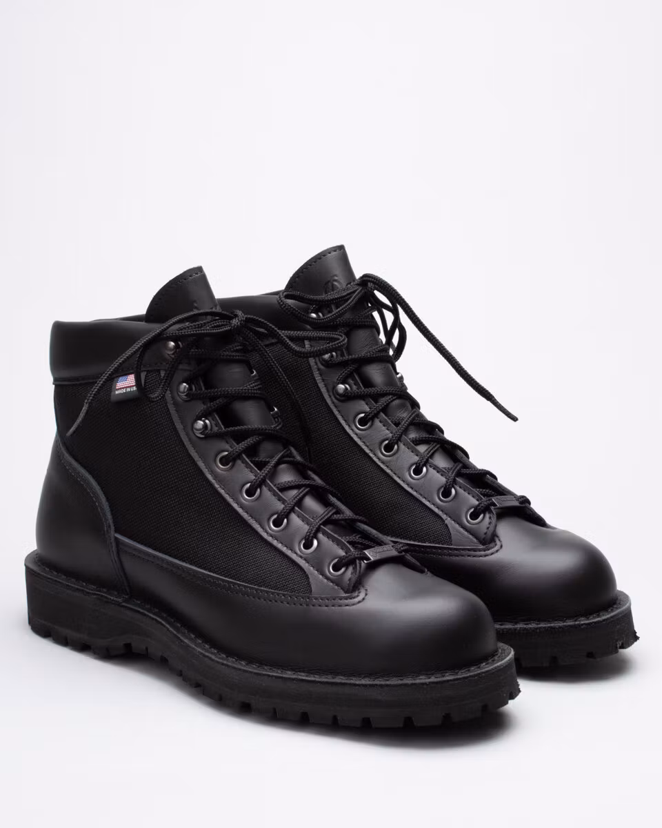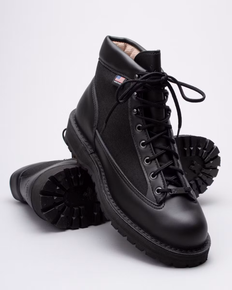 6-inch boot from american Danner. Upper in black, full grain, leather and 6-inch boot from american Danner. Upper in light brown leather and Cordura Denier nylon. Textile lining with Gore-Tex membrane. Vibram Kletterlift outsole for extra shock absorbation and durability. Stitch Down construction. Wide last. Made in USA.