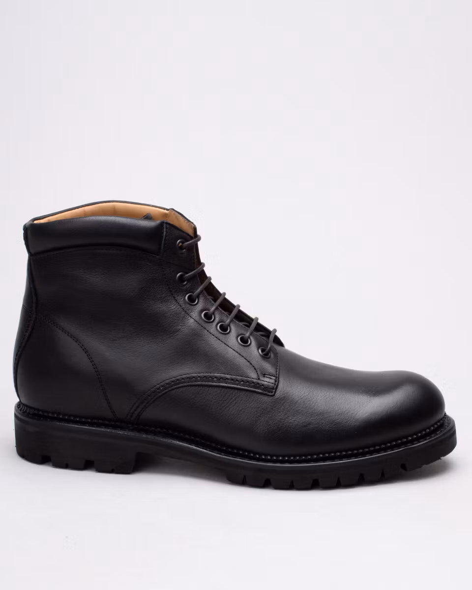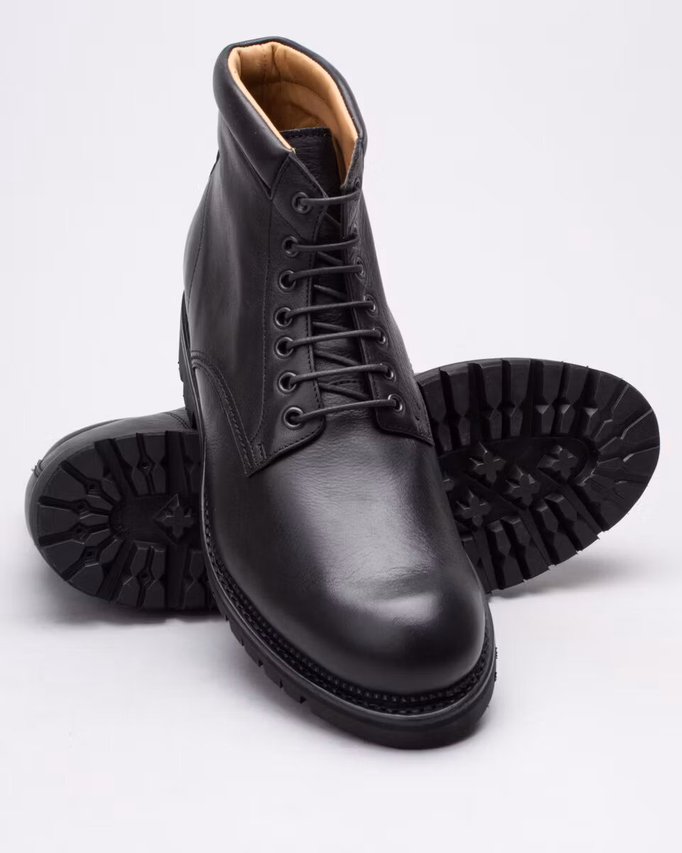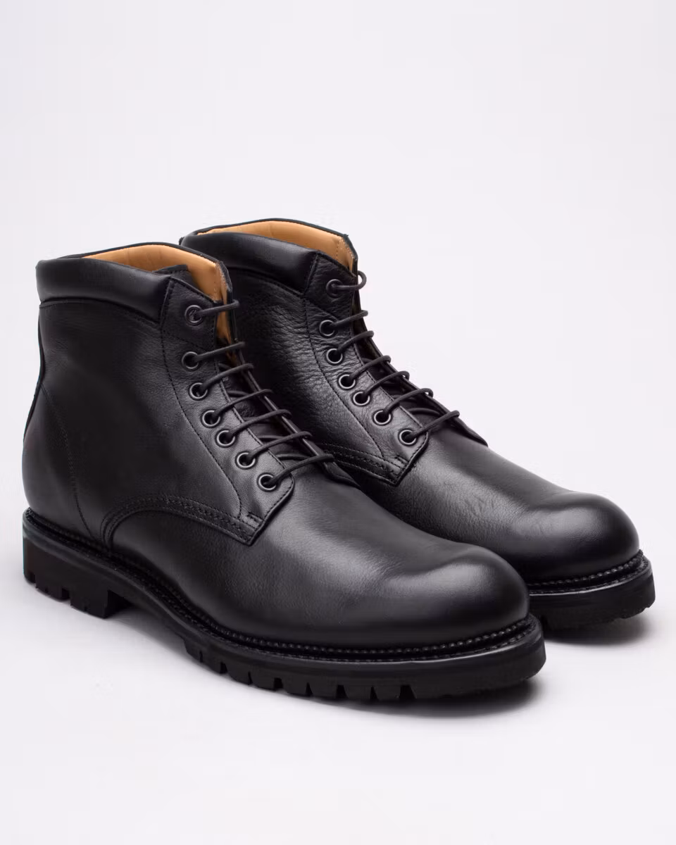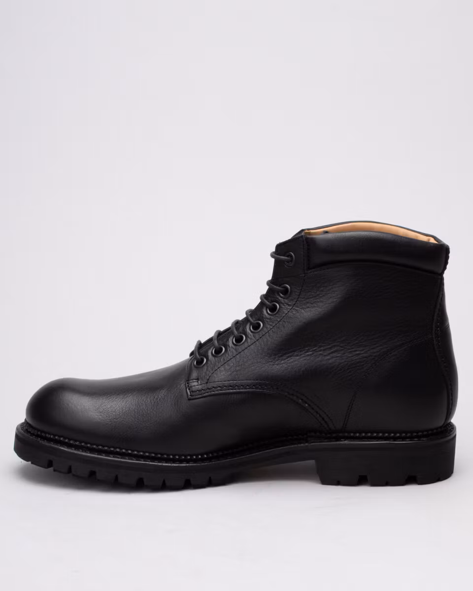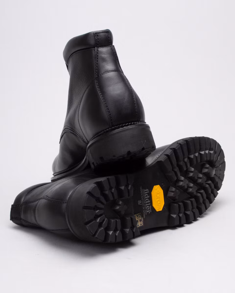 6-inch oxford boot from Fiddler. Upper in black full grain waxed leather. Full leather lining. Cushioned collar. Leather insole. Vibram® 1149 Montagna lugged rubber outsole. Goodyear welted construction with storm welt. Cotton and leather laces. Handcrafted in Spain.