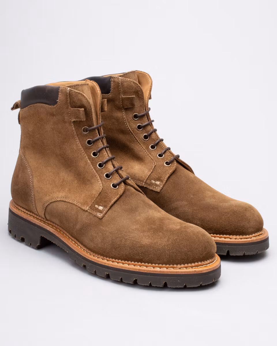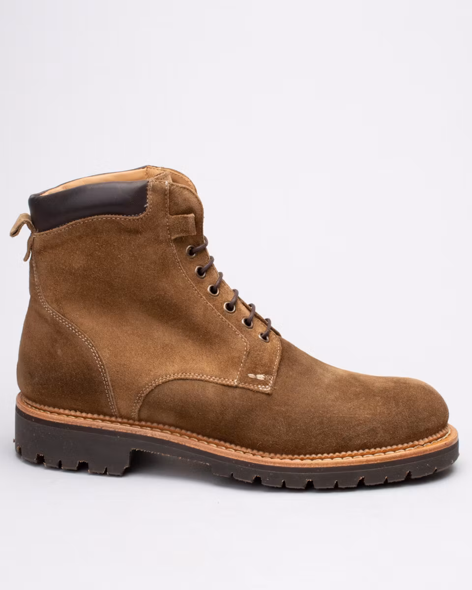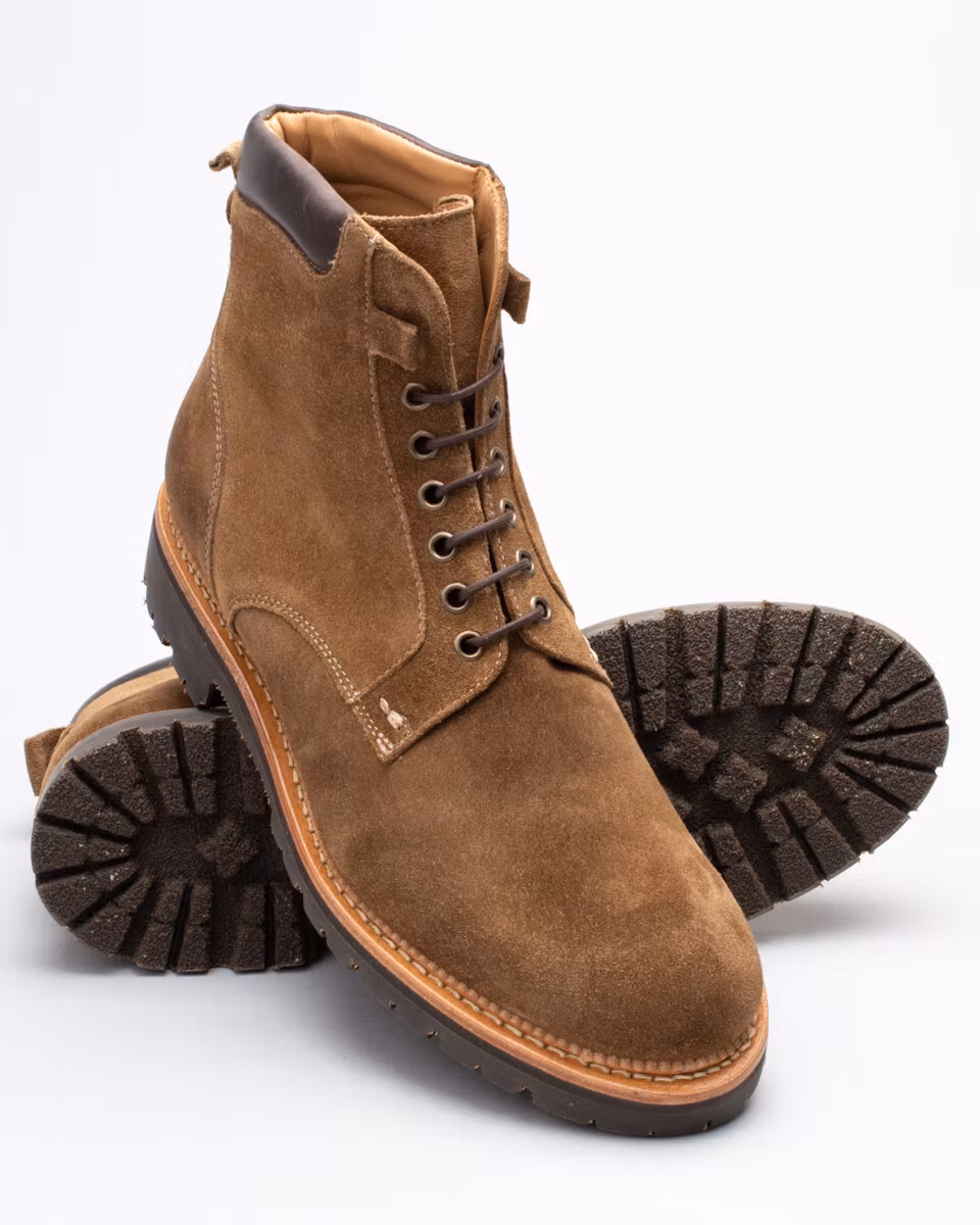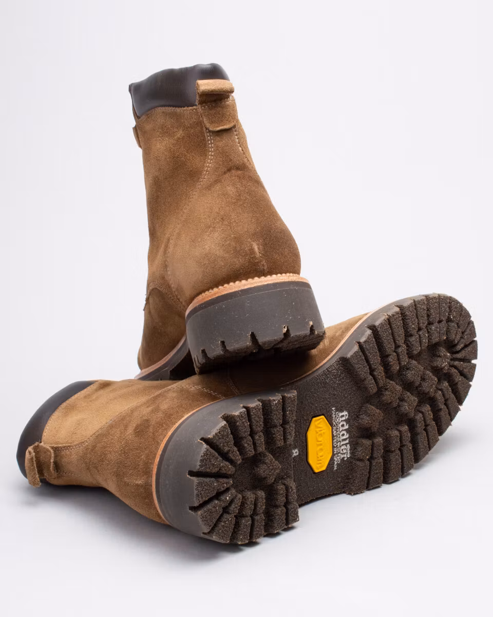 6-inch oxford boot from Fiddler. Upper in high quality Italian suede. Full leather lining. Cushioned collar. Leather insole. Vibram® Mister Tank lugged rubber outsole for ultimate traction. Goodyear welted construction with storm welt. Cotton and leather laces. Handcrafted in Spain.