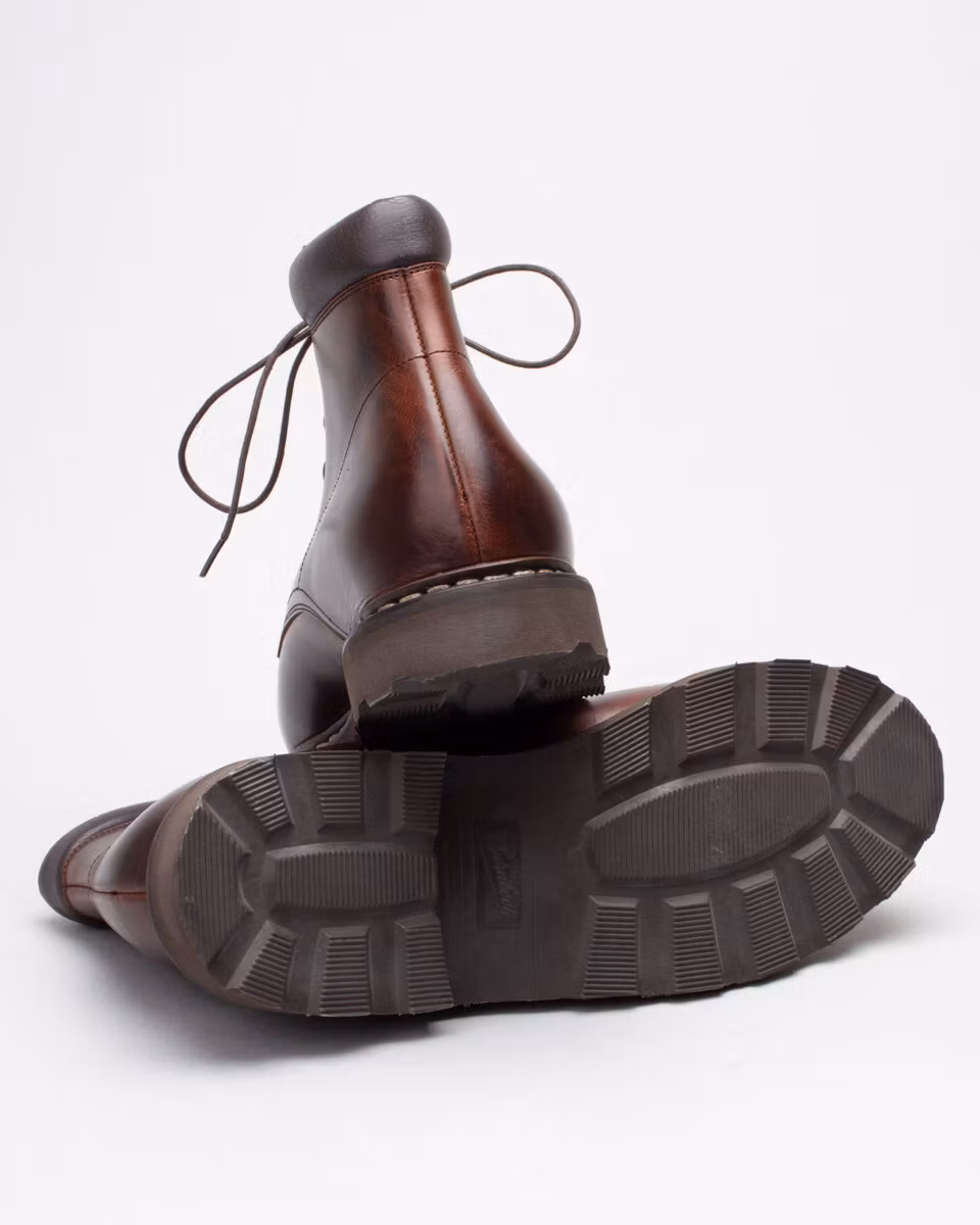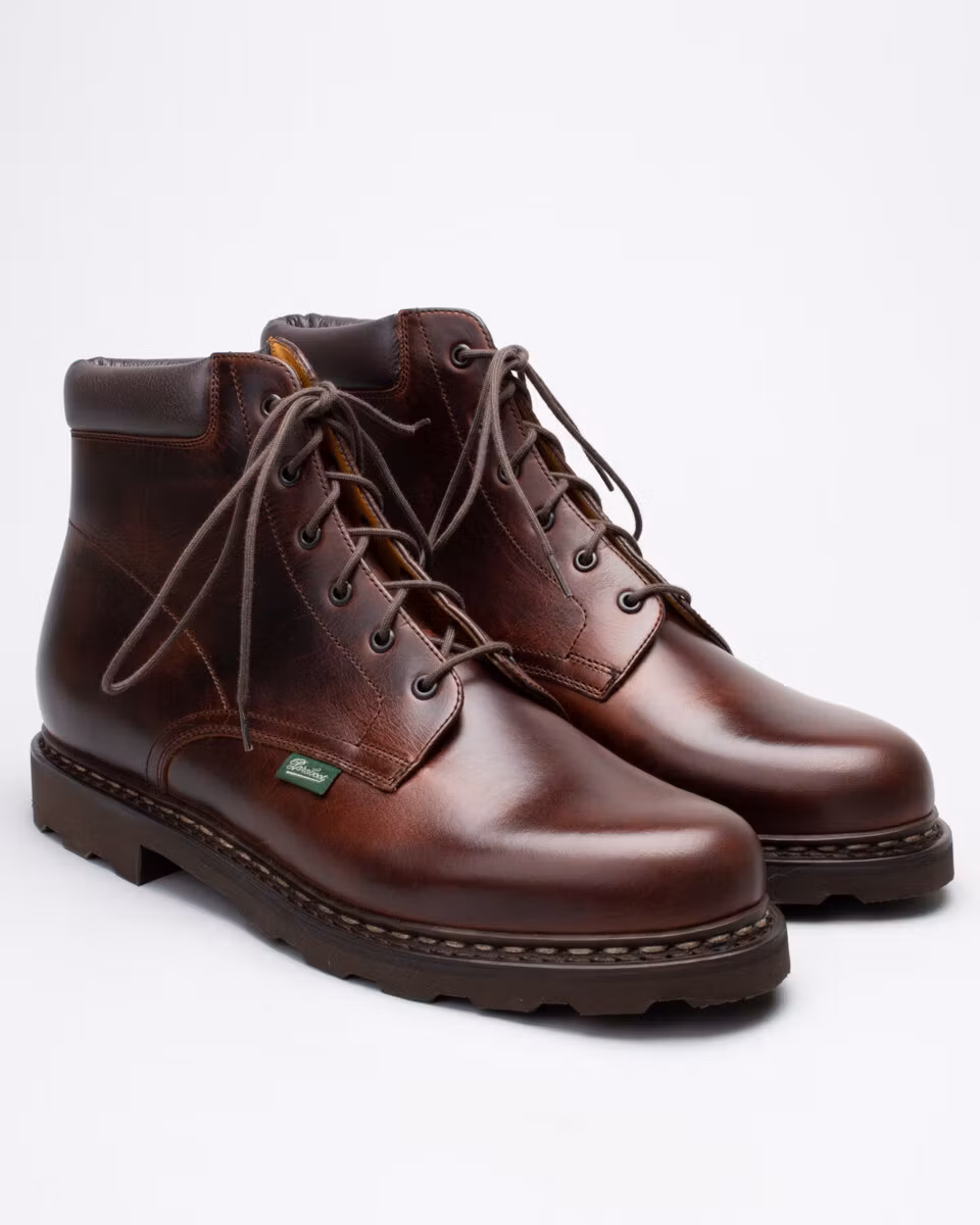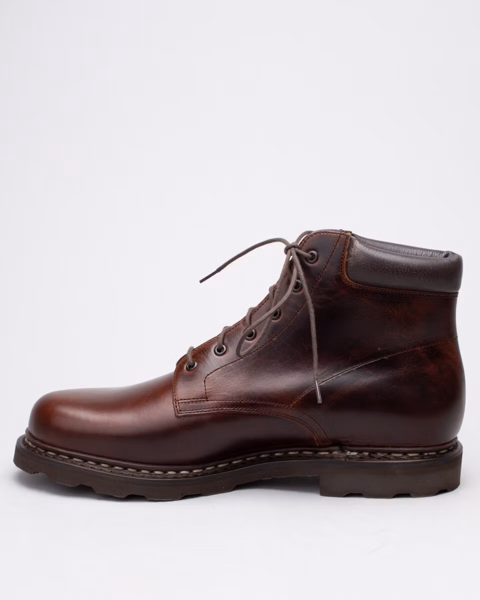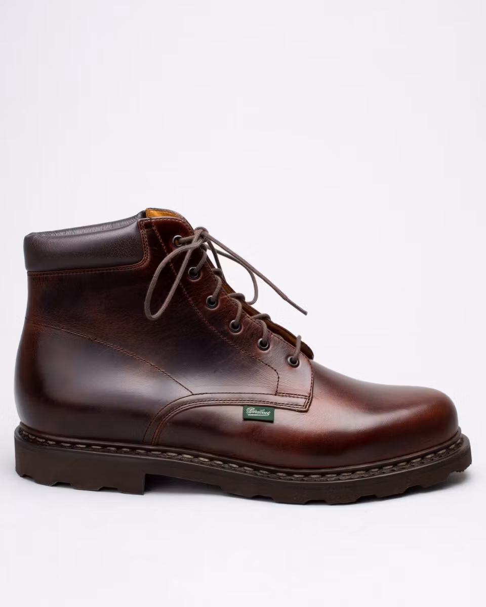 6-inch boot from Paraboot. Upper in dark brown leather. Cushioned collar. Leather insole. Rubber outsole. Full leather lining. Norwegian reversed welted construction. Made in France.