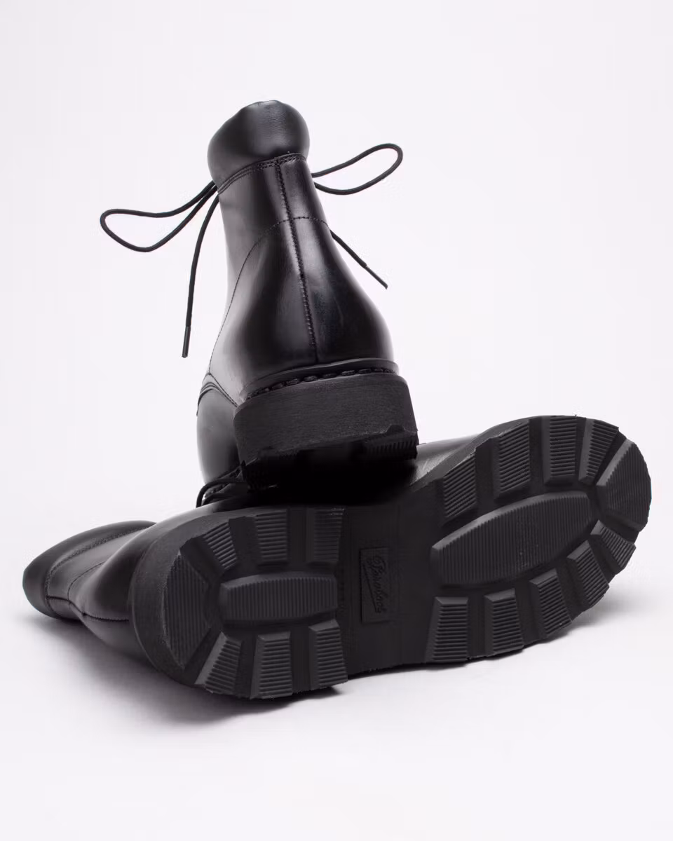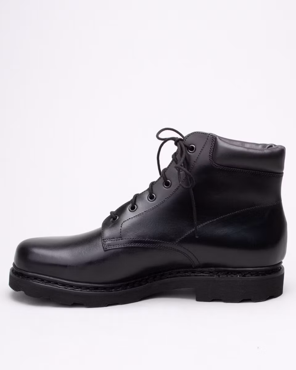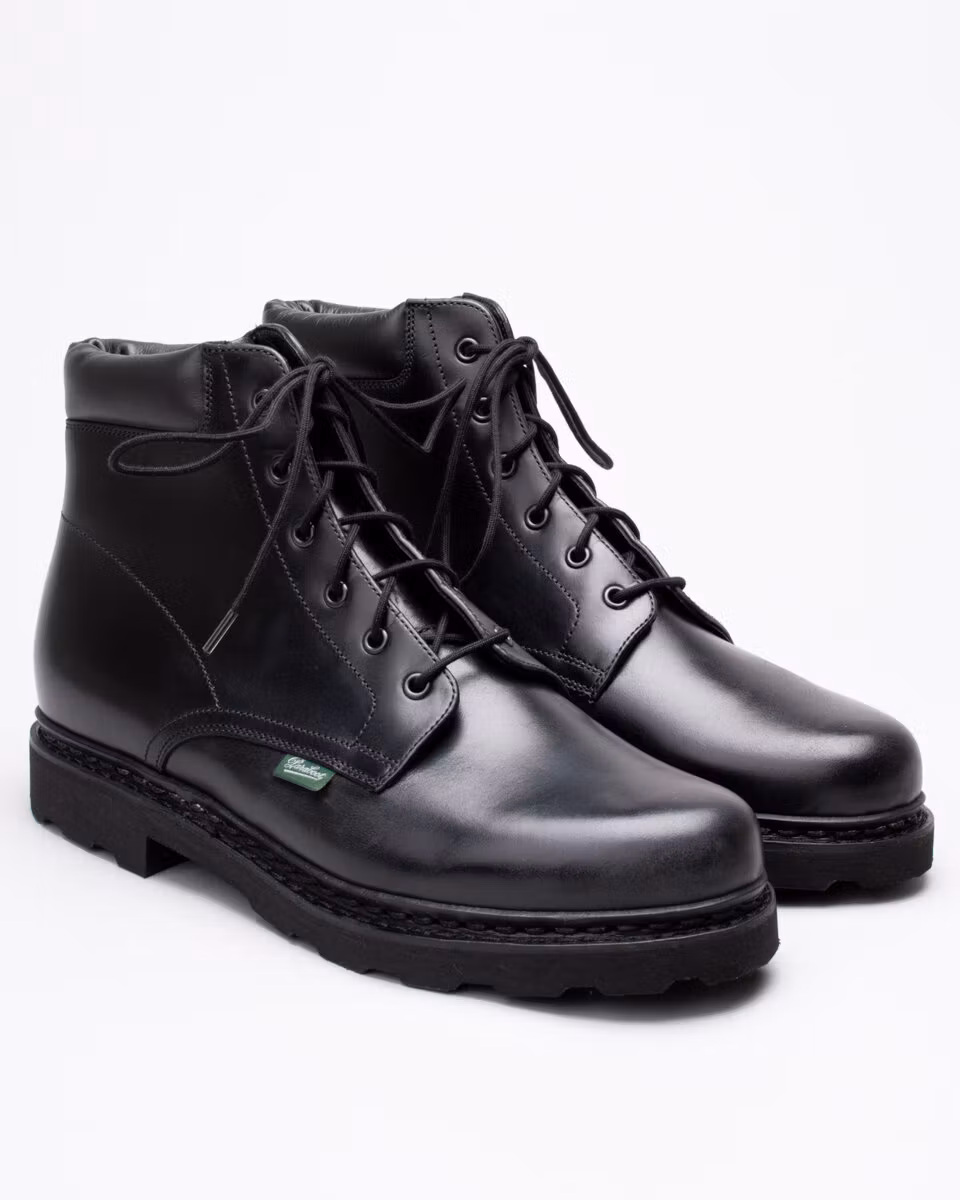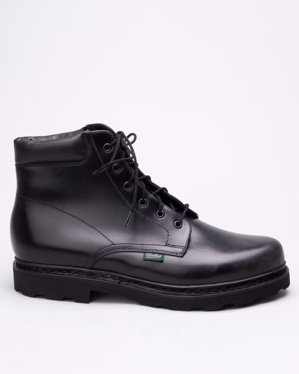 6-inch boot from Paraboot. Upper in black leather. Cushioned collar. Leather insole. Rubber outsole. Full leather lining. Norwegian reversed welted construction. Made in France.