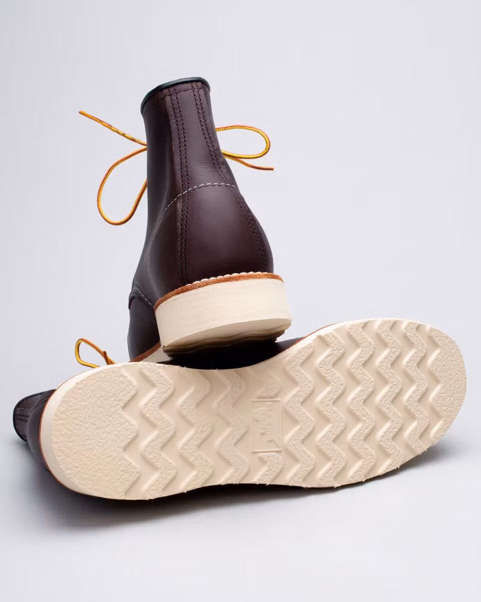 Red Wing Shoes classic work moc in dark reddish brown Excalibur leather from SB Foot Tannery. Leather lined, leather insole, metal eyelets. White wedge traction tred sole. Goodyear welt construction. Triple stitched quality. Taslan laces. Normal width (D). Made in Red Wing, MN, USA.