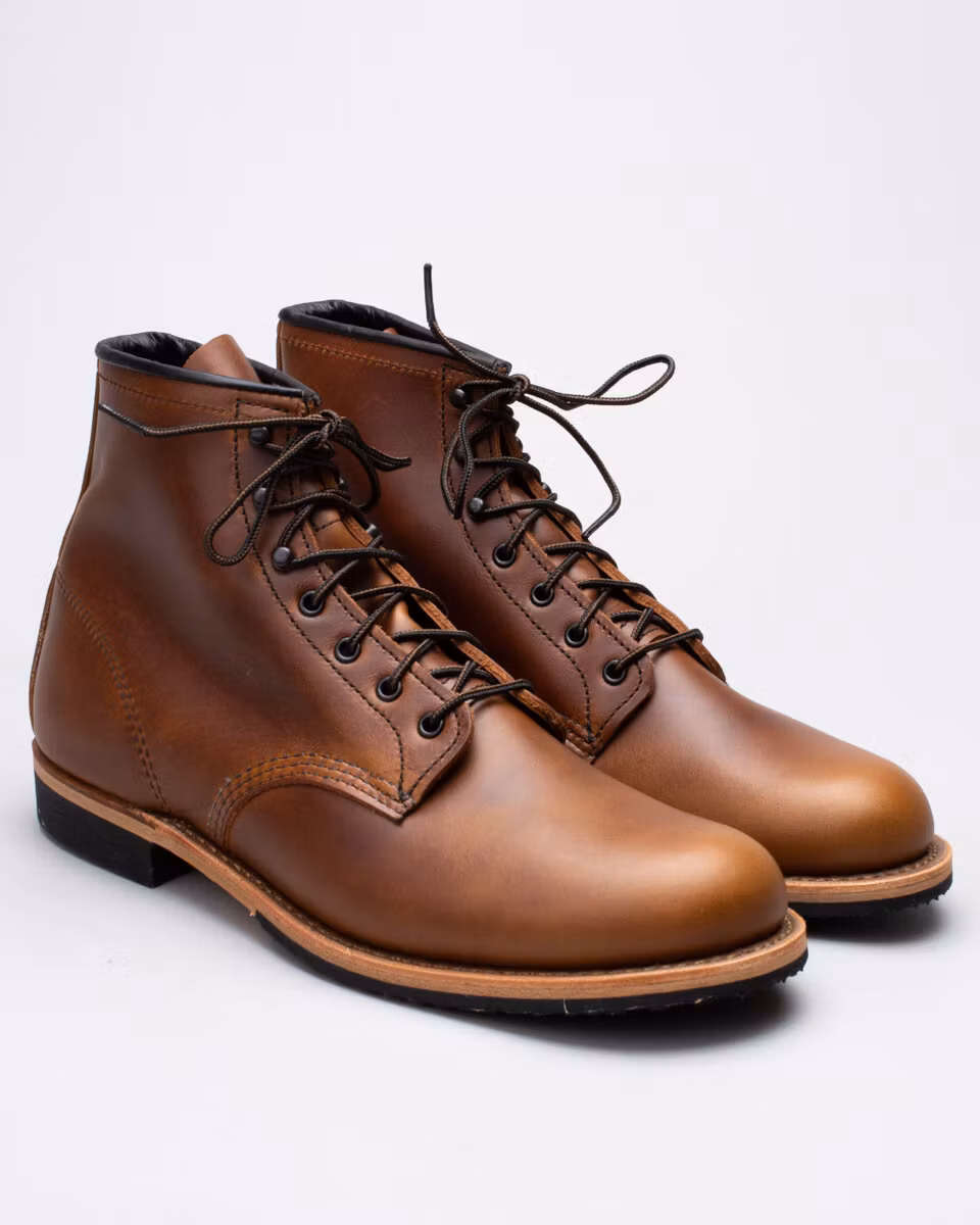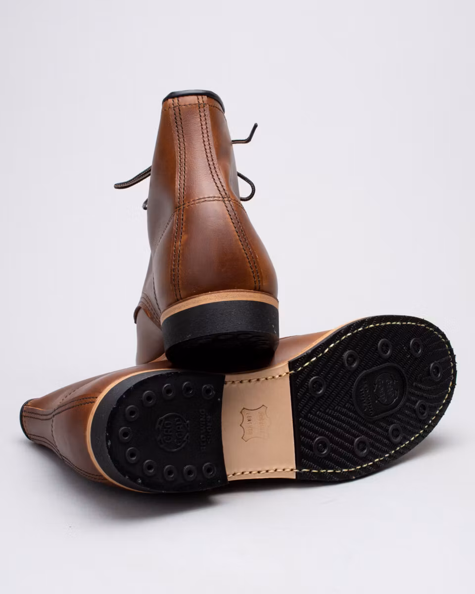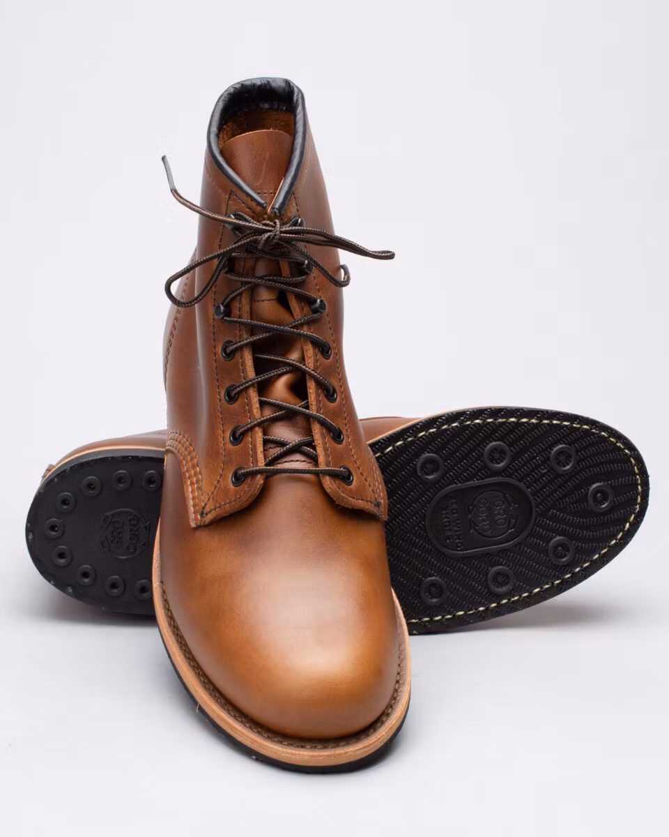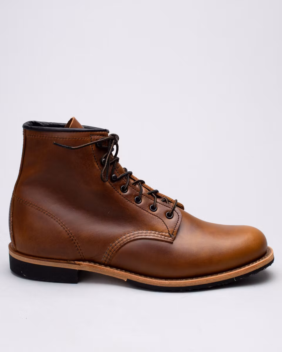 The Beckman is a dressed boot named after the founder of Red Wing Shoes Co, Charles Beckman. Upper in brown Excalibur Leather from S.B Foot Tannery. Leather-lined toe box, unlined shaft. Leather insole. Leather outsole with Gro Cord rubber surfaces. Goodyear welt construction. Handcrafted in Red Wing, MN. Normal last, D.