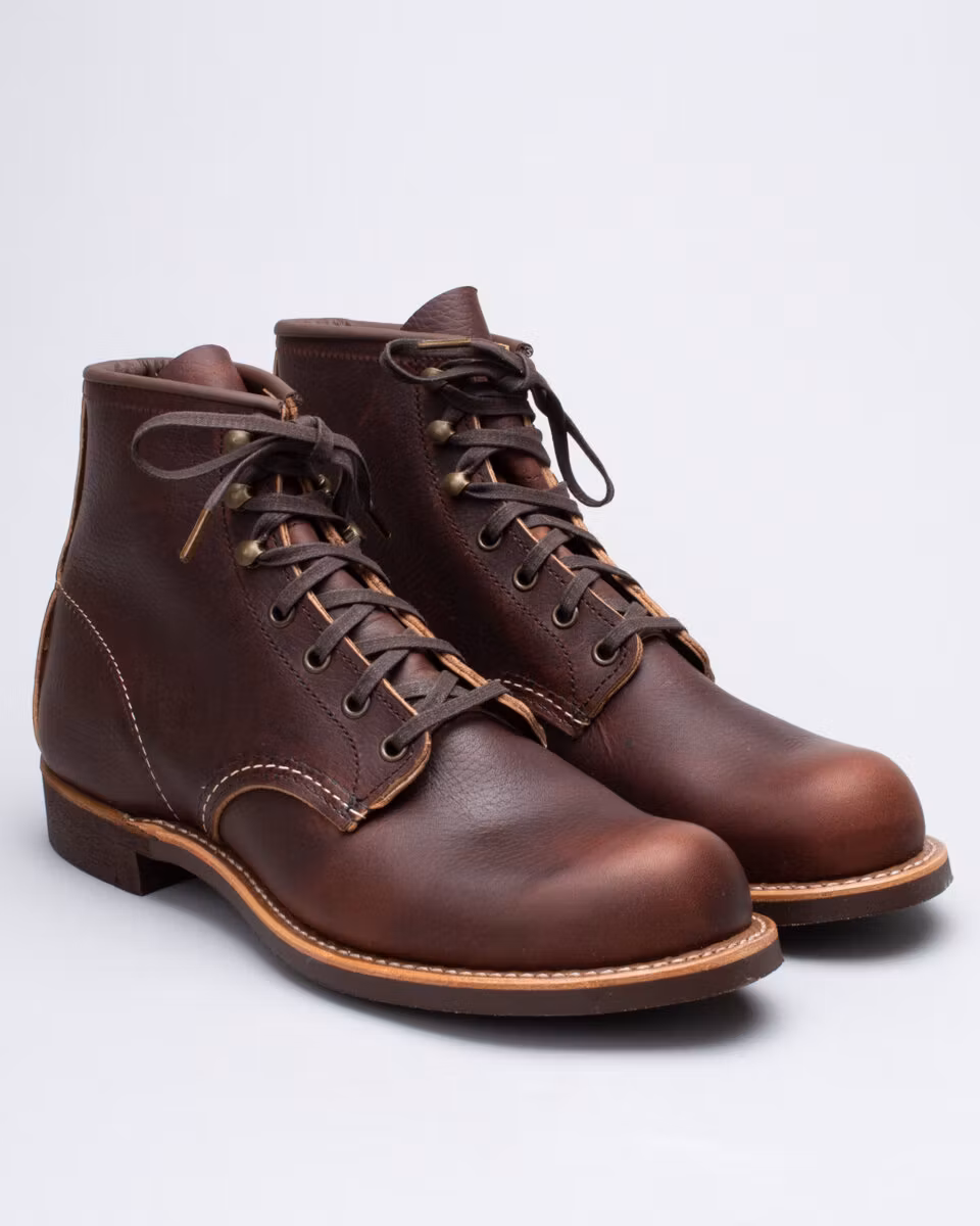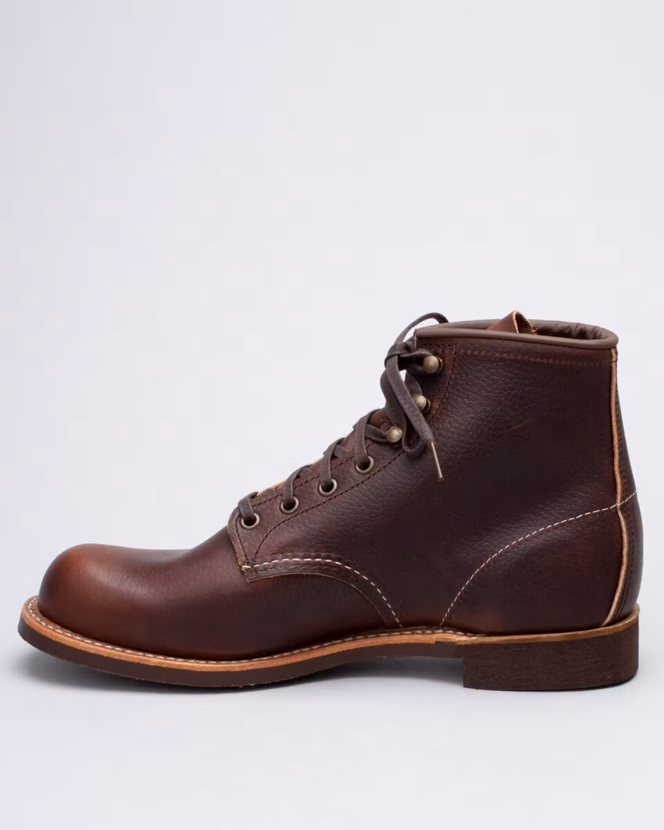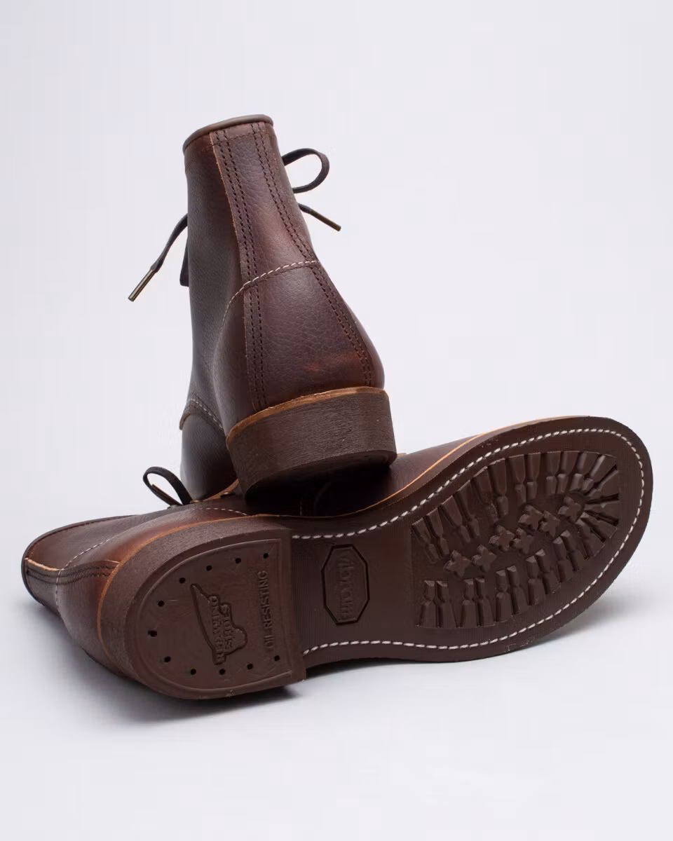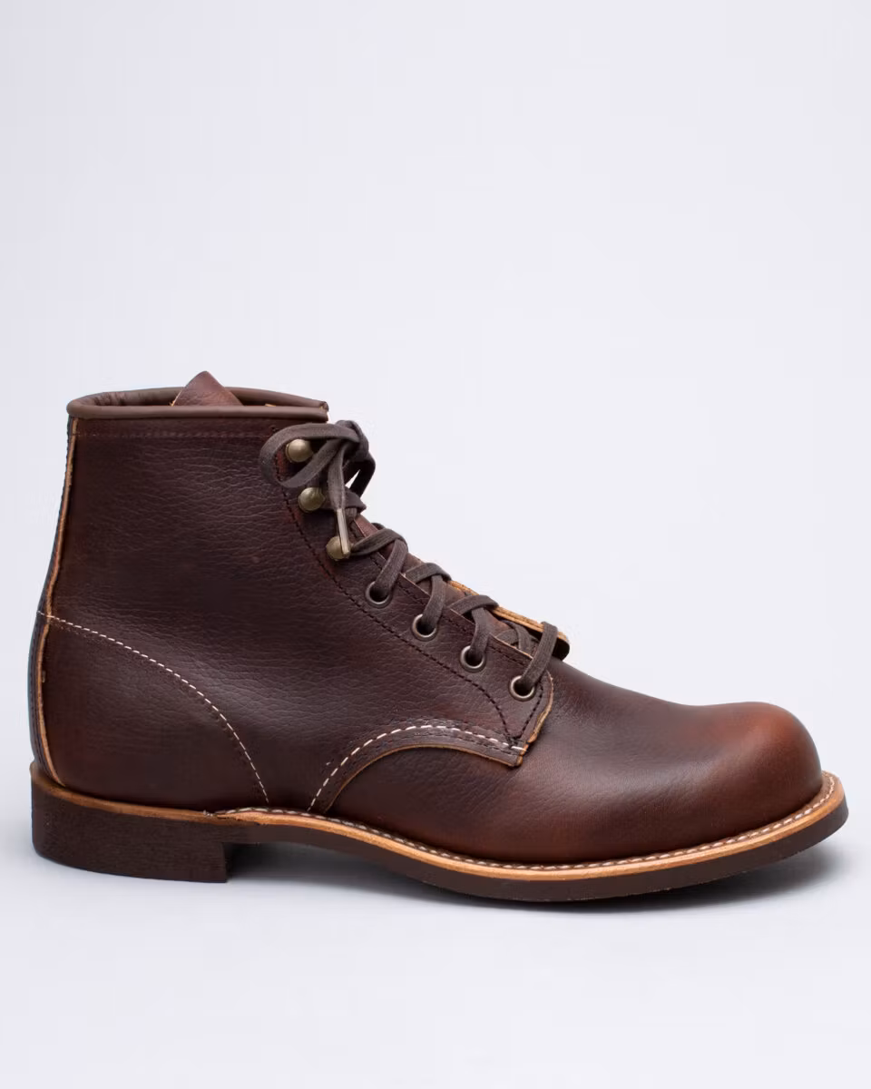 Red Wing's Blacksmith is built on the same last as the classic Iron Ranger. Unlined upper in oiled, dark brown, full grain leather from SB Foot Tannery in Minnesota. Leather insole. Vibram 430 Mini-lug rubber outsole. Goodyear welted construction. Waxed cotton laces. Normal width (D). Made in Red Wing, MN, USA.