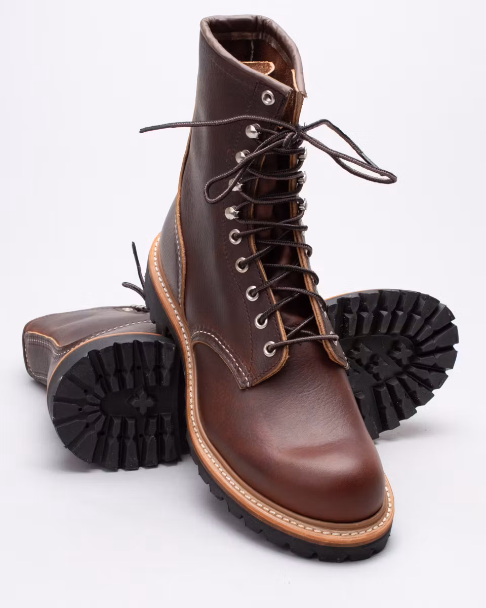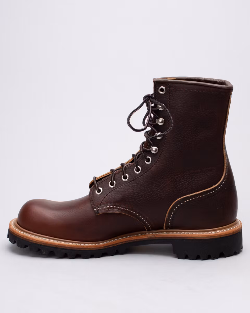Red Wing Shoes Logger Boot is back. A classic 8-inch boot in brown full-grain leather. Unlined upper. Leather insole. Vibram® Montagna, heavily patterned rubber outsole. Goodyear welt construction with storm welt. Standard last, D width. Made in Red Wing, USA.