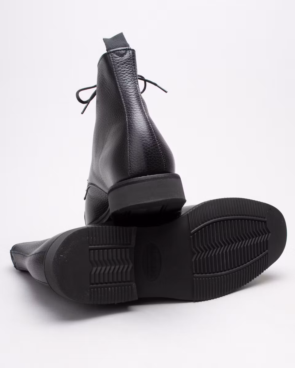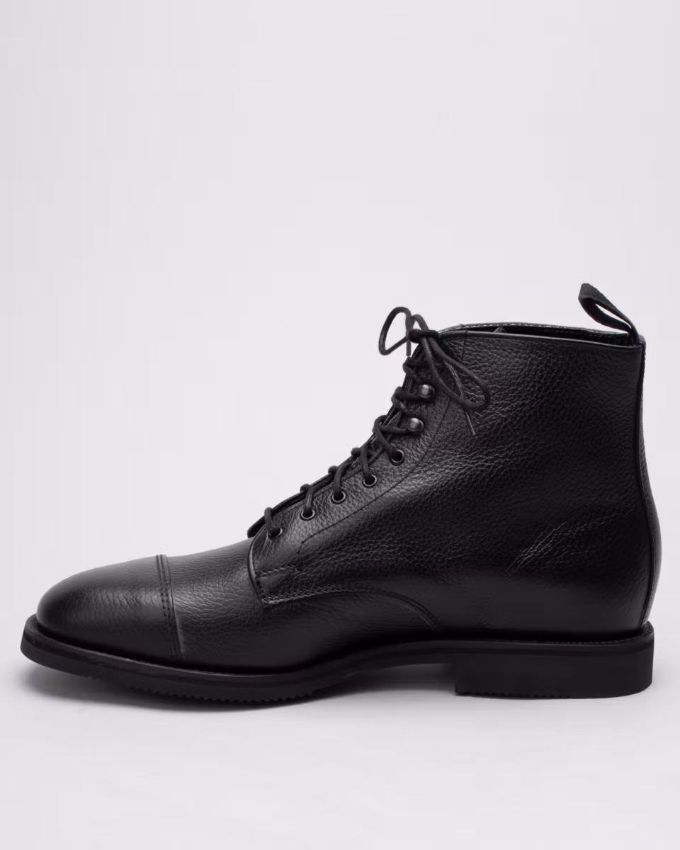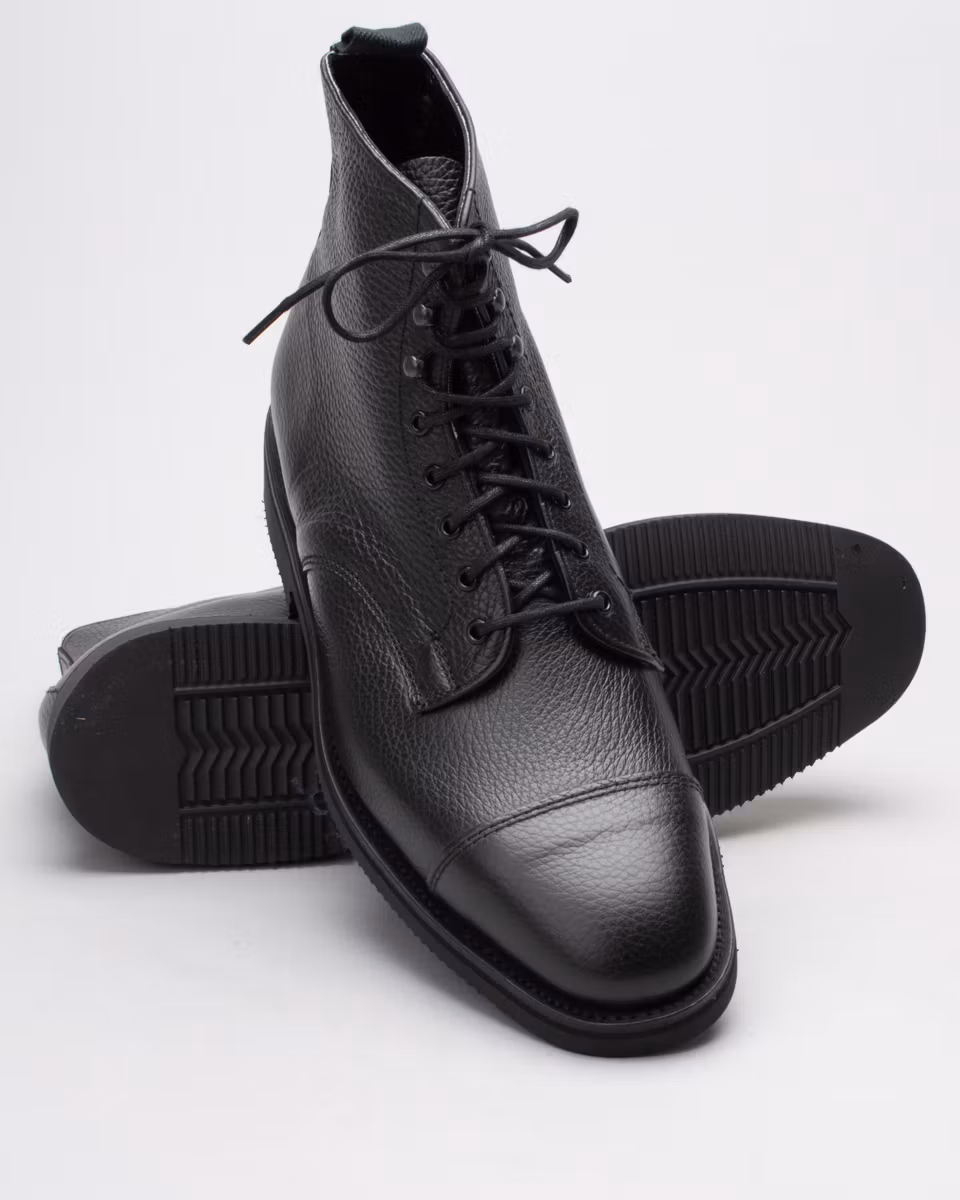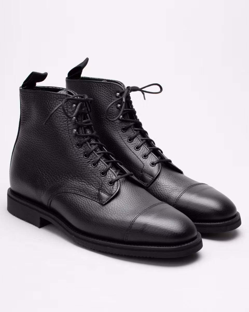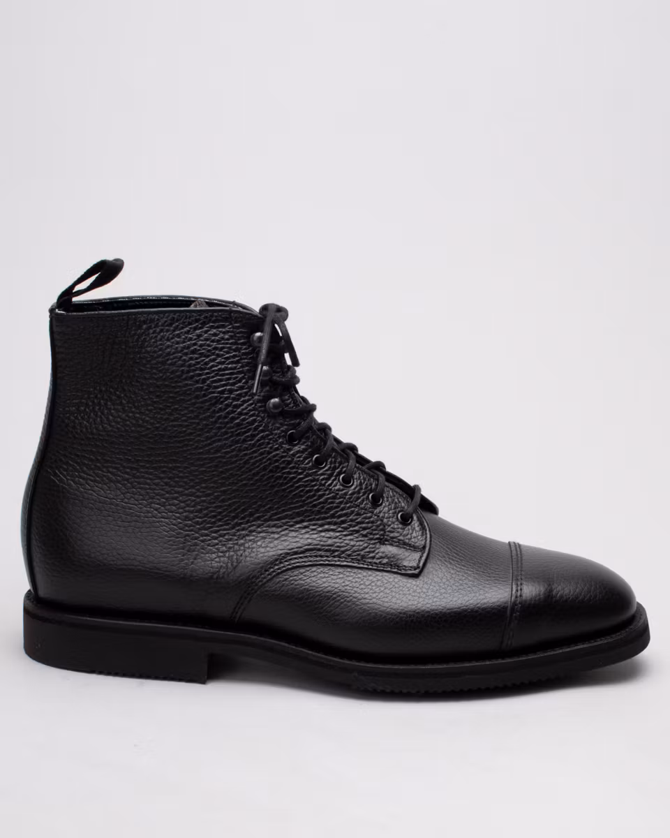 6-inch cap-toe derby boot from Sanders. Upper in black full-grain leather. Fully leather-lined. Leather insole. Lightweight rubber outsole. Textile pull loops. Goodyear-welted construction. Made in England. Standard width last, F.