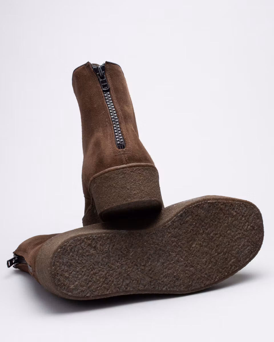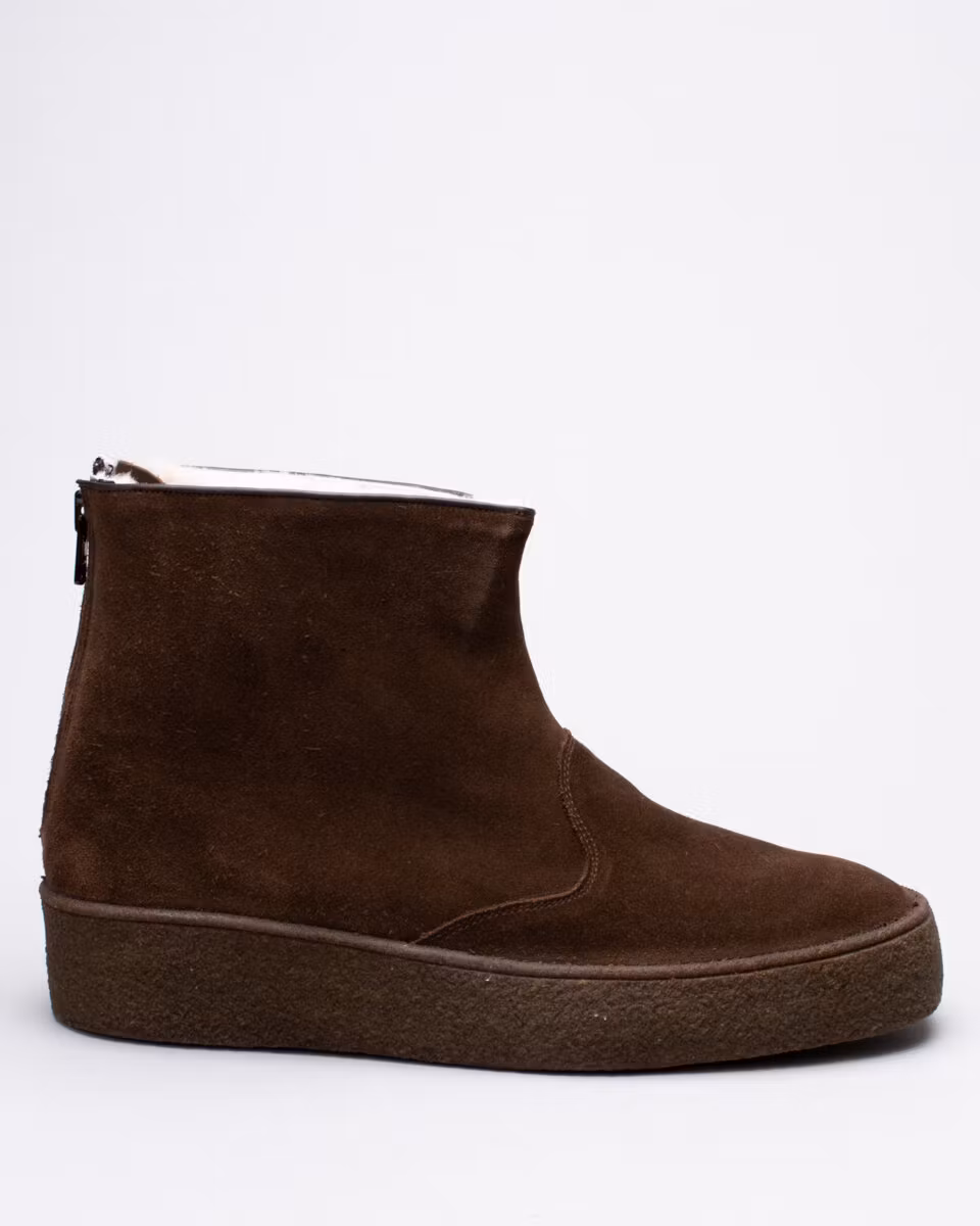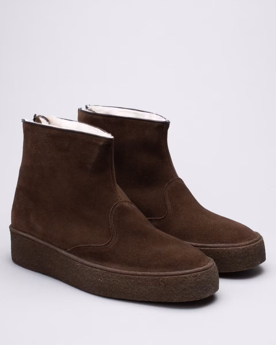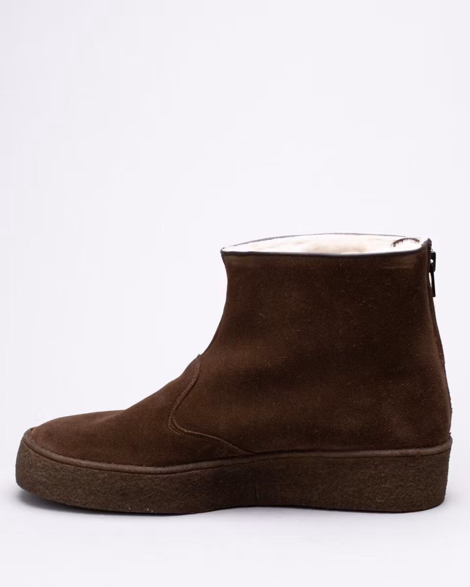 The original curling boot is produced by British Sanders. Upper in chocolate suede from C.F. Stead Tannery. Full shearling lining. Shearling insole. Crepe rubber outsole. Recraftable. Made in England.