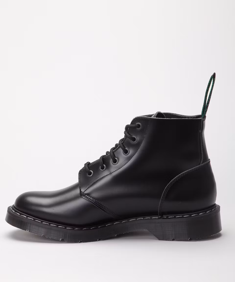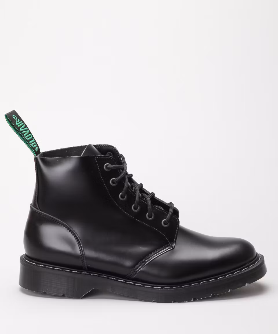 Classic British 6 eye boot from Solovair. Upper in black polished leather. Leather and textile lining. Leather insole. Air cushioned rubber outsoles for maximum comfort. Goodyear welted construction. Made in England. Normal width, F.
