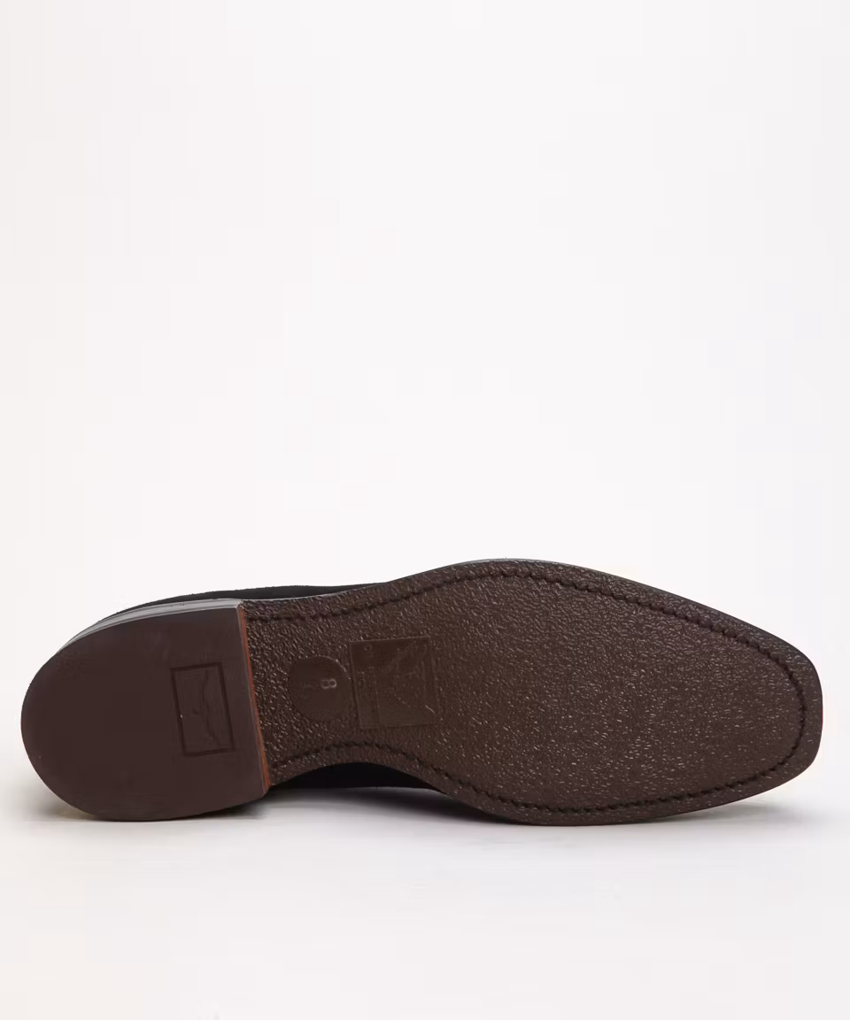 Black suede upper. Full calf skin lining. Leather insoles. Rubber outsoles. Goodyear welted construction. Normal width. Hand made in Australia.