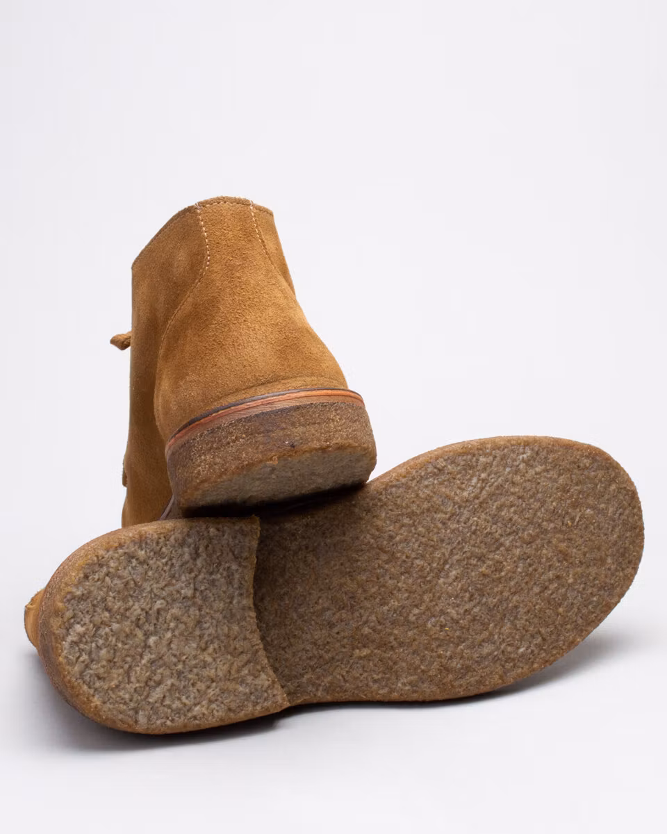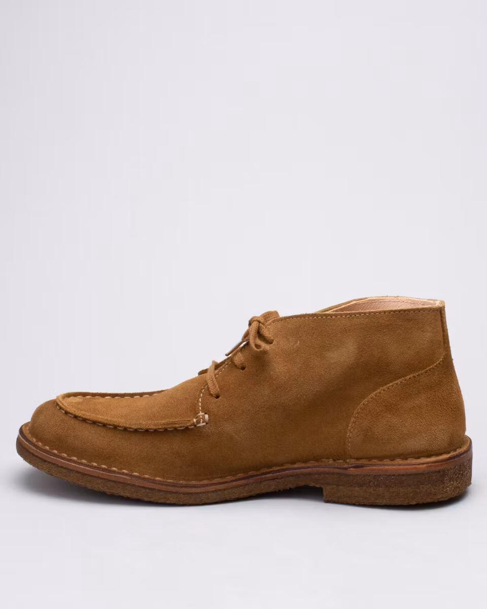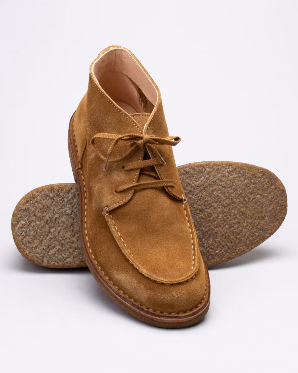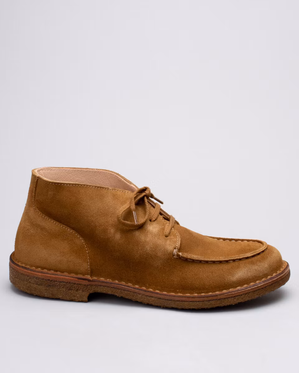 Chukka with moccasin toe. Upper in whiskey suede. Full leather lining. Detachable, leather lined, insole. Crepe rubber outsole. Stitch down construction. Handcrafted in Italy.