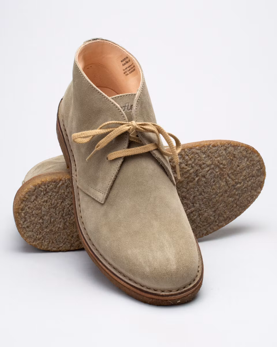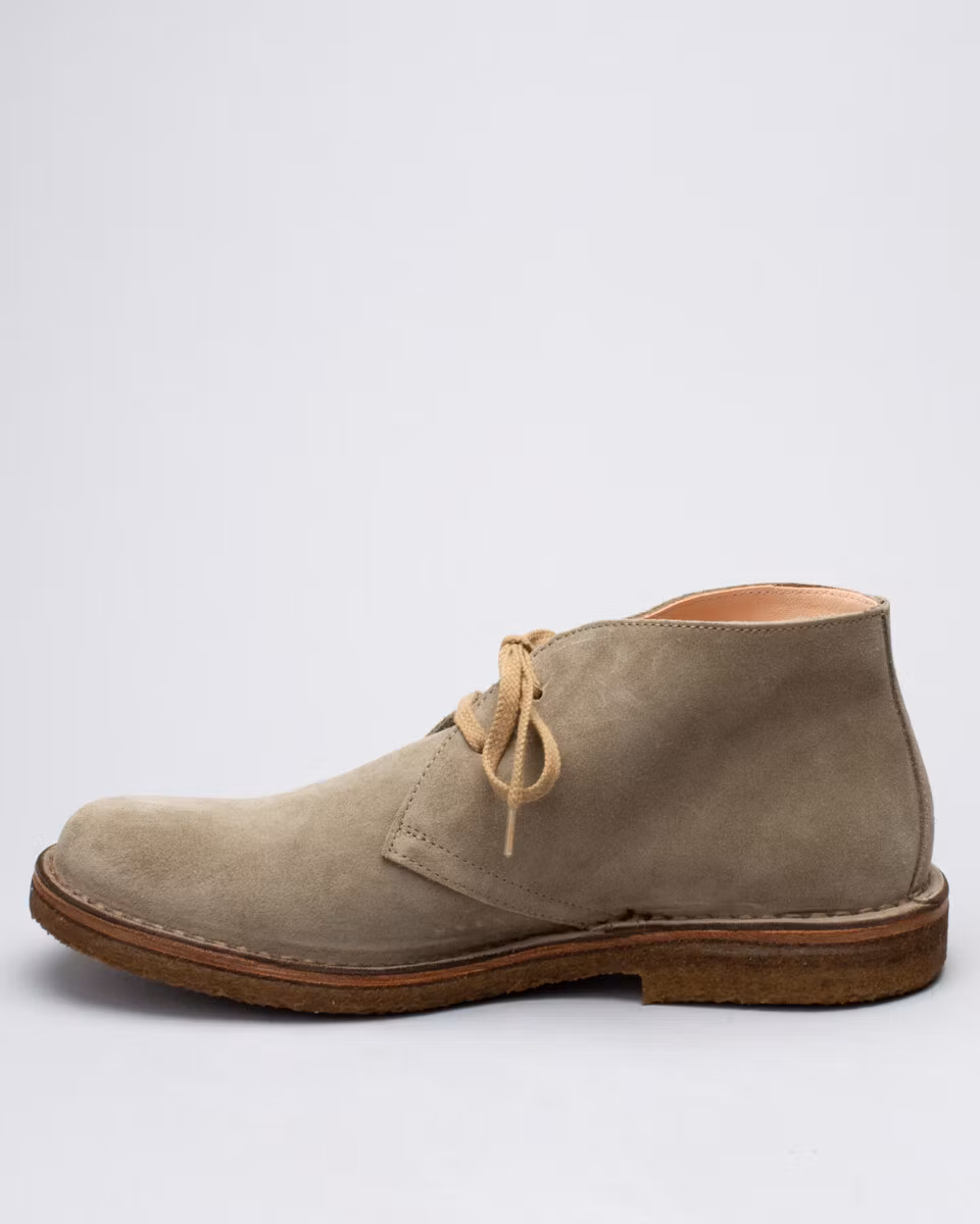 Chukka with plain toe. Upper in grey suede. Full leather lining. Detachable, leather lined, insole. Crepe rubber outsole. Stitch down construction. Handcrafted in Italy.
