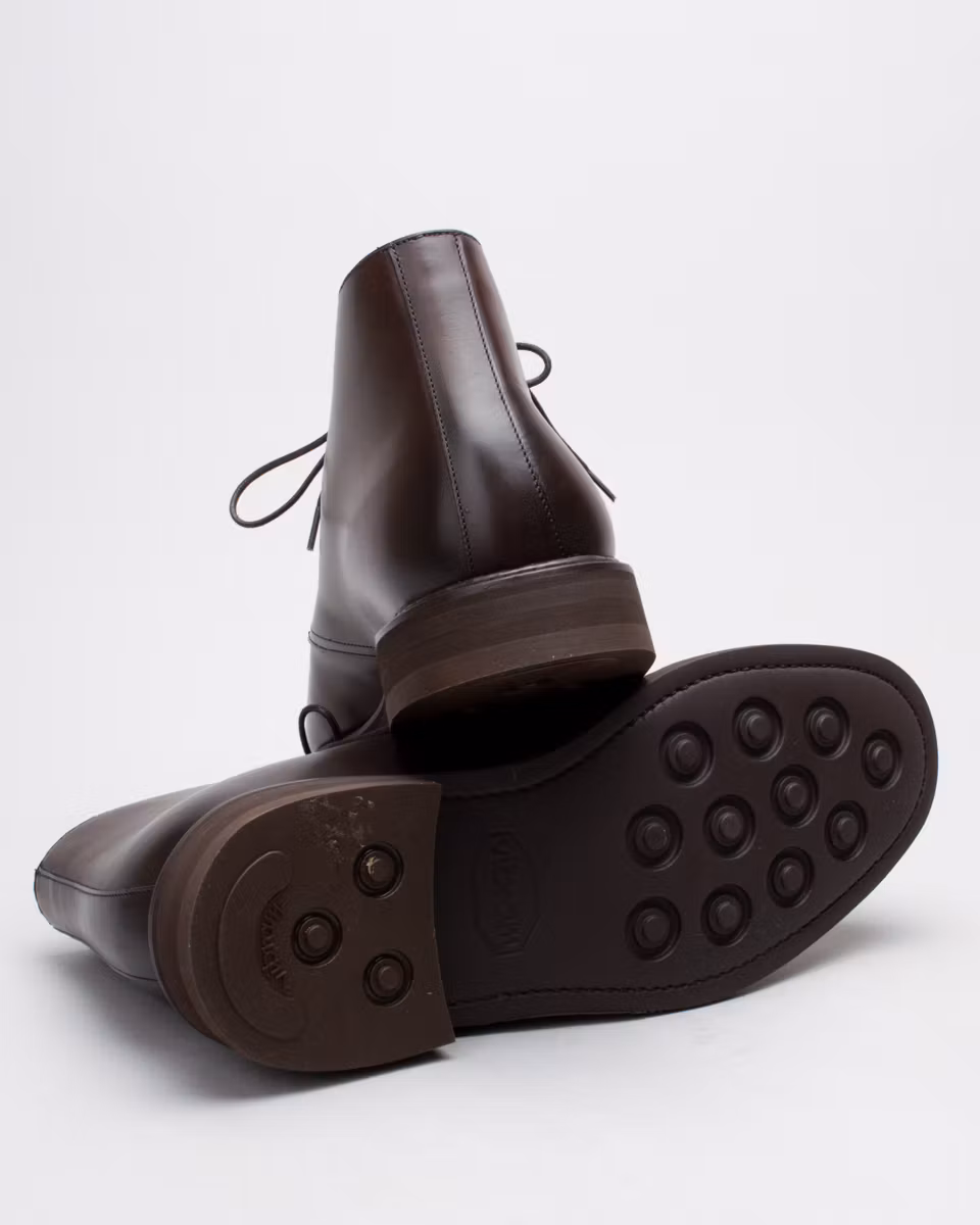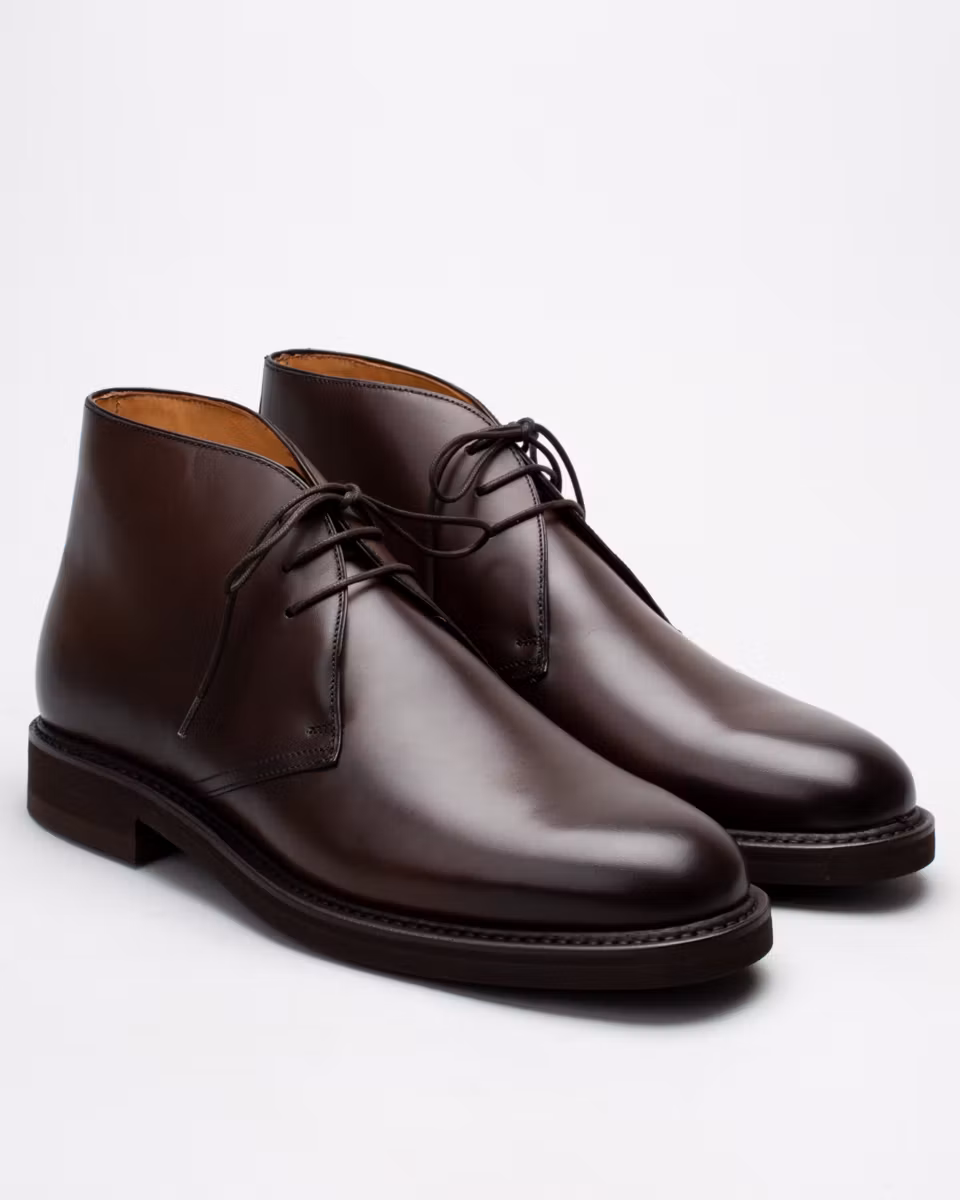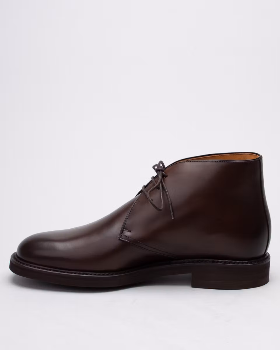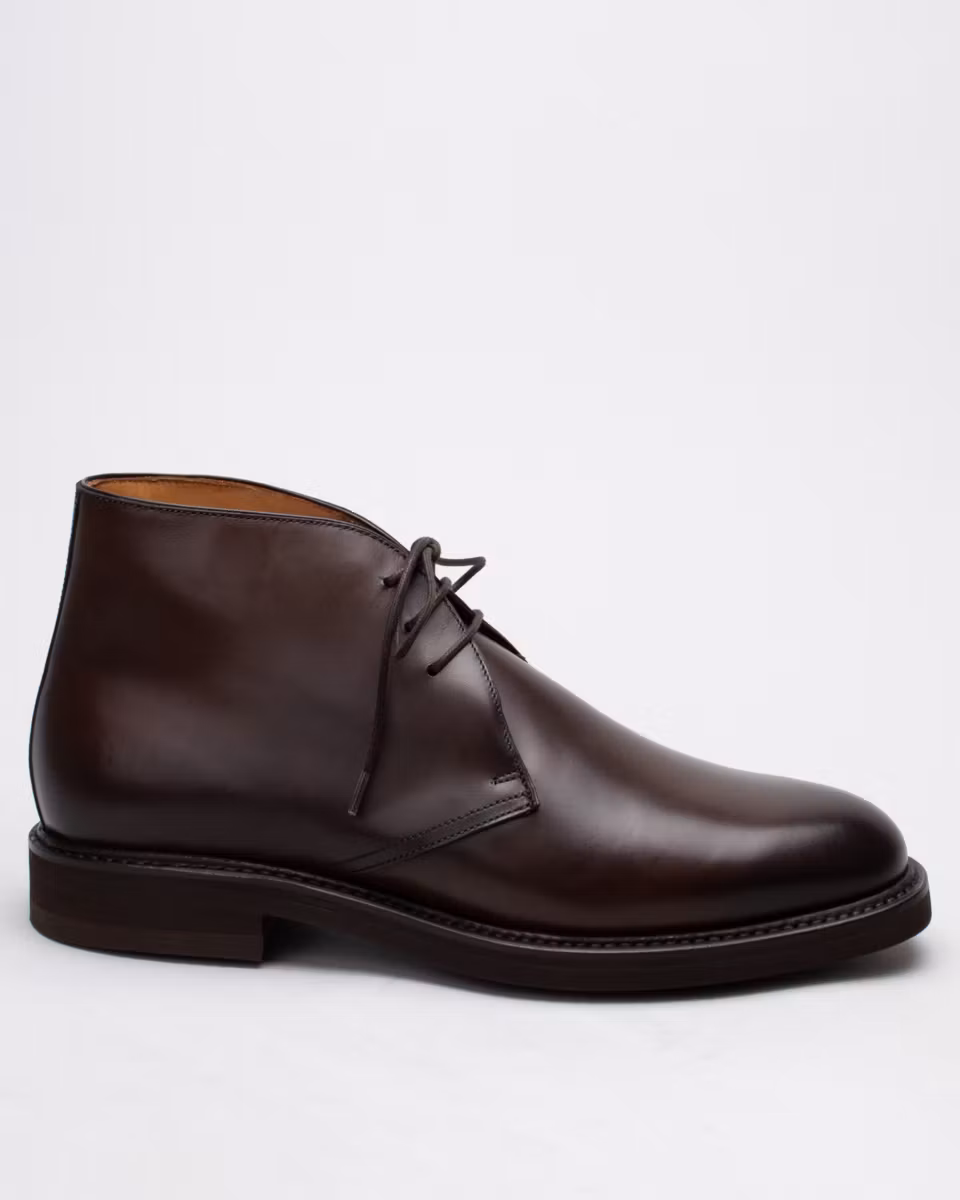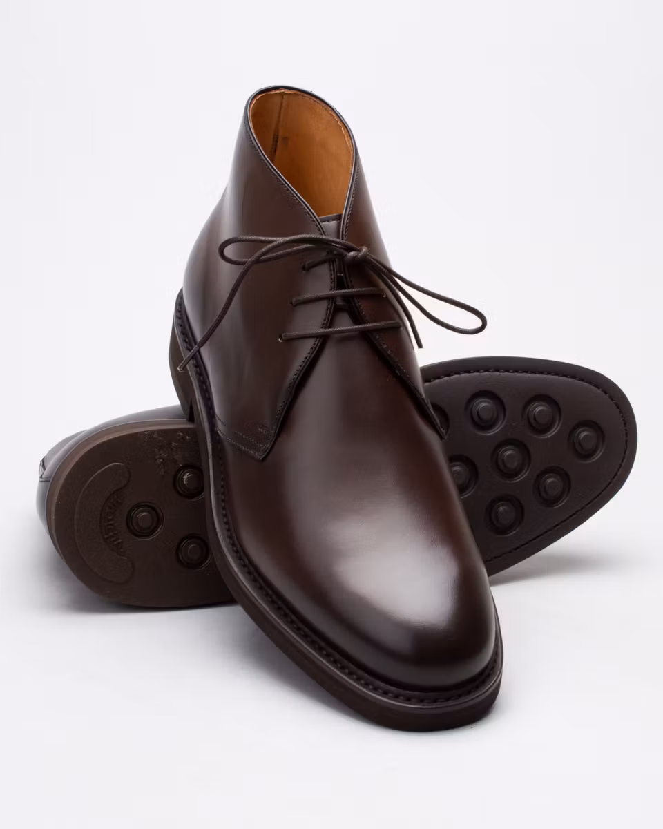 Traditional 3-eye chukka from Berwick. Upper in dark brown calf suede. Full leather lining. Leather insole. Vibram® Eton rubber outsole. Goodyear welted construction with storm welt. Handcrafted in Spain. Last: 234