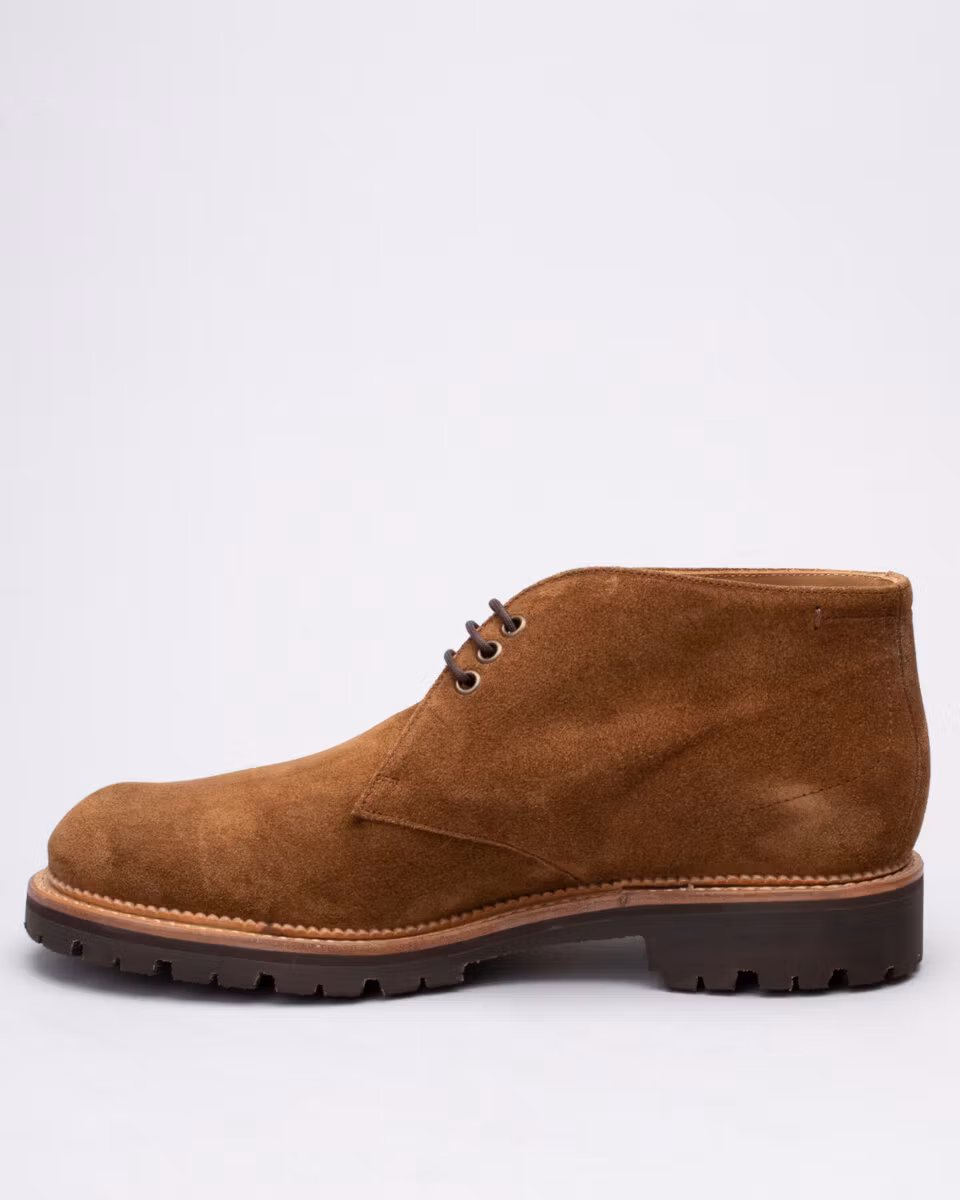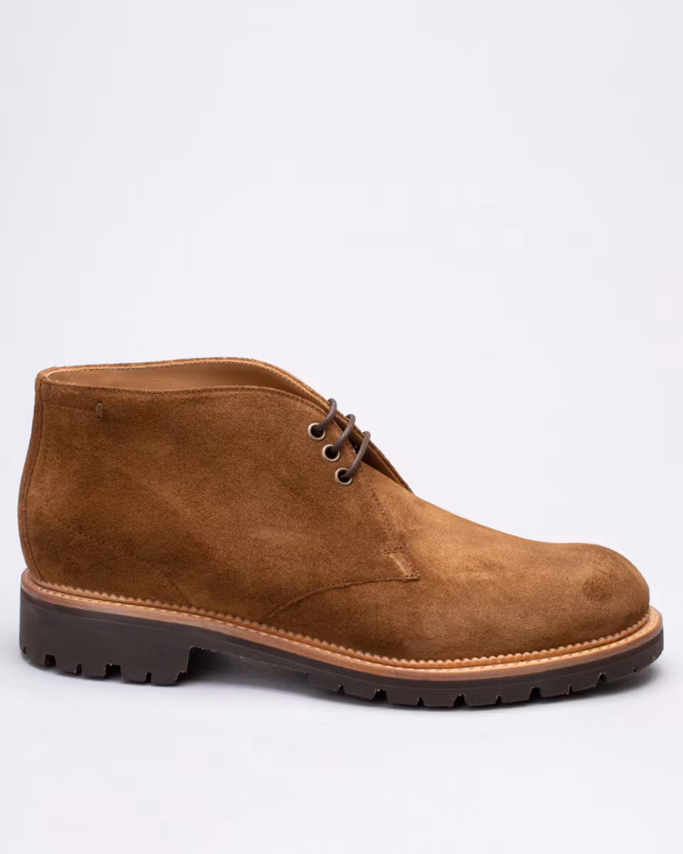 3-eye desert boot from Fiddler. Upper in acacia coloured, high quality, Italian suede. Full leather lining. Leather insole. Vibram® Mister Tank lugged rubber outsole for maximal grip. Cotton and leather laces. Goodyear welted contruction with storm welt. Handcrafted in Spain.