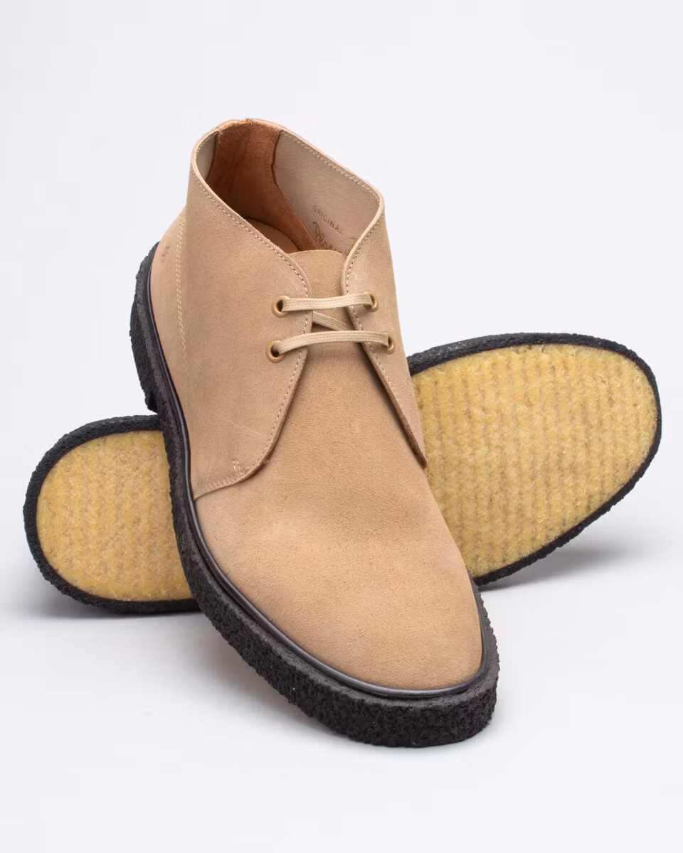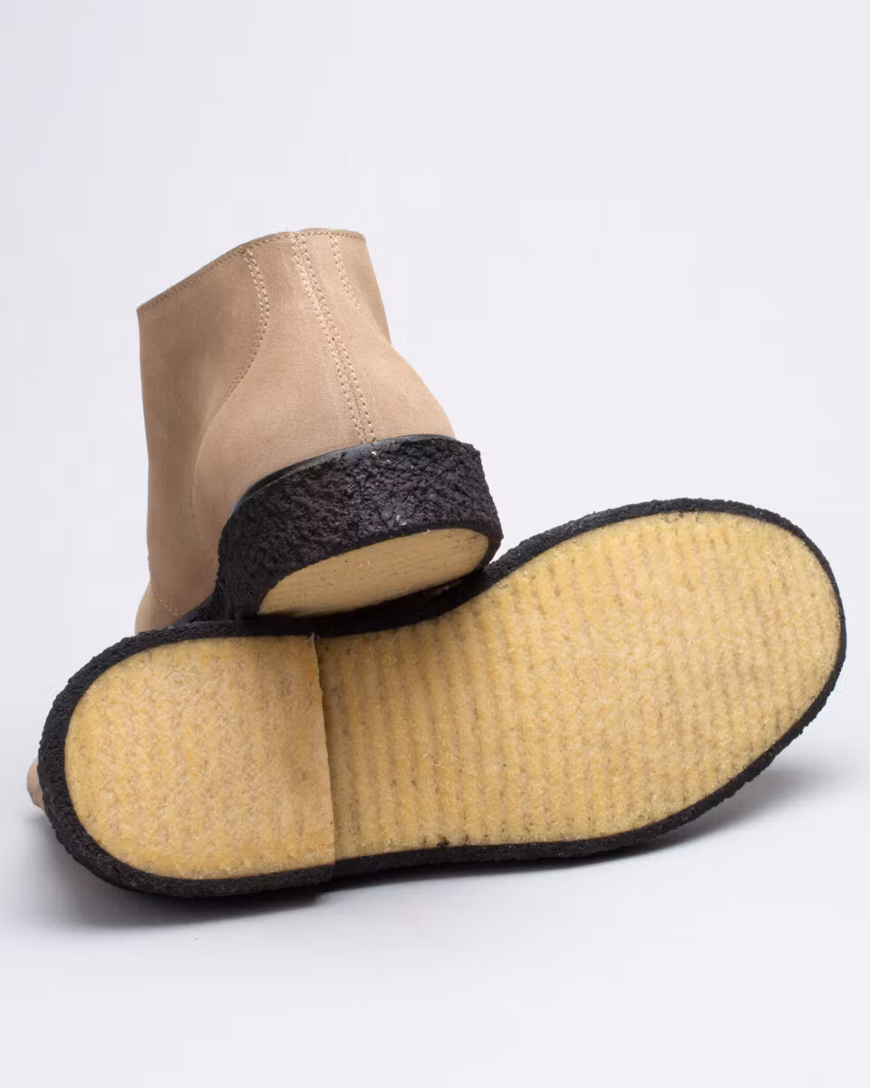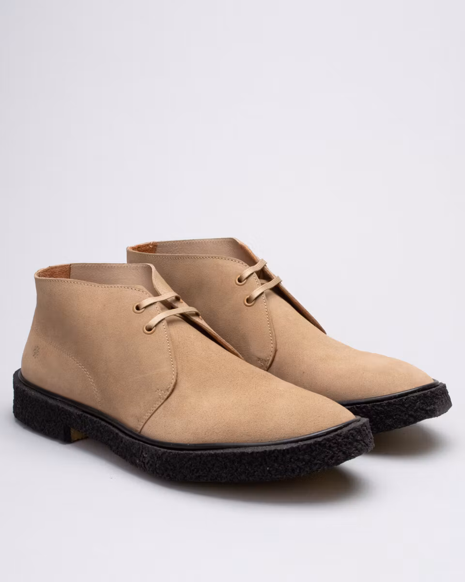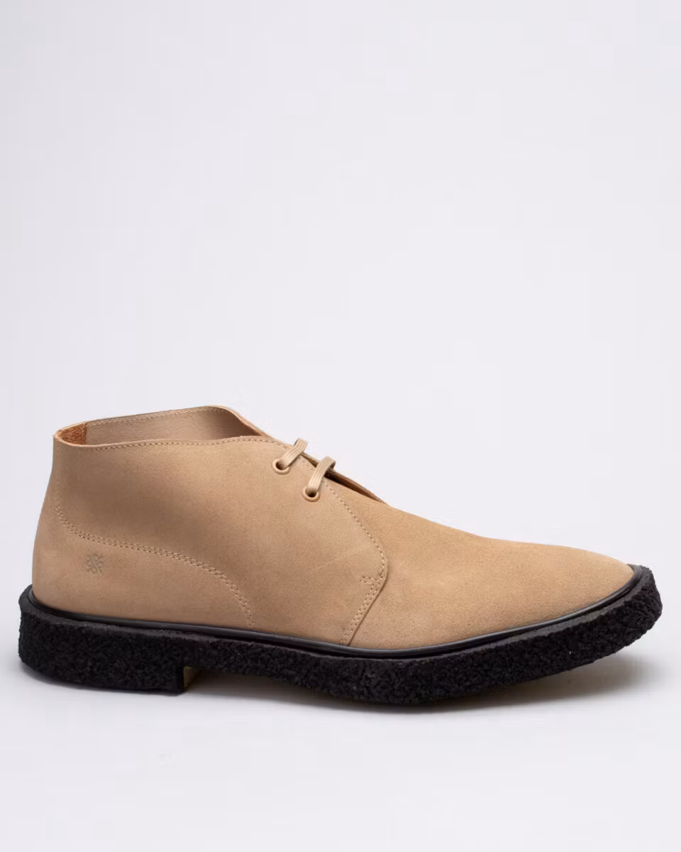 Chukka in sand, rough out, suede. Unlined. Detachable, leather lined, insole. Natural crepe rubber outsole. Made in Portugal.