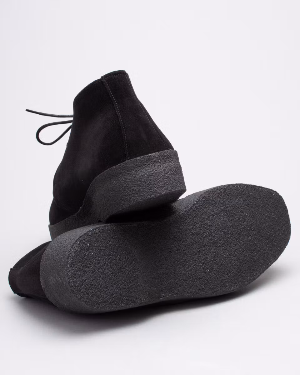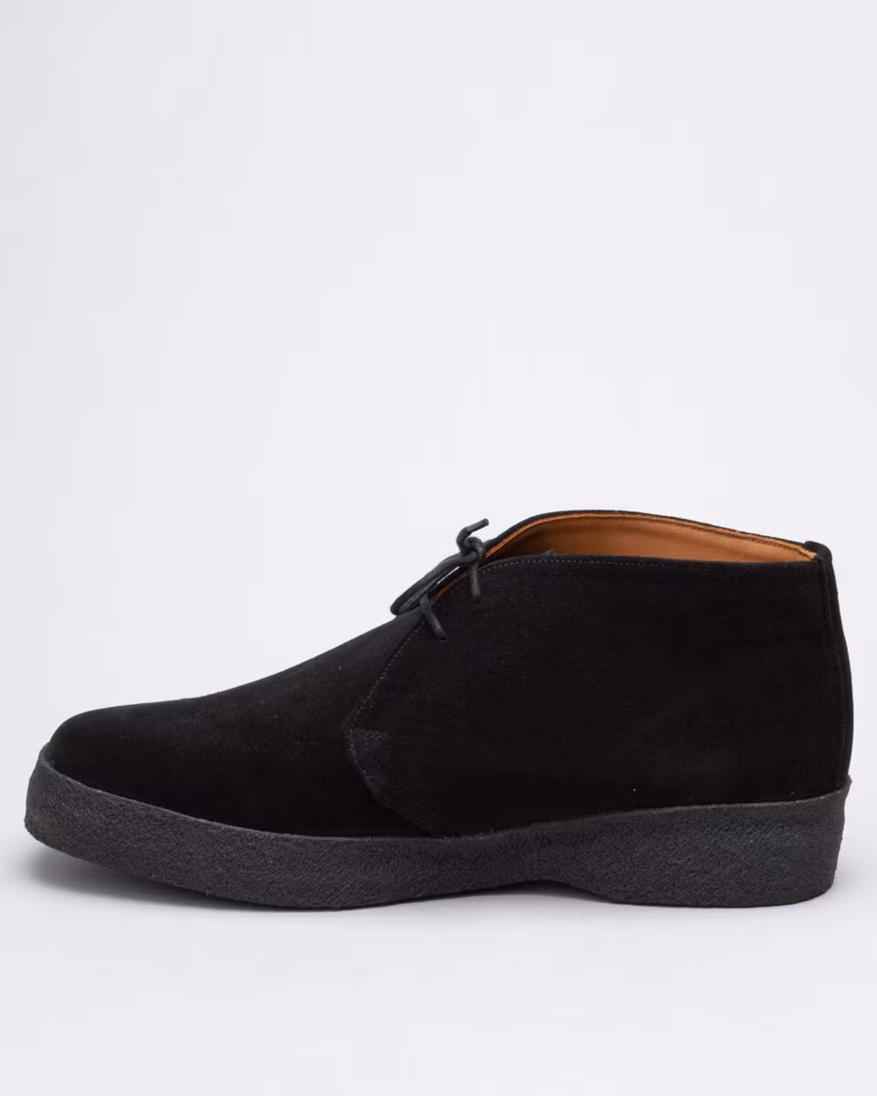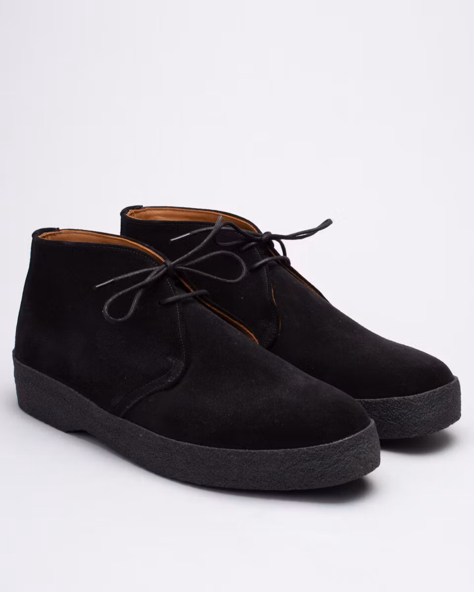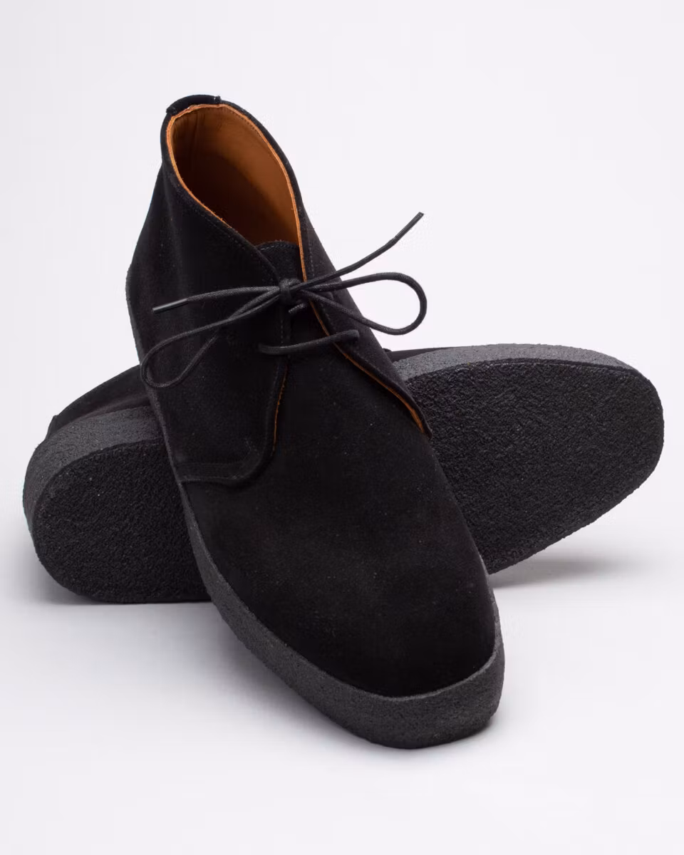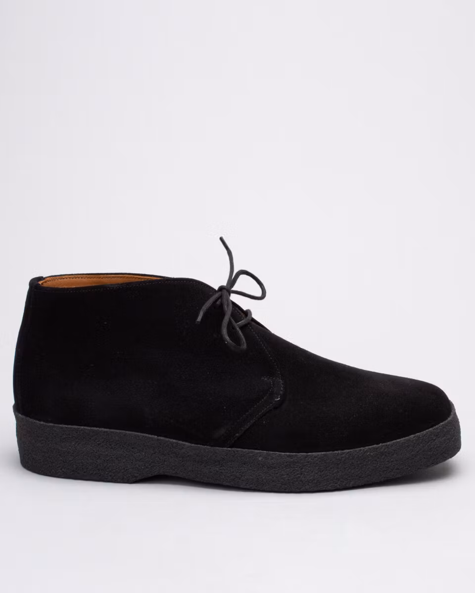 Classic chukka from renowned British shoemakers Sanders & Sanders. Upper in black quality suede. Full leather lining. Leather insole. Natural crepe rubber outsole. Made in England. Normal last, F.