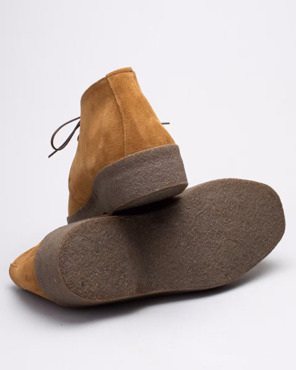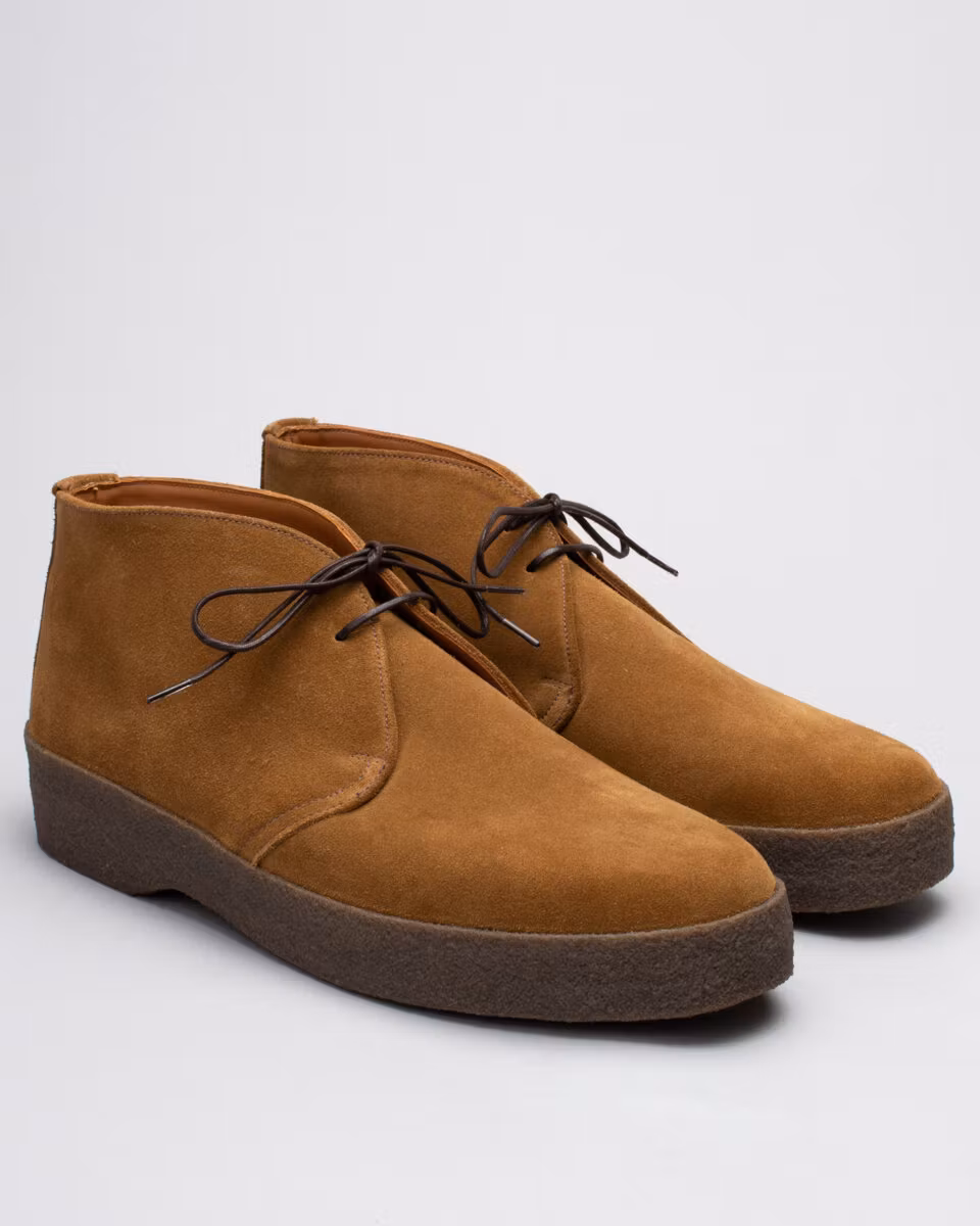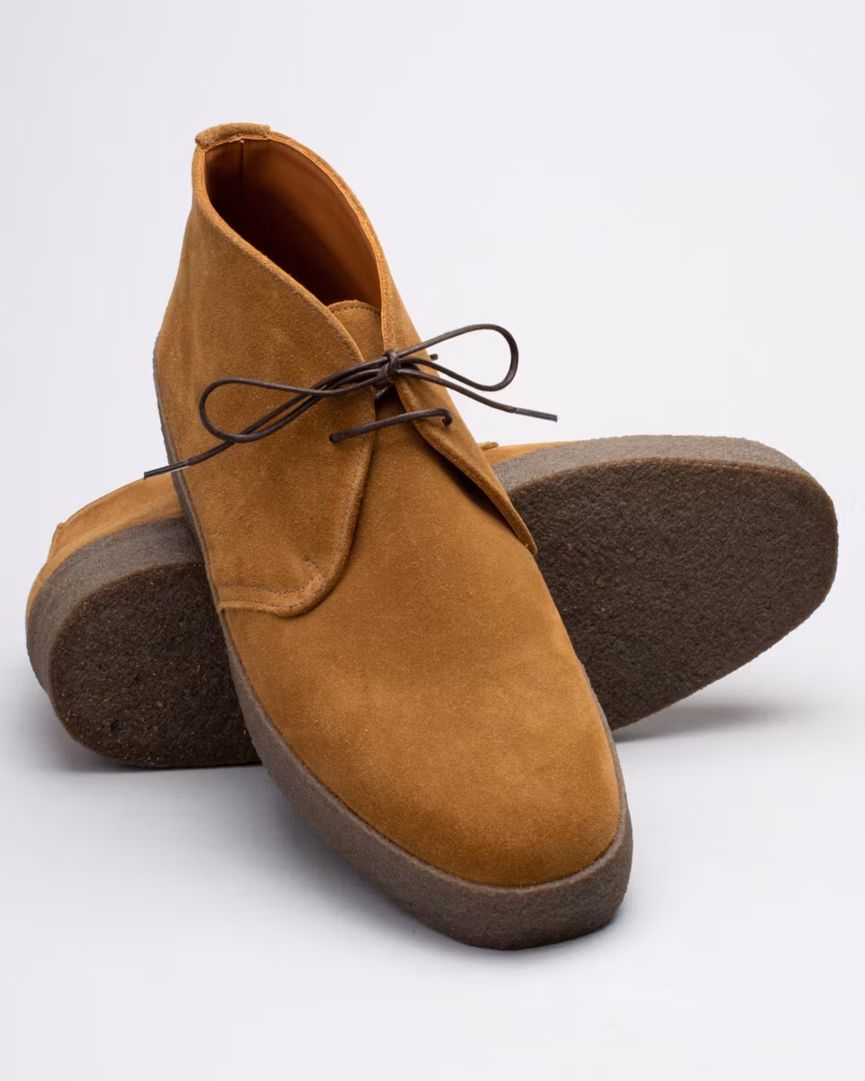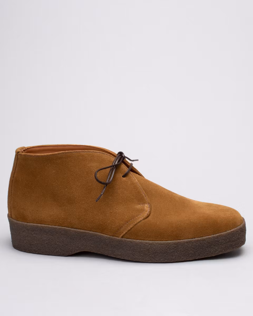 Classic chukka from renowned British shoemakers Sanders & Sanders. Upper in tan suede. Full leather lining. Leather insole. Natural crepe rubber outsole. Made in England. Normal last, F.