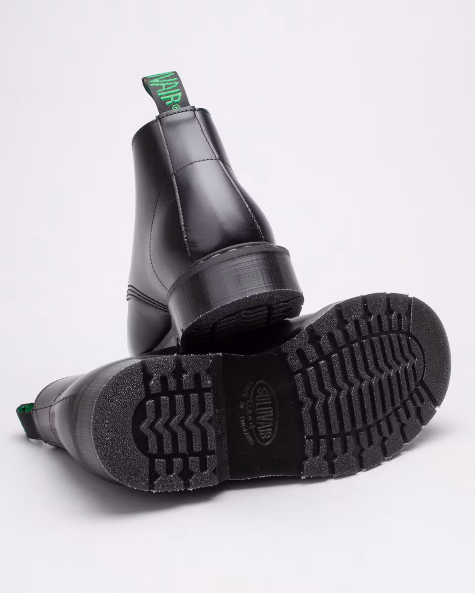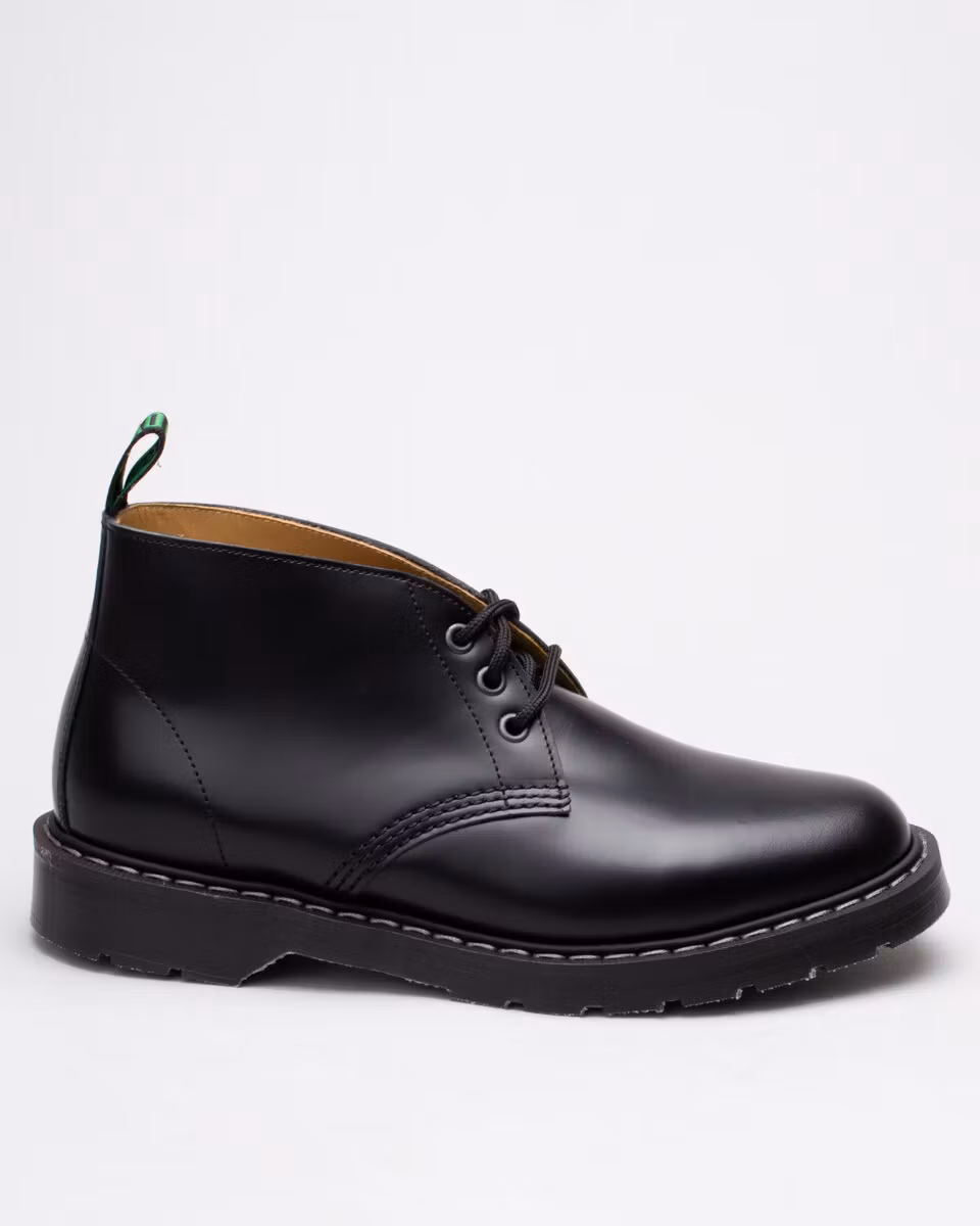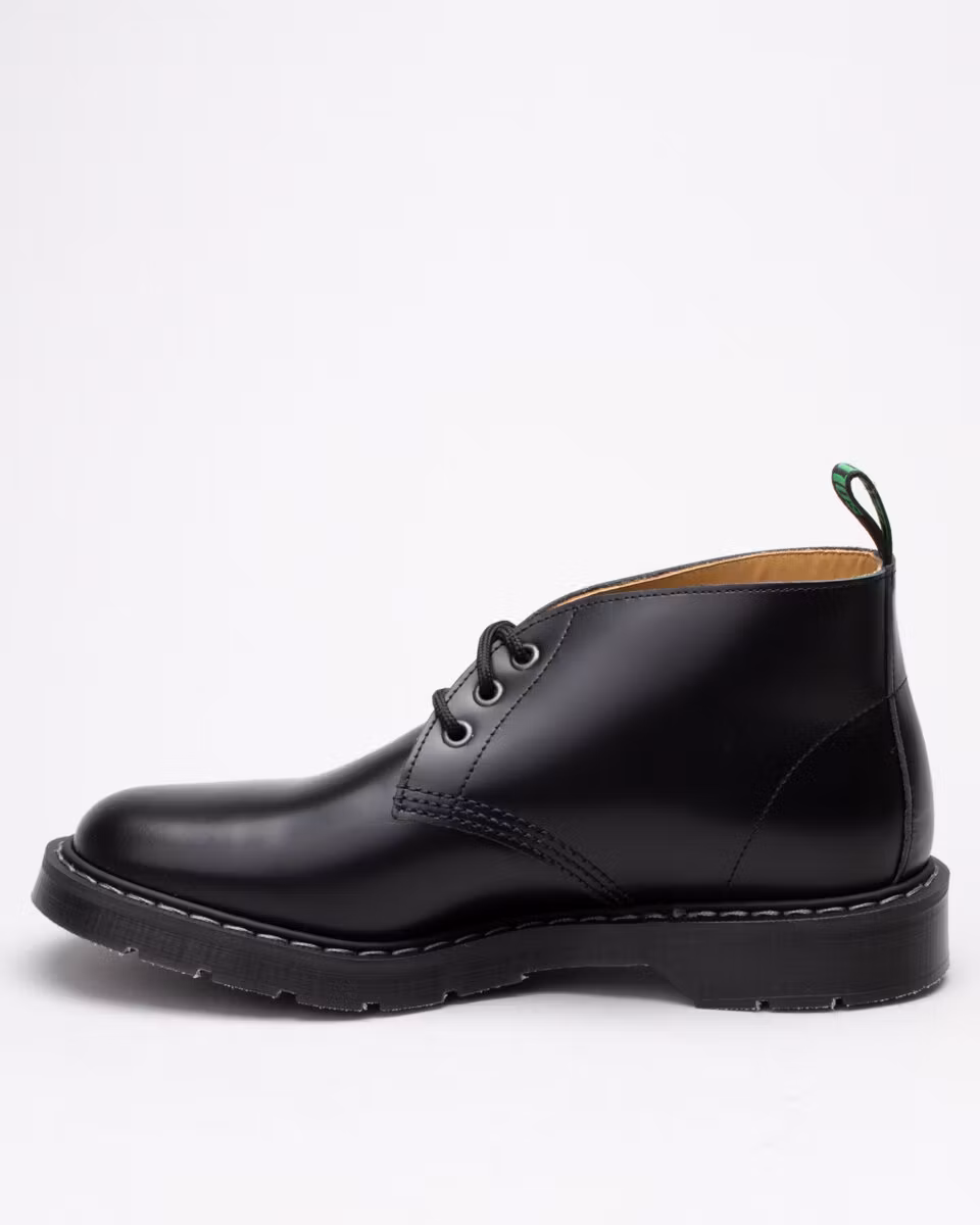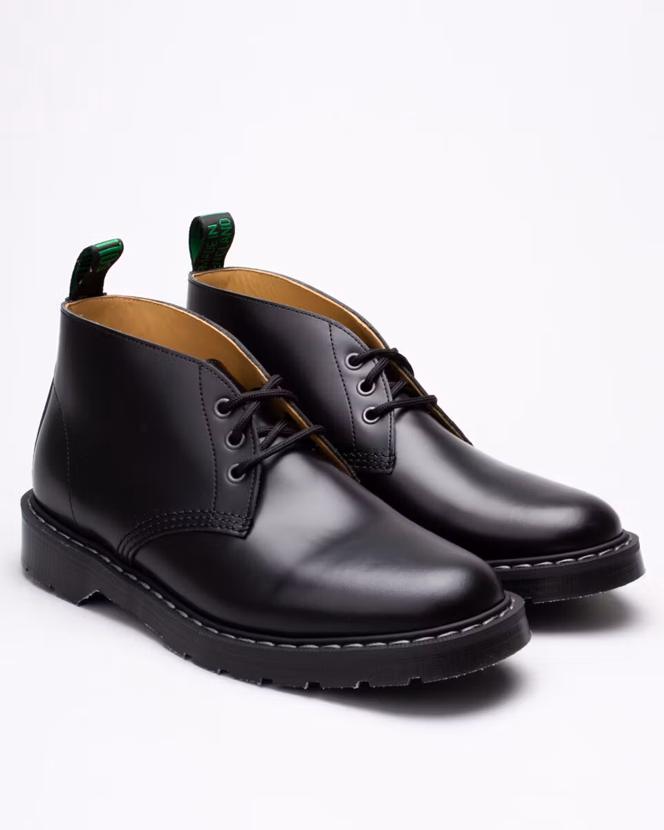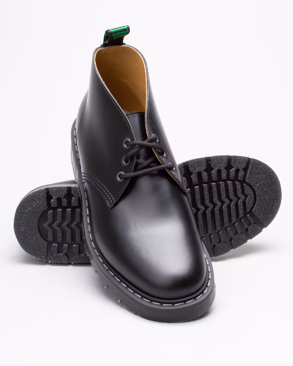 Traditional chukka boot in black hi-shine leather from Solovair. Leather and textile lining. Leather insole. Air cushioned rubber outsole for maximum comfort. Goodyear welted construction. Made in England. Normal width, F.