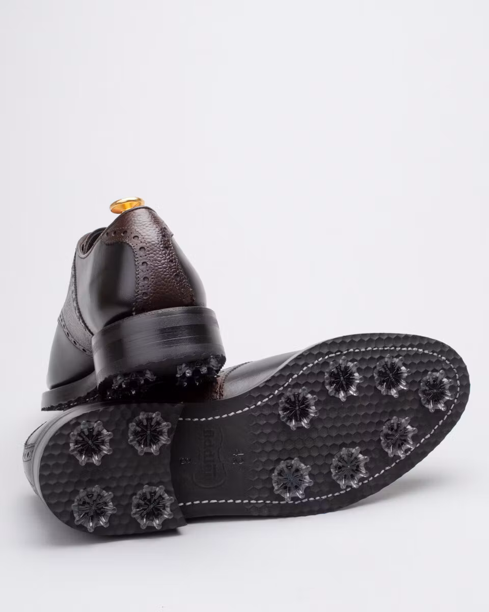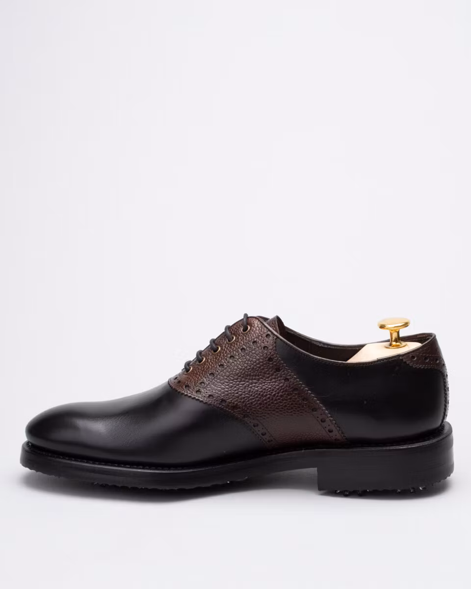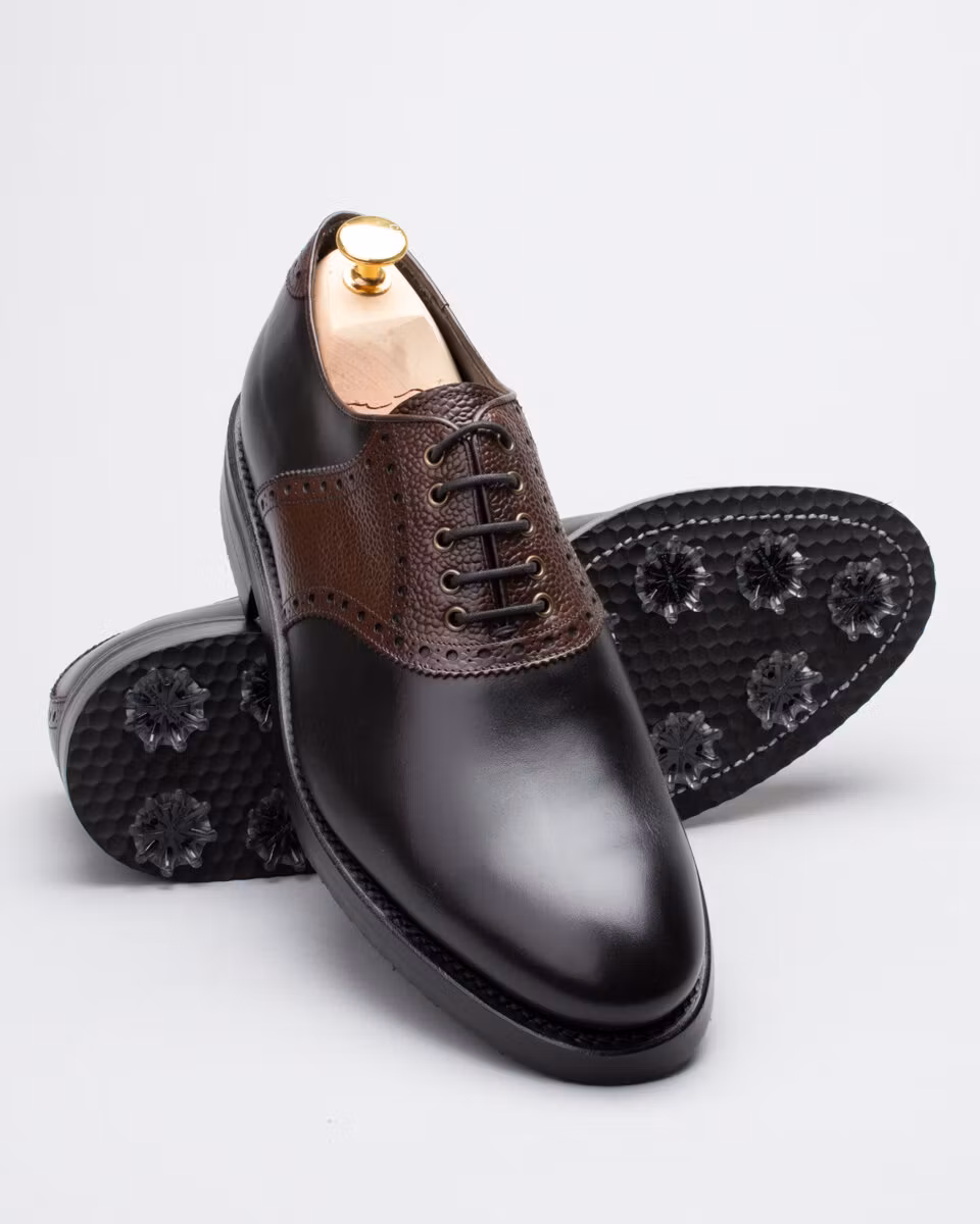 Classic saddle golf shoe. Upper in black calf leather. Saddle in black grain calf leather. Full calf leather lining. Leather insole. Rubber outsole. Leather midsole. Leather stacked heel. SoftSpikes Pulsar Golf Cleats Fast Twist® 3.0. Waxed cotton laces. Goodyear welted construction. Re-craftable. Comes with a black calf leather detachable kilt over the lacing. Normal/Wide last. Benchcrafted in Spain. Matching cedar shoe trees from Fiddler included.