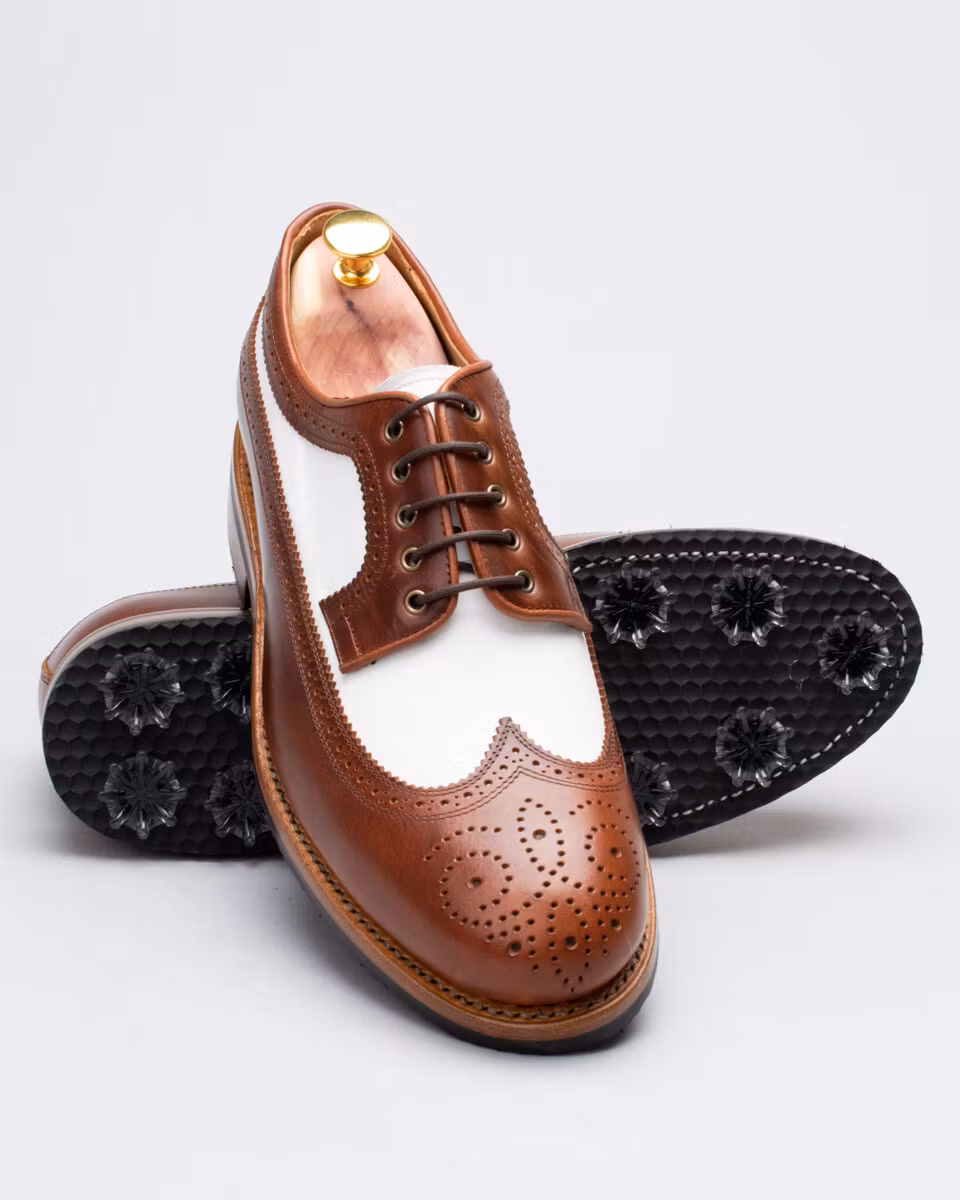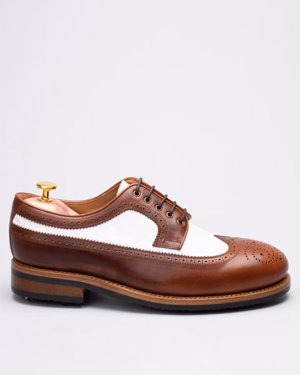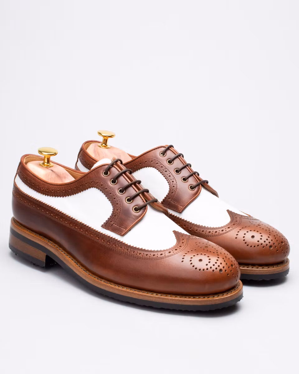 Golf shoe with classic long wing brogue. Upper in brown and white calf leather. Full calf leather lining. Leather insole with padded heel. Outsole in rubber. Leather stacked heel. SoftSpikes Pulsar Golf Cleats Fast Twist® 3.0. Waxed cotton laces. Goodyear welted construction. Re-craftable. Wide last. Benchcrafted in Spain. Matching cedar shoe trees from Fiddler included.