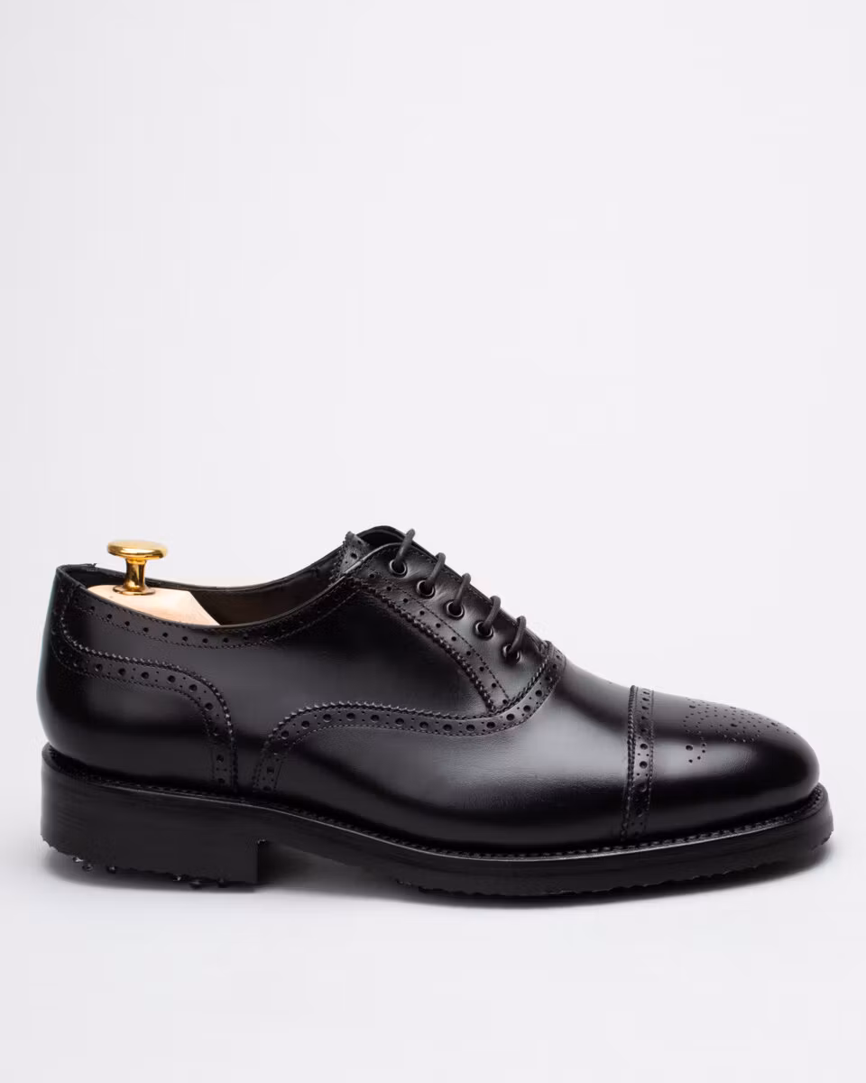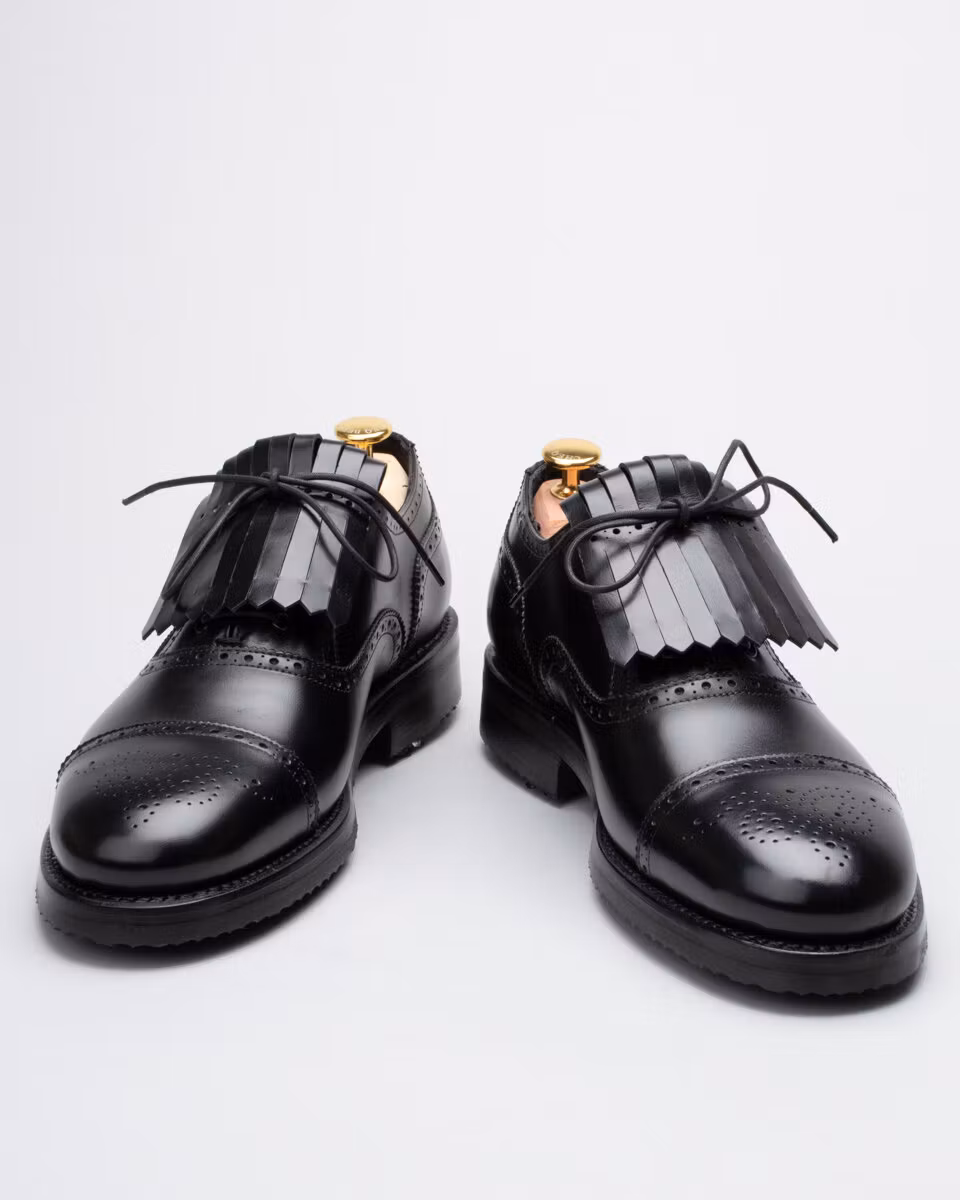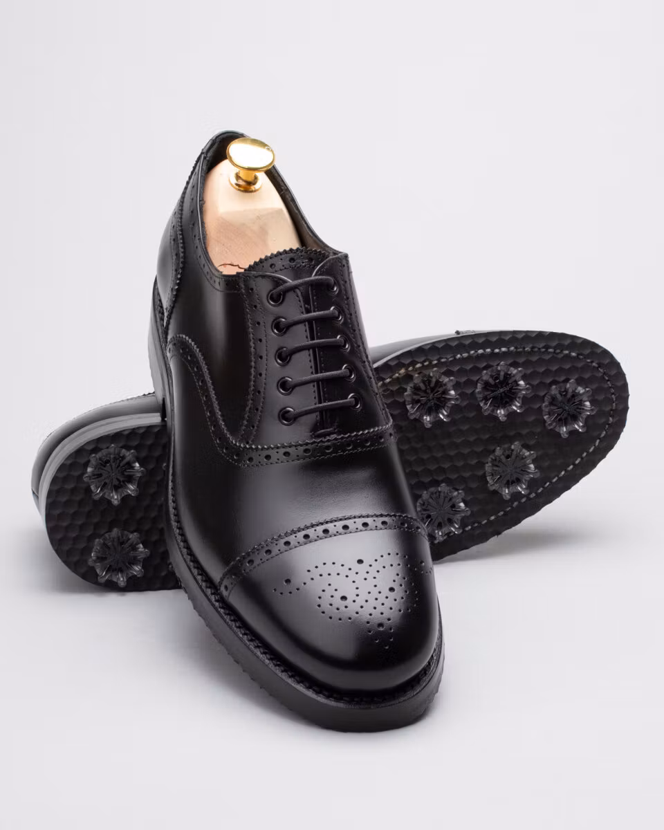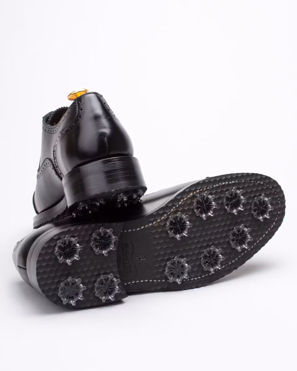 Golf shoe with classic semi brogue. Upper in black calf leather. Full calf leather lining. Leather insole. Outsole in rubber. Leather midsole. Leather stacked heel. SoftSpikes Pulsar Golf Cleats Fast Twist® 3.0. Waxed cotton laces. Goodyear welted construction. Re-craftable. Comes with a dark brown calf leather detachable kilt over the lacing. Normal/Wide last. Benchcrafted in Spain. Matching cedar shoe trees from Fiddler included.