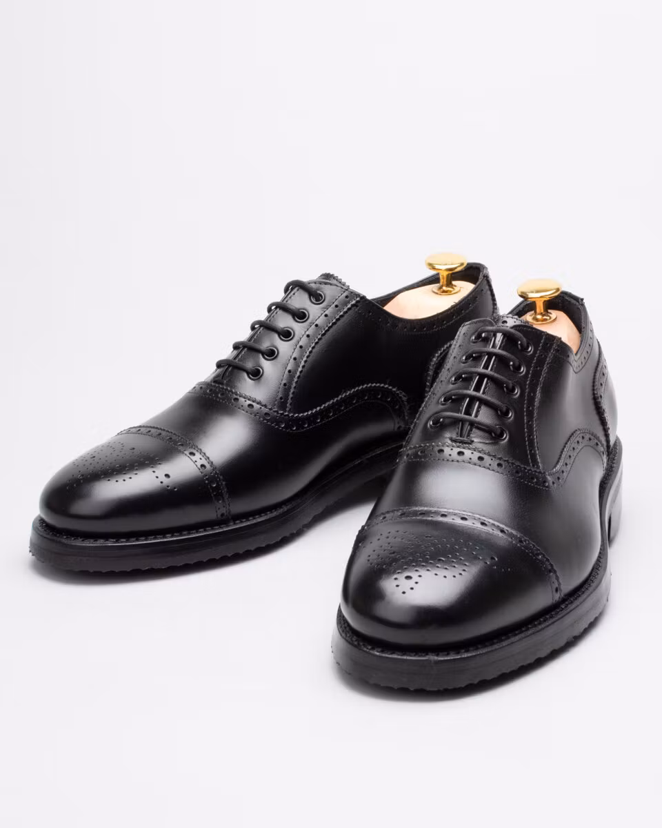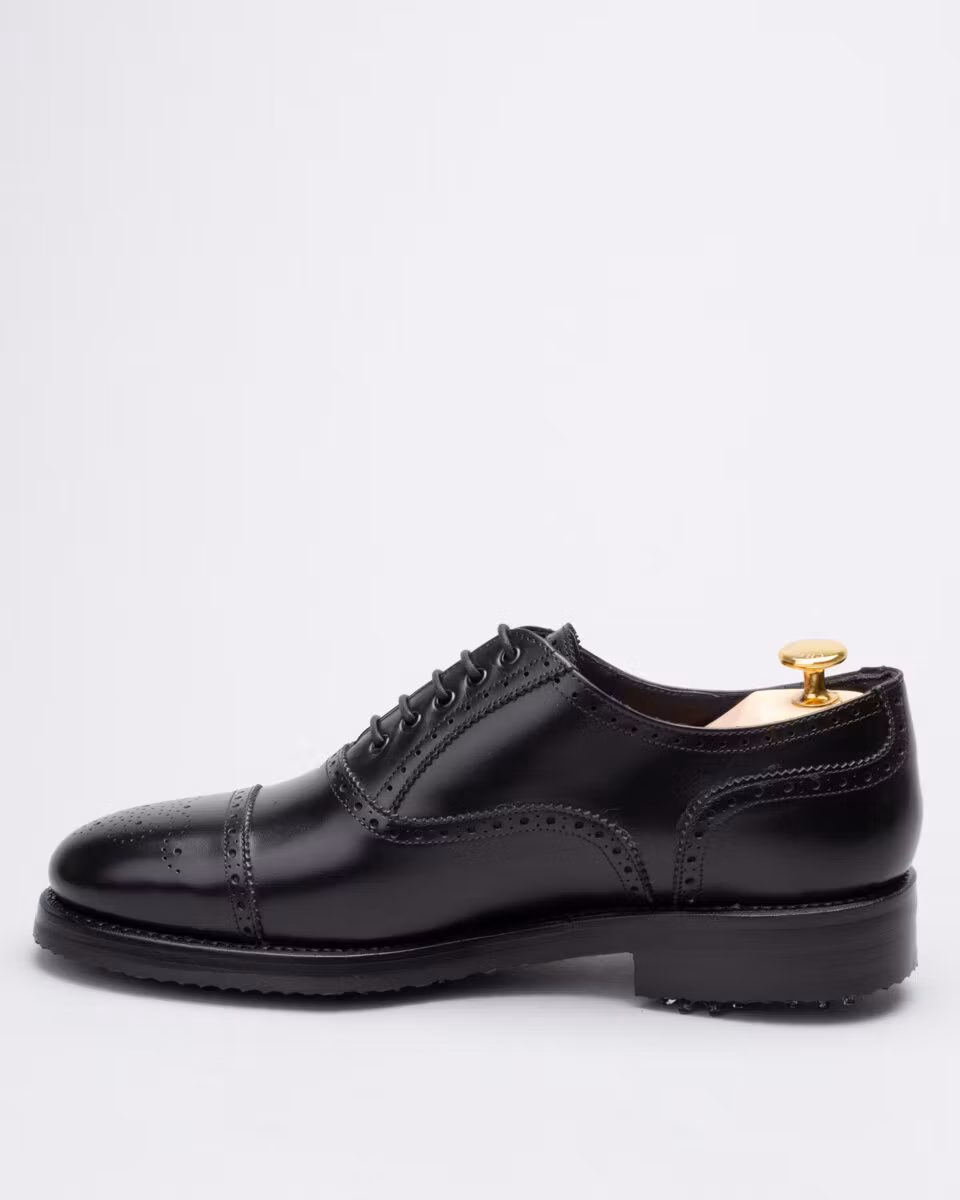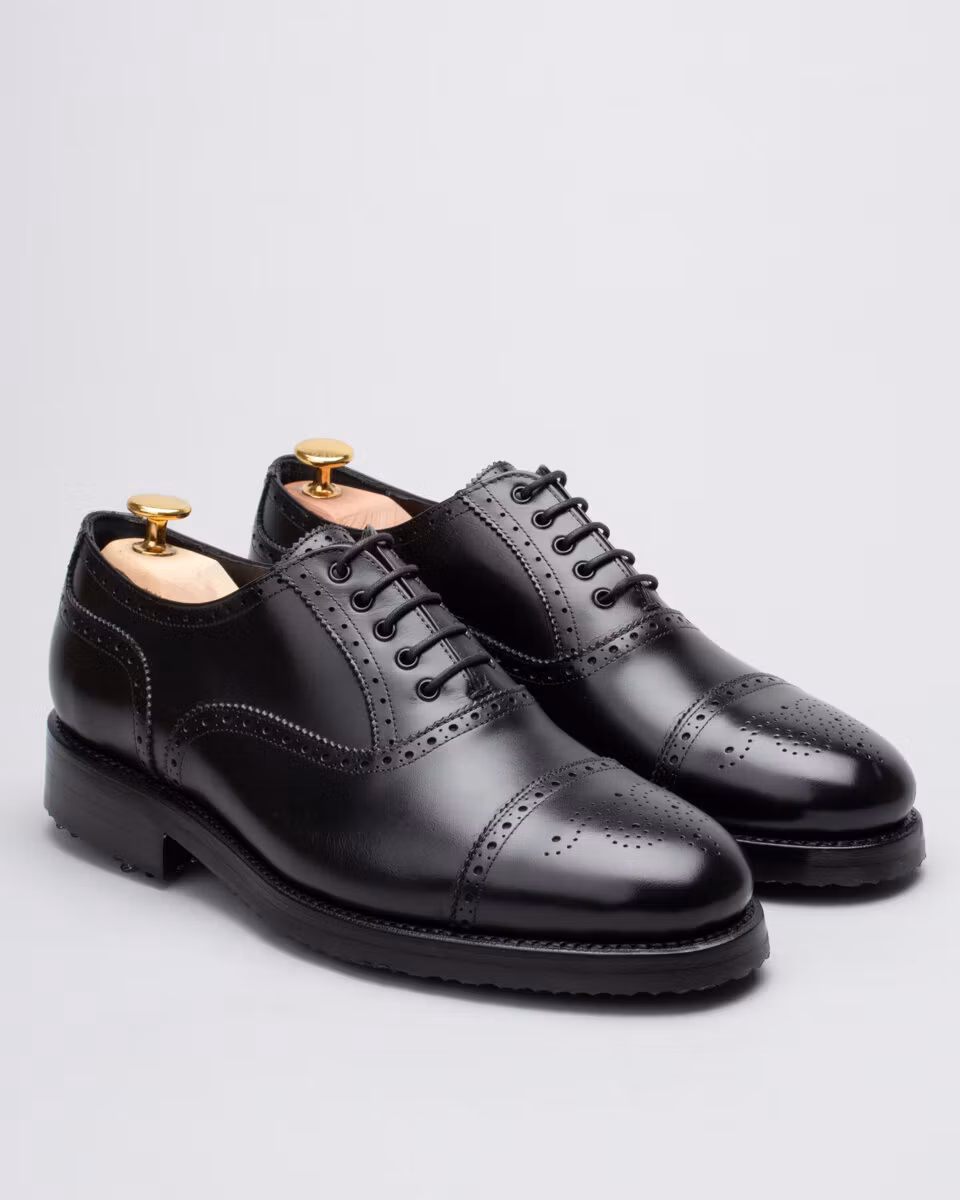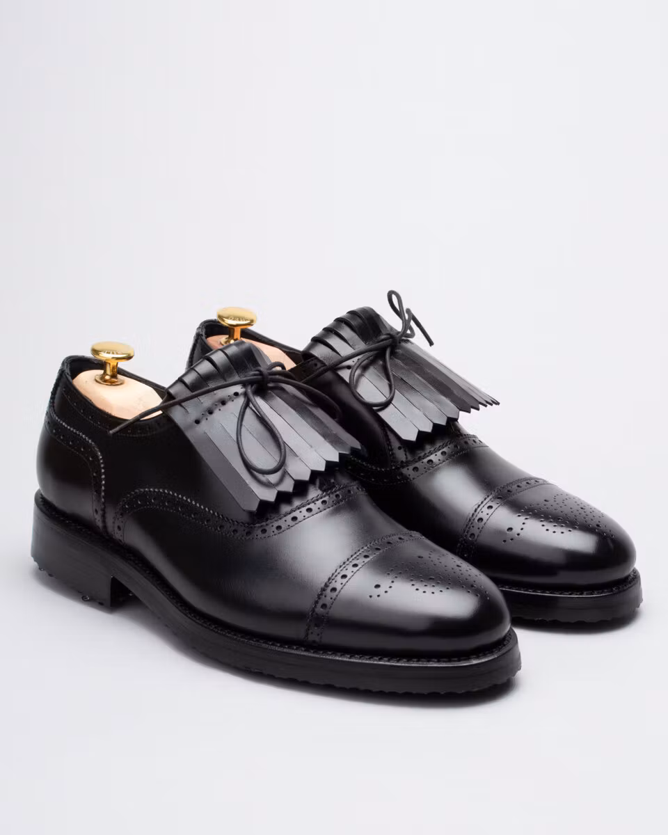 Golf shoe with classic semi brogue. Upper in black calf leather. Full calf leather lining. Leather insole. Outsole in rubber. Leather midsole. Leather stacked heel. SoftSpikes Pulsar Golf Cleats Fast Twist® 3.0. Waxed cotton laces. Goodyear welted construction. Re-craftable. Comes with a dark brown calf leather detachable kilt over the lacing. Normal/Wide last. Benchcrafted in Spain. Matching cedar shoe trees from Fiddler included.