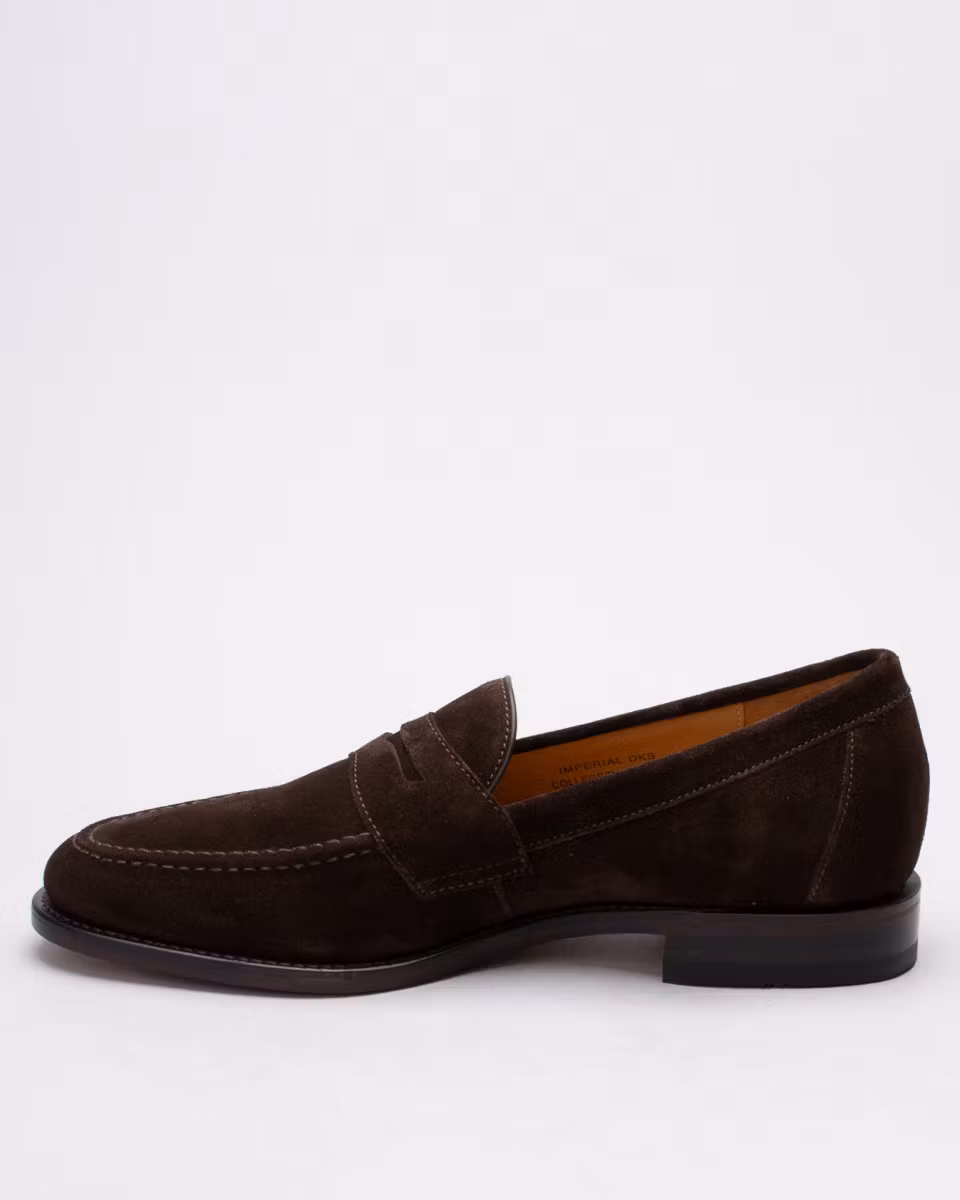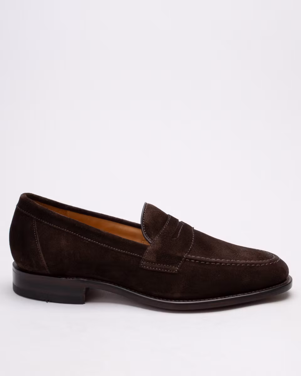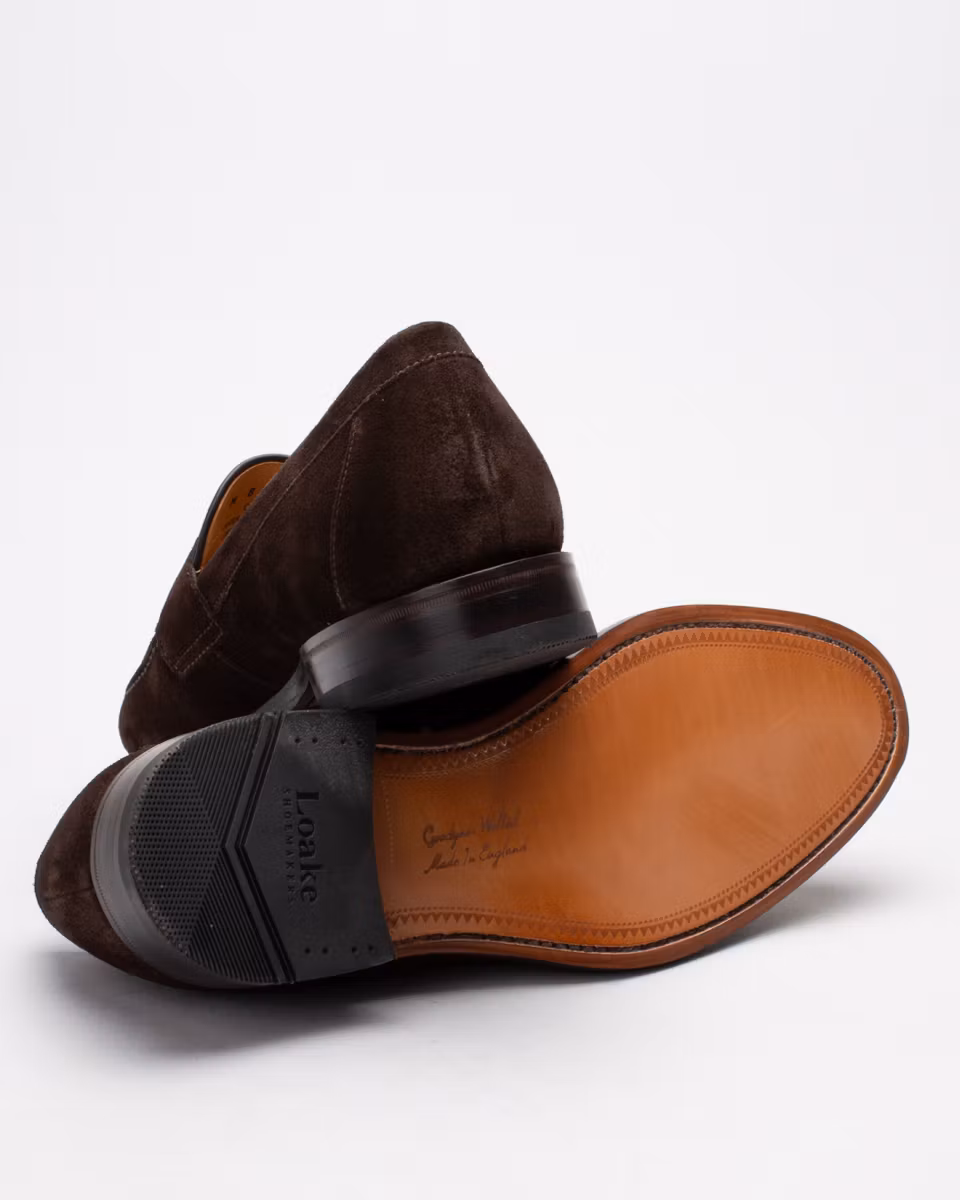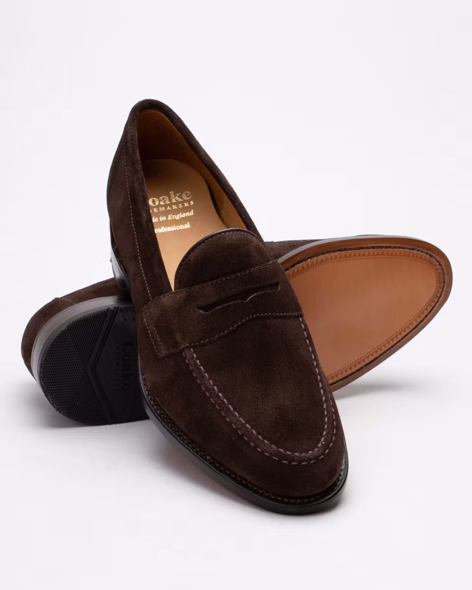 Classic penny loafer from Loake. Upper in dark brown suede. Leather insole. Leather outsole. Full leather lining. Goodyear welted construction. Rubber heel. Made in England. Standard width last, F.