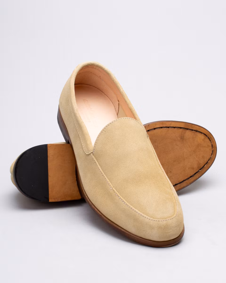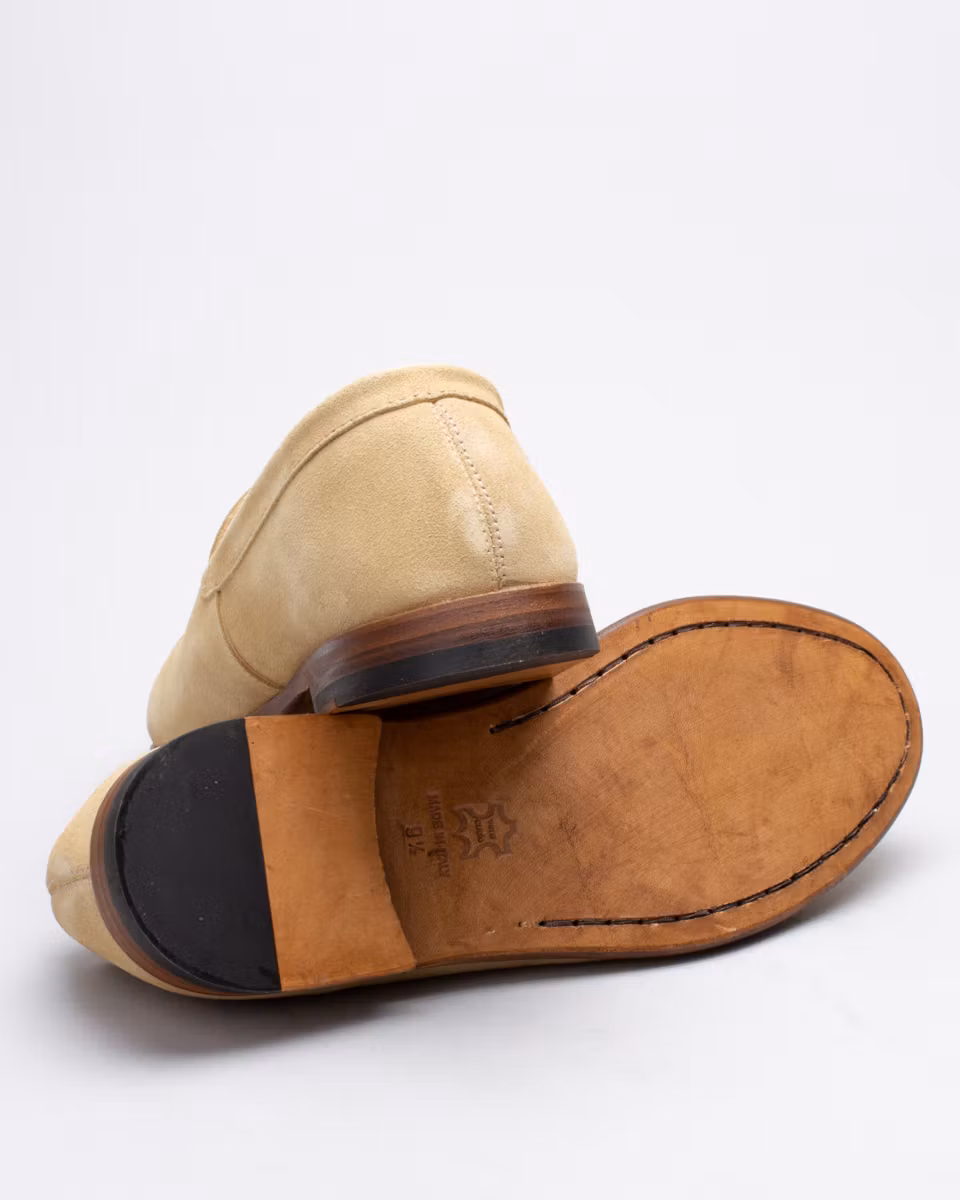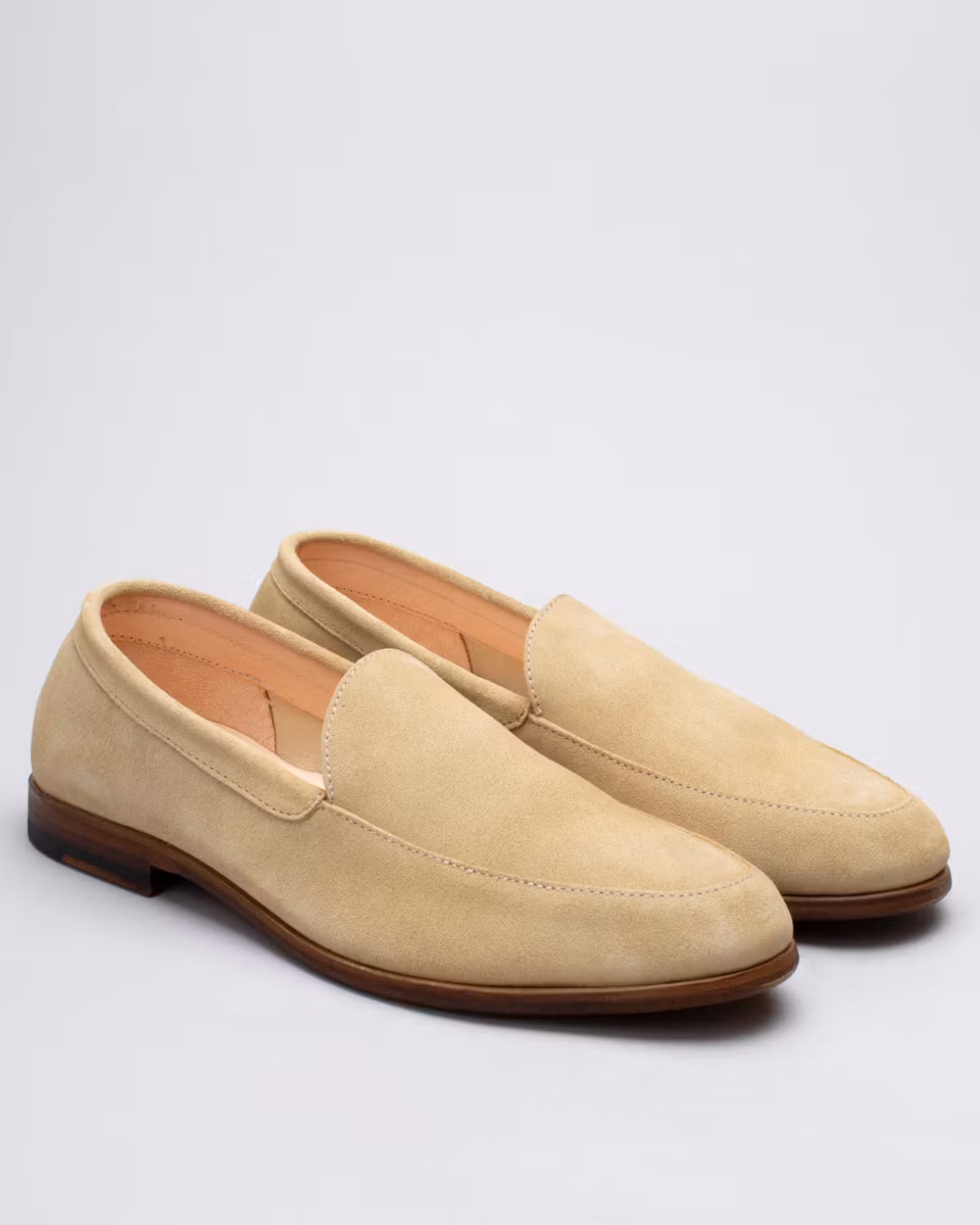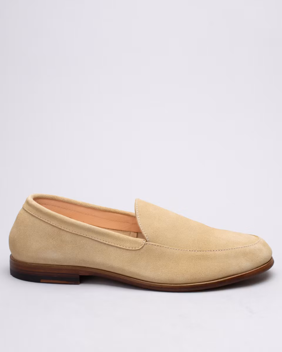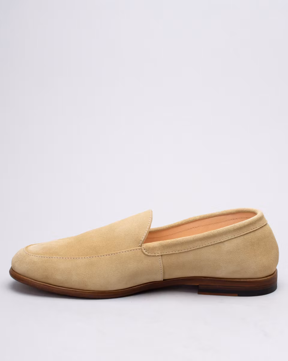 Loafer from the Italian brand Astorflex. Upper in sand-colored "rough out" suede. Unlined. Removable, leather-covered insole. Leather outsole. Stitch-down construction. Made in Italy.