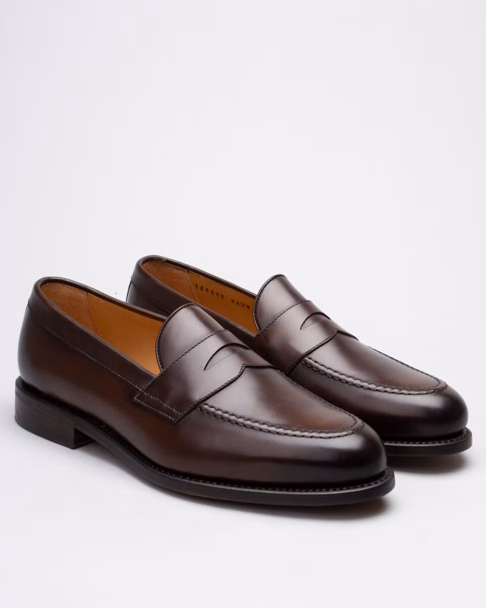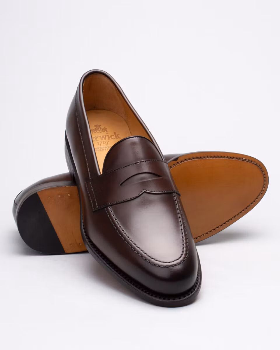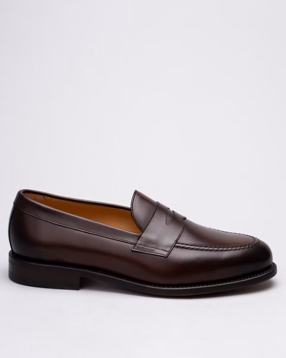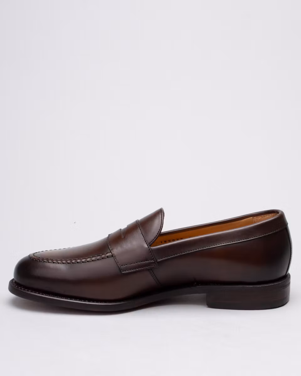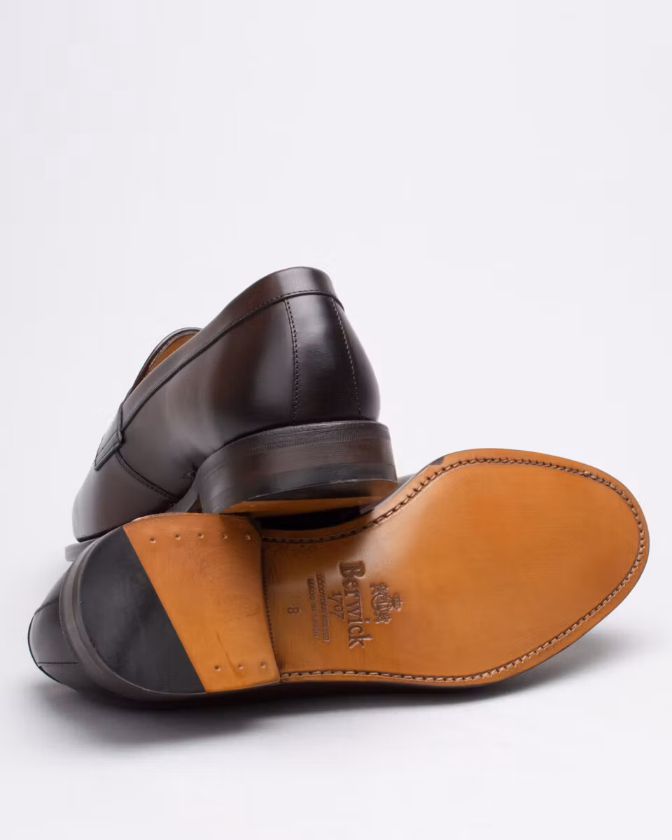 Classic penny loafer from Berwick. Upper in dark brown calf leather. Leather insole. Full leather lining. Leather outsole. Leather stacked heel. Goodyear welt construction. Handcrafted in Spain. Last: Ho8