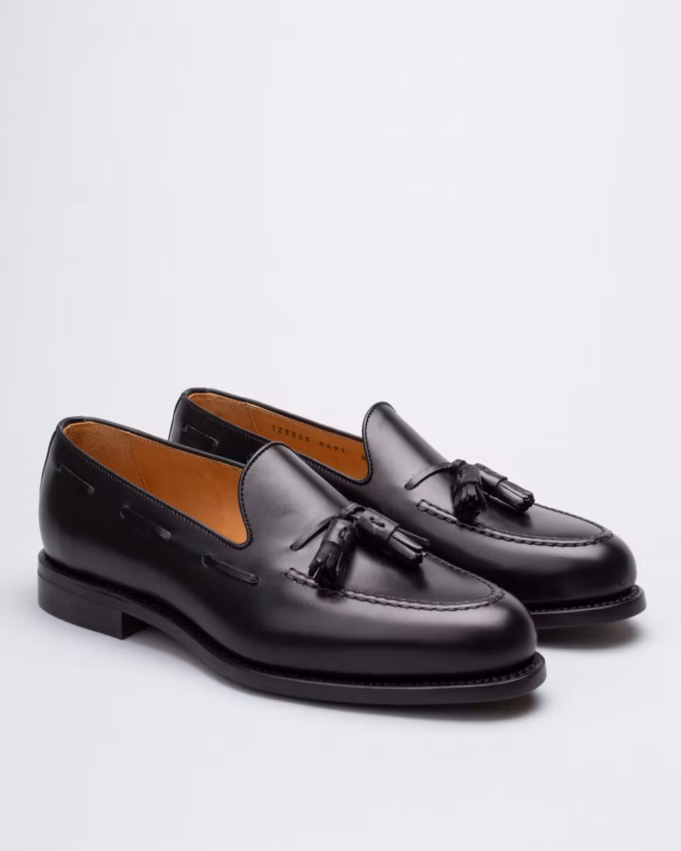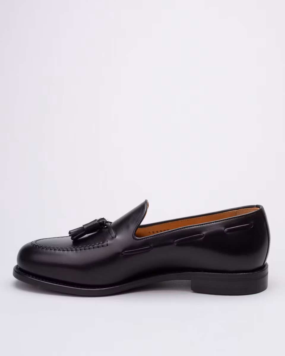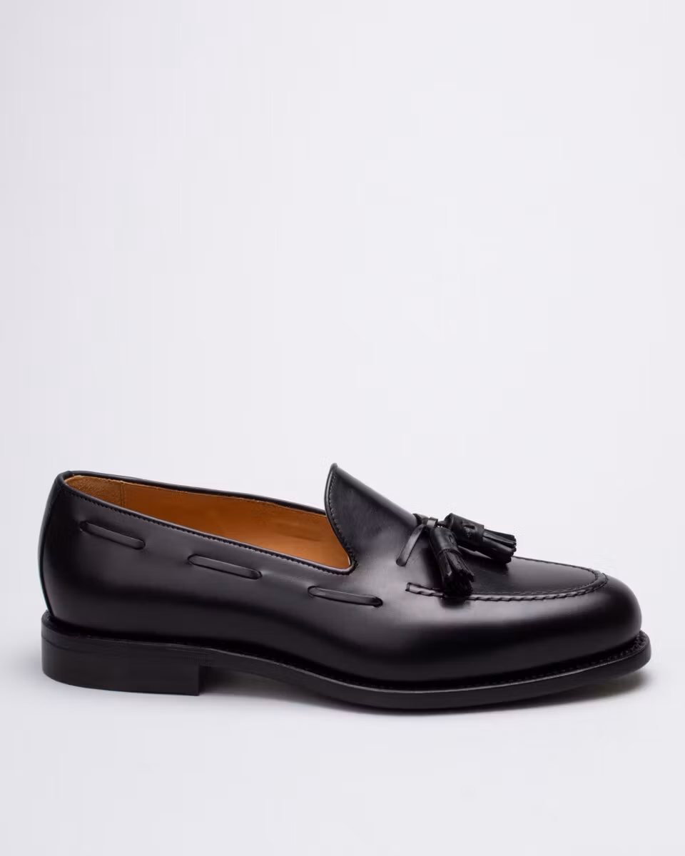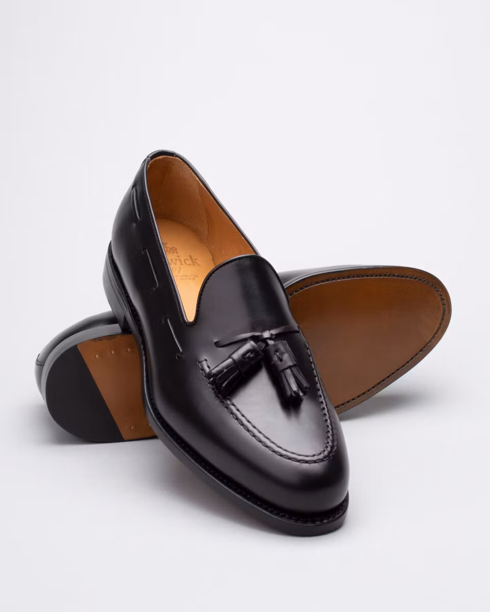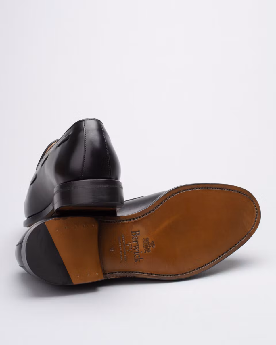 Classic tassel loafer from Berwick. Upper in black calf leather. Leather insole. Full leather lining. Leather outsole. Leather stacked heel. Goodyear welt construction. Handcrafted in Spain. Last: Ho8