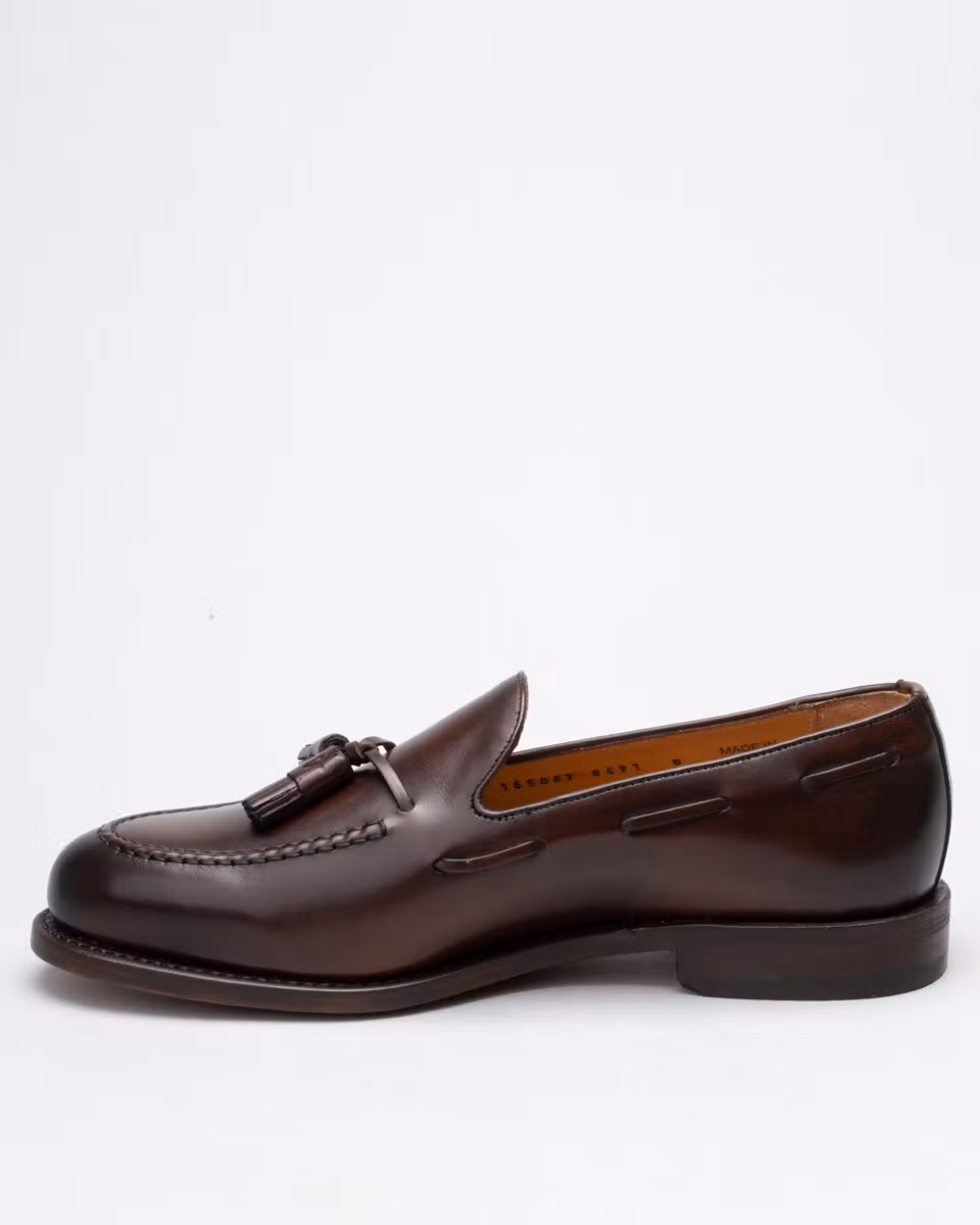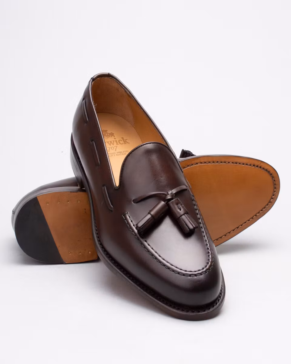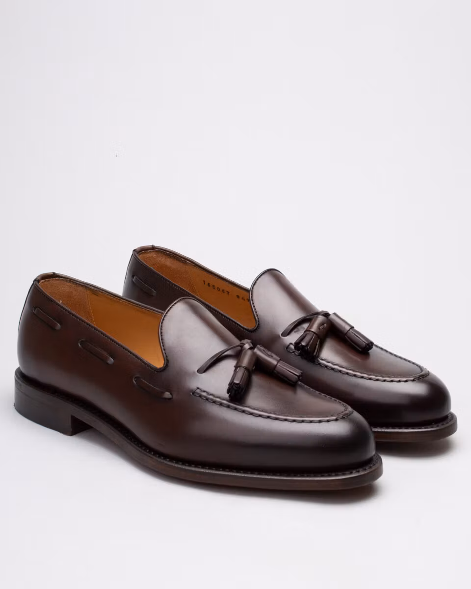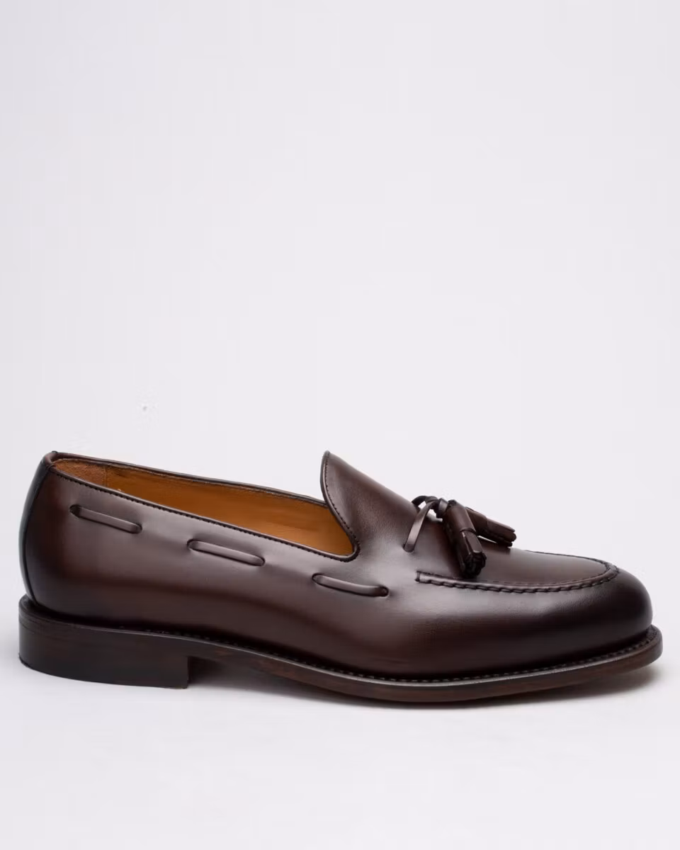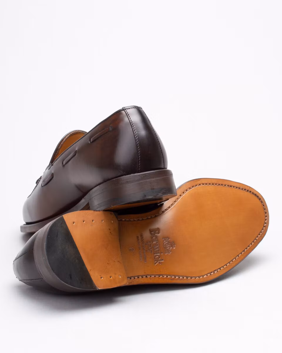 Classic tassel loafer from Berwick. Upper in dark brown calf leather. Leather insole. Full leather lining. Leather stacked heel. Goodyear welt construction. Handcrafted in Spain. Last: Ho8