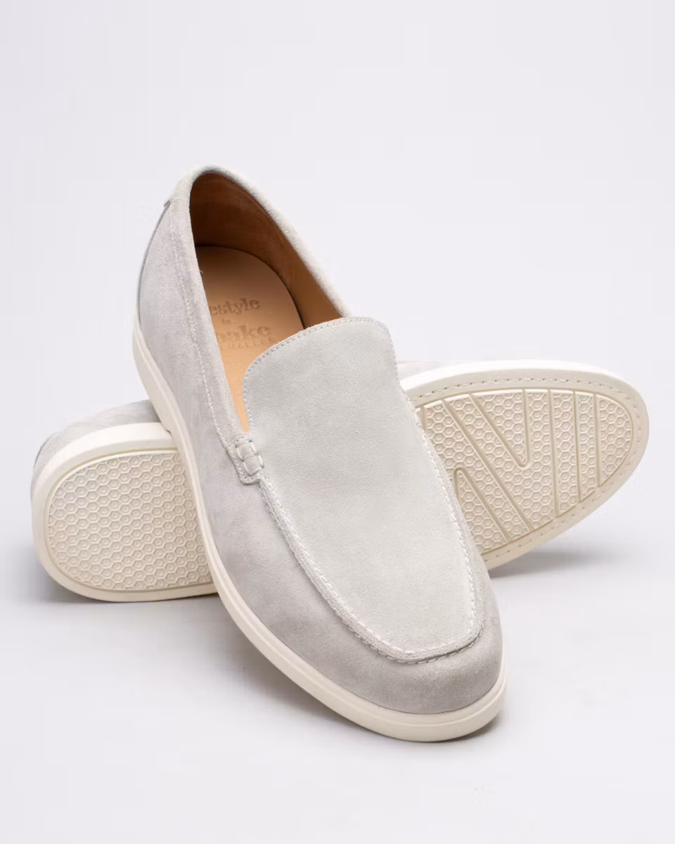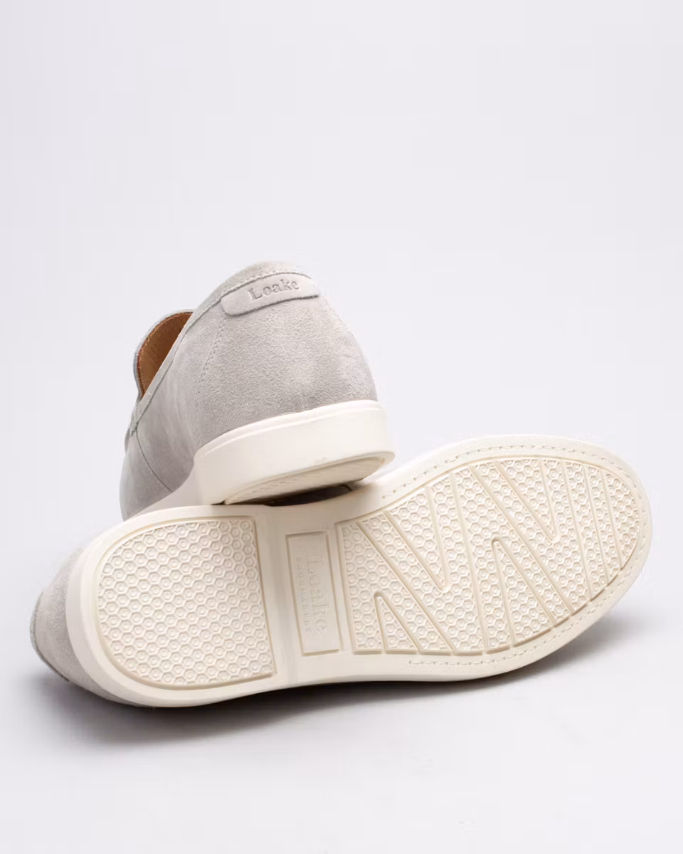 Loafer from Loake. Upper in light grey suede. Full leather lining. Detachable, leather lined insole. Rubber outsole. Normal width, F.