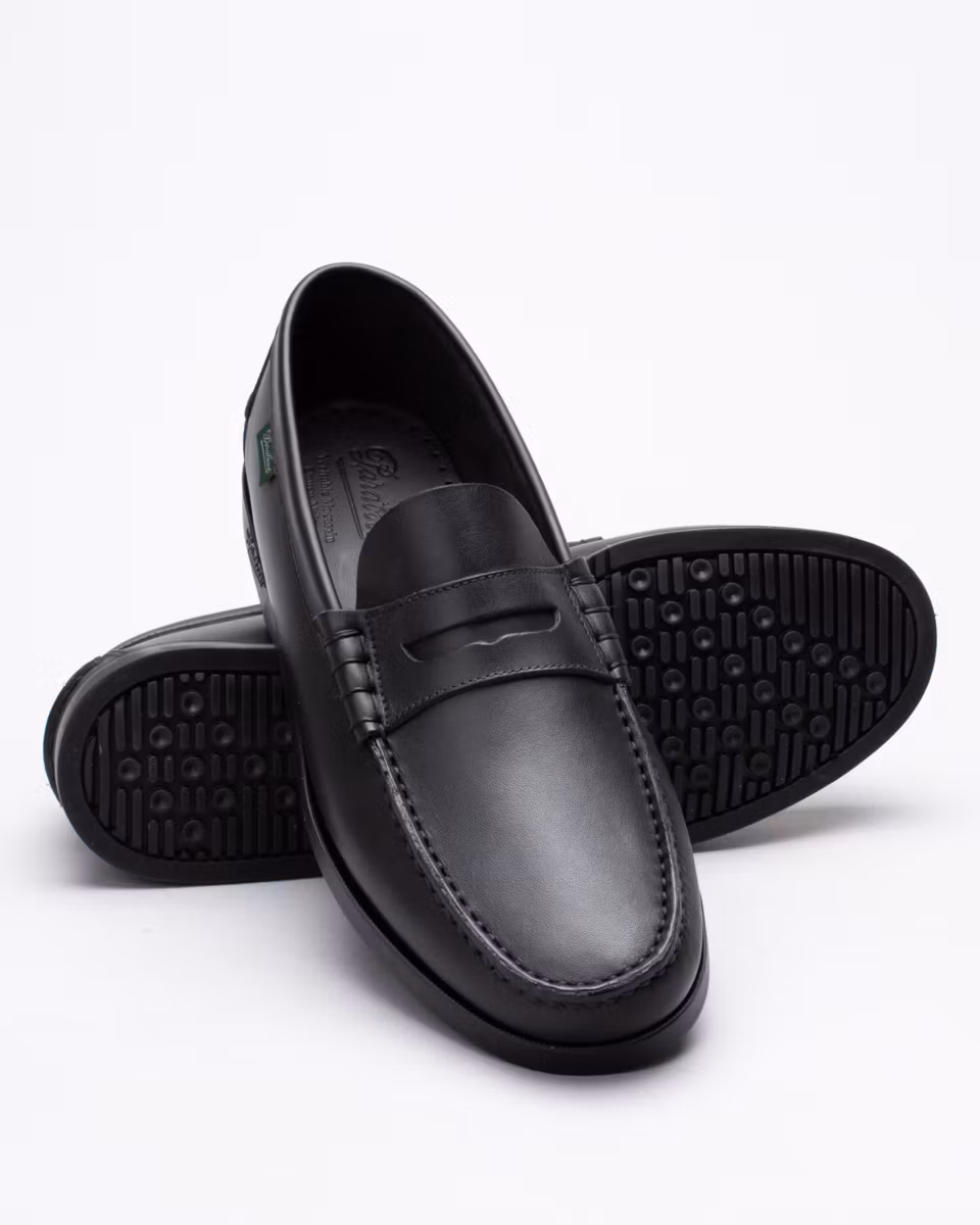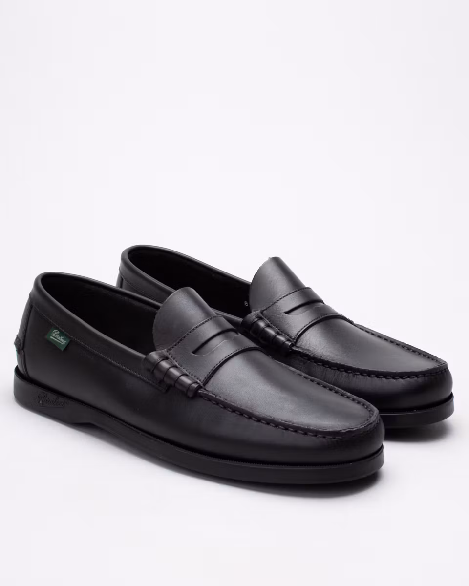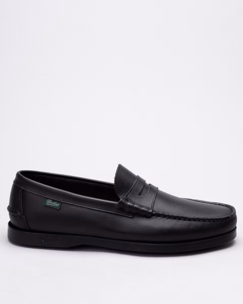 Paraboot's marine loafer, Coraux. Upper in black leather. Full leather lining. Leather insole. Rubber outsole. Blake stitched construction. Made in Spain.