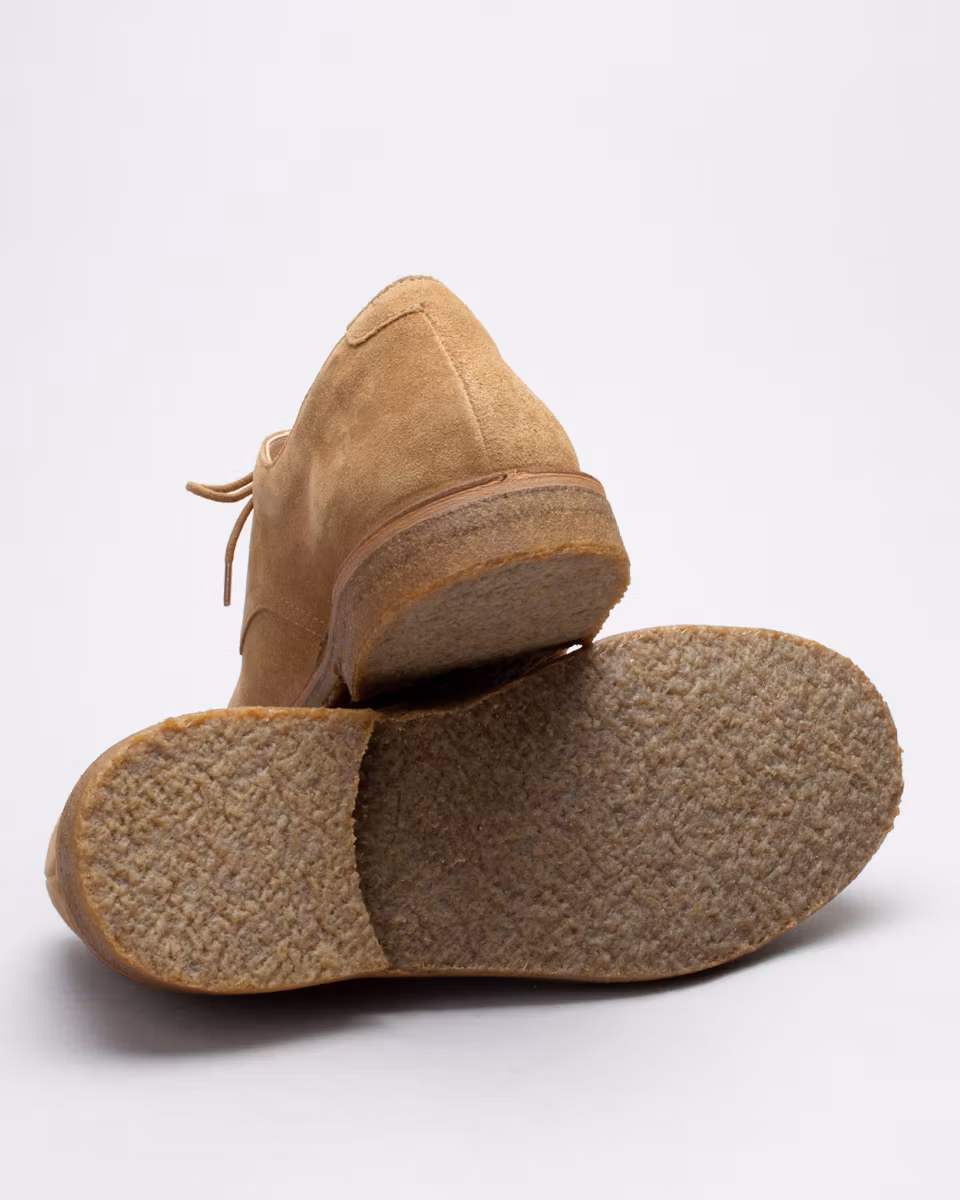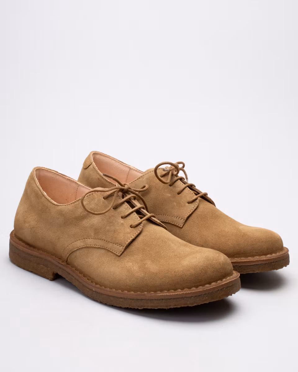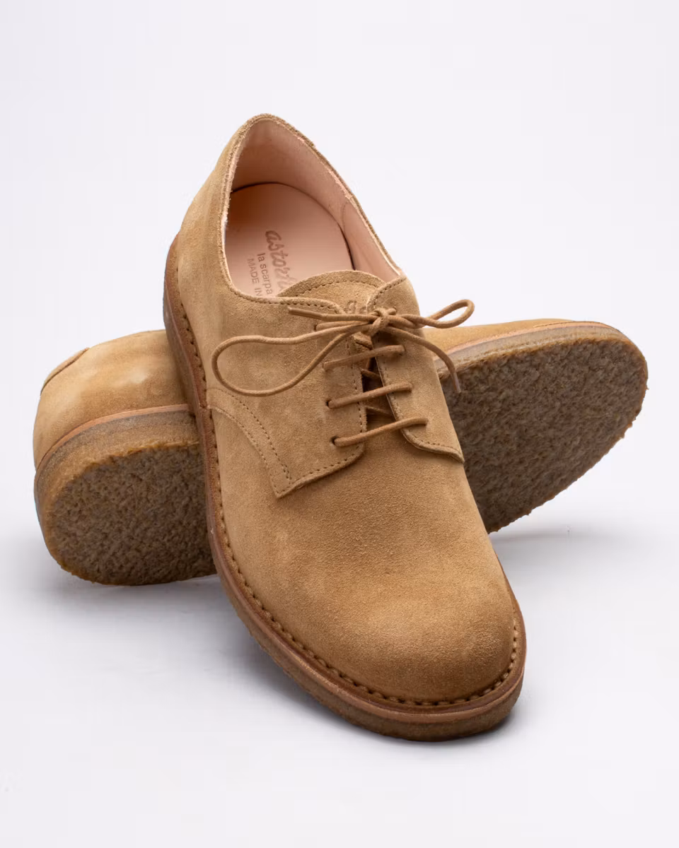 Oxford shoe from Italian Astorflex. Upper in whiskey suede. Fully leather lined. Removable, leather-covered insole. Crepe rubber outsoles. Stitch-down construction. Made in Italy.