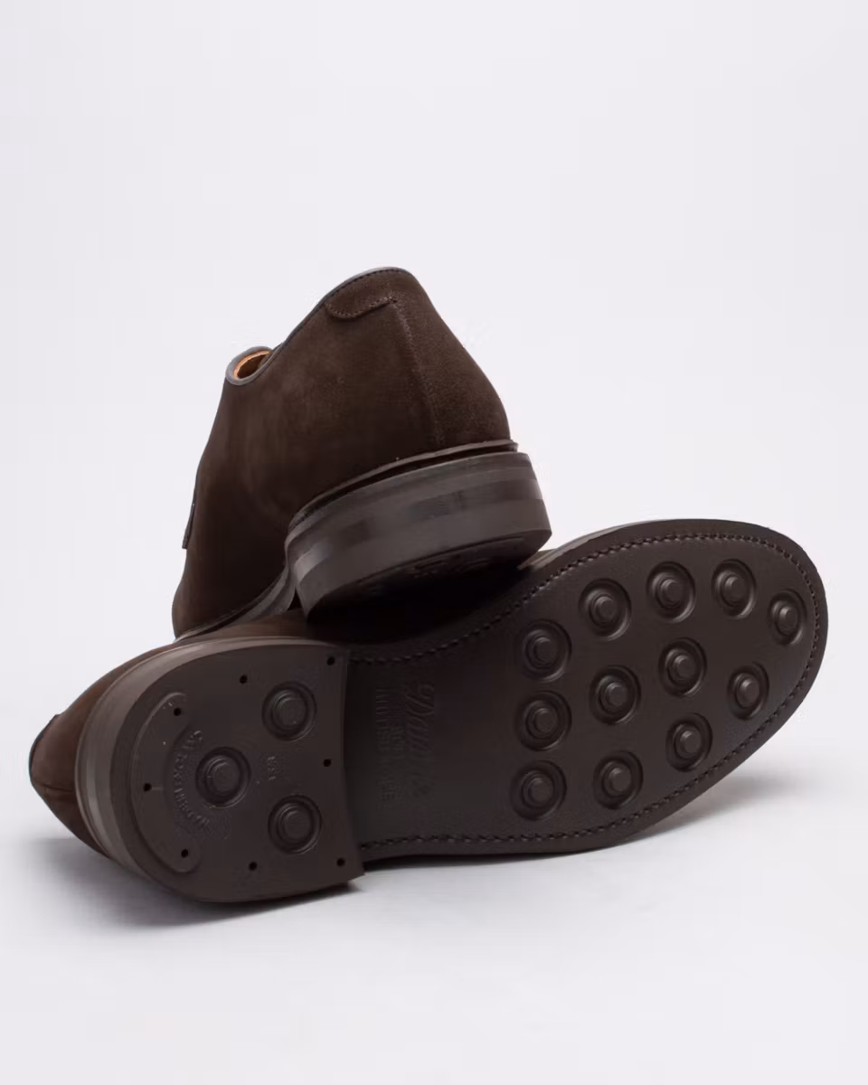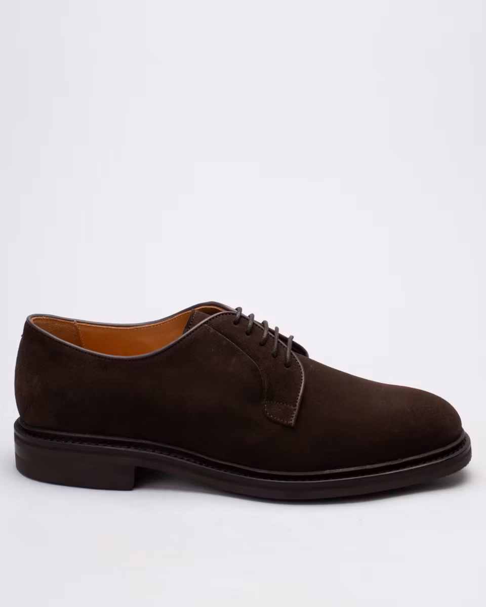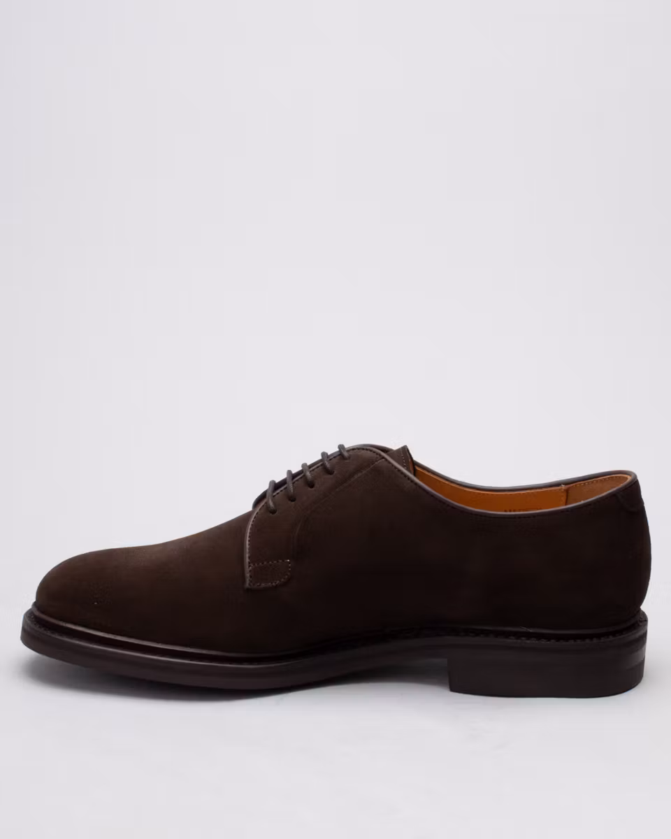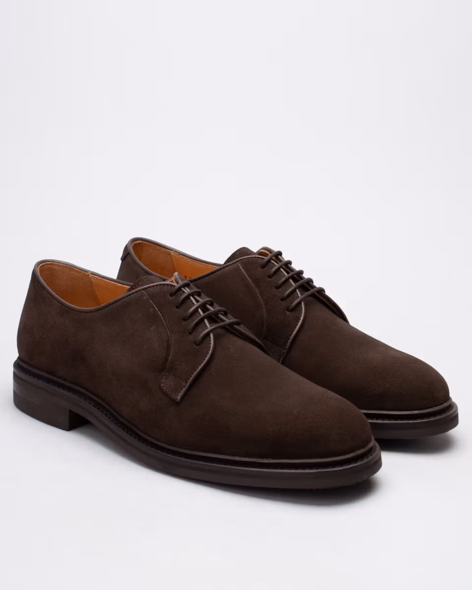 Elevate your wardrobe with this classic dark brown derby, crafted from premium C.F. Stead suede. Fully leather-lined with a comfortable leather insole and a durable Dainite rubber outsole. Featuring Goodyear welted construction with a storm welt, this handcrafted shoe from Spain combines timeless style with lasting quality. Last: Ho234.