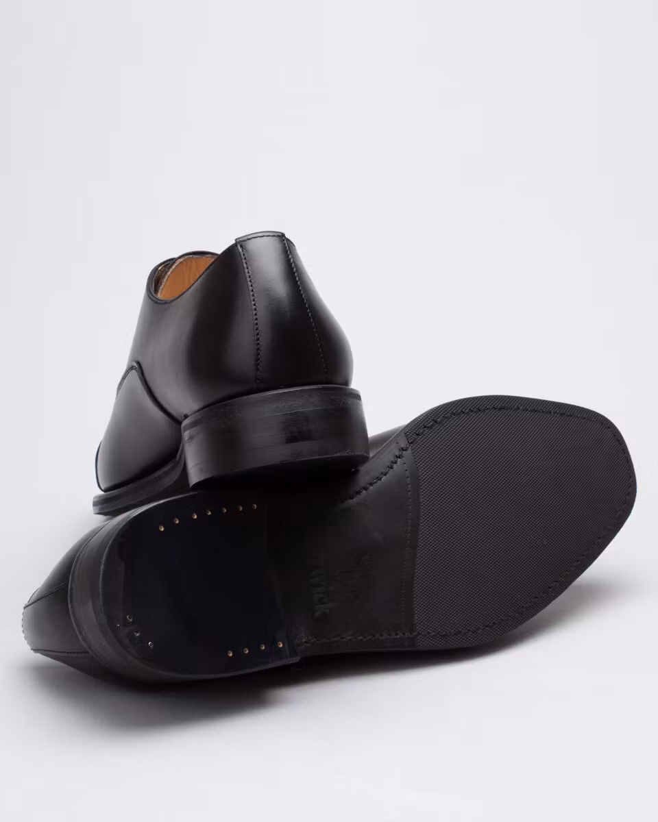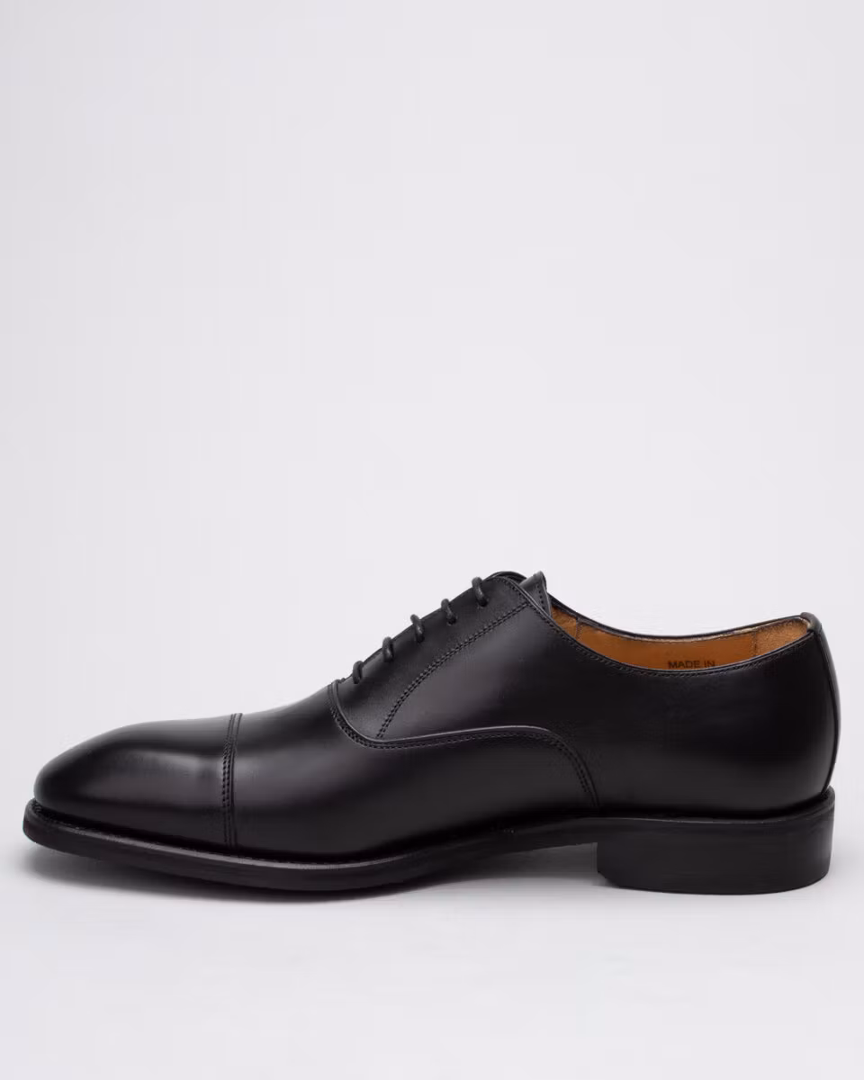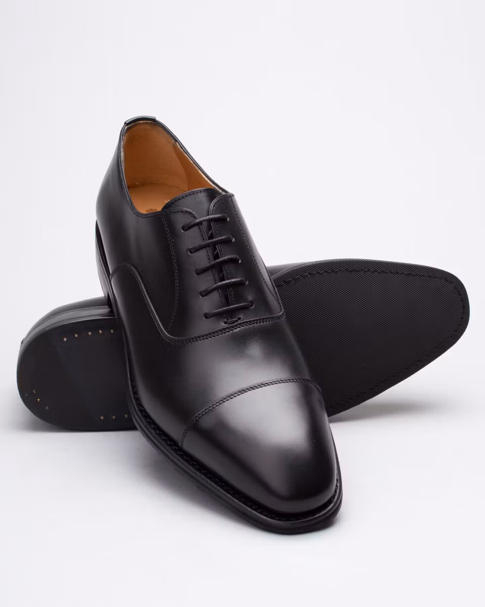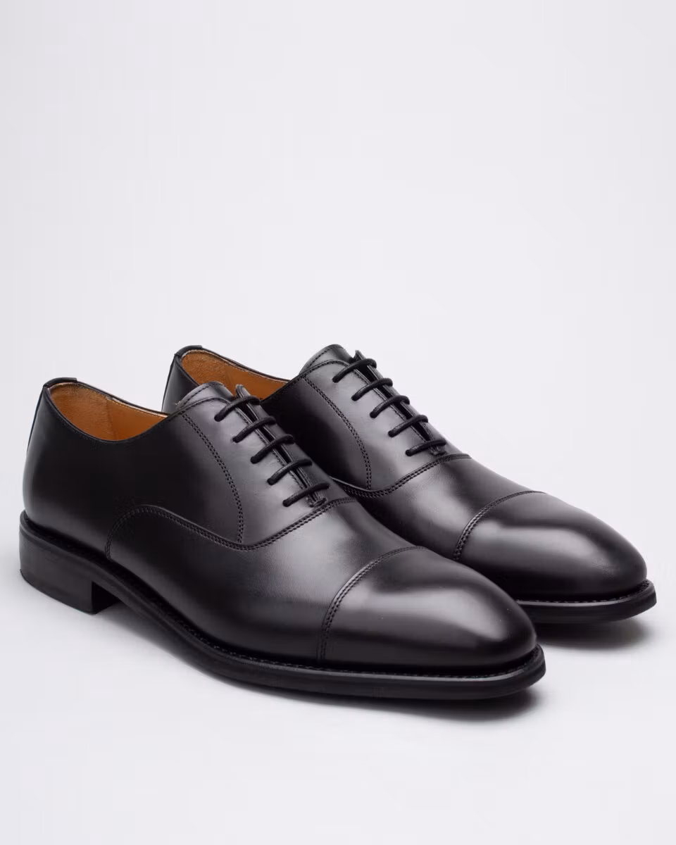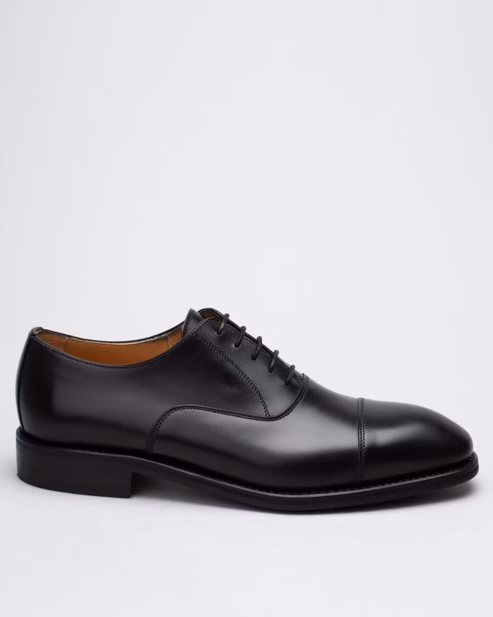 Traditional oxford with cap-toe from Berwick. Upper in black calf leather. Full leather lining. Leather insole. Rubber outsole. Goodyear welted construction. Handcrafted in Spain. Last: HO915