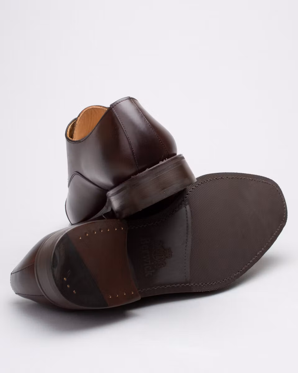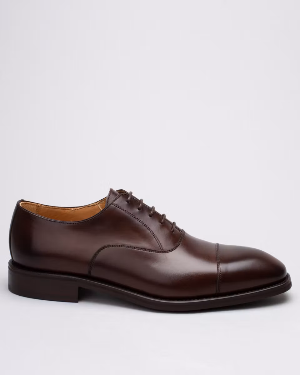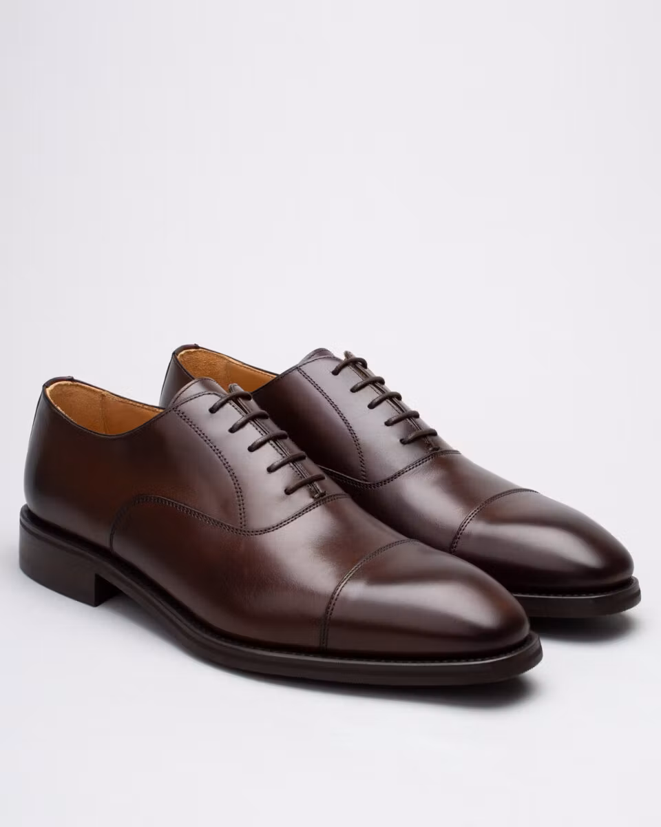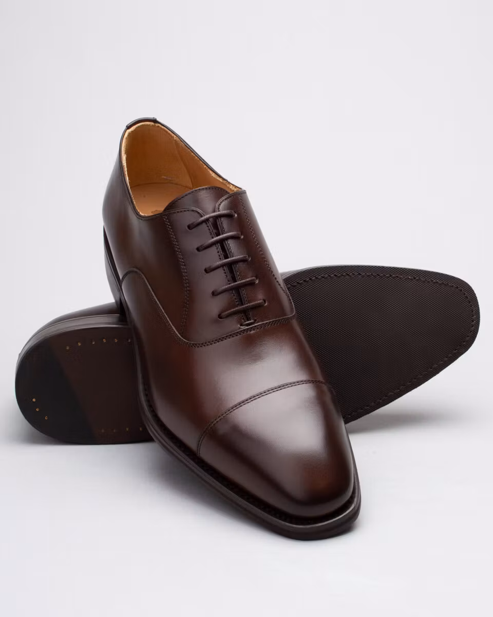 Traditional oxford with cap-toe from Berwick. Upper in dark brown calf leather. Full leather lining. Leather insole. Rubber outsole. Goodyear welted construction. Handcrafted in Spain. Last: HO915