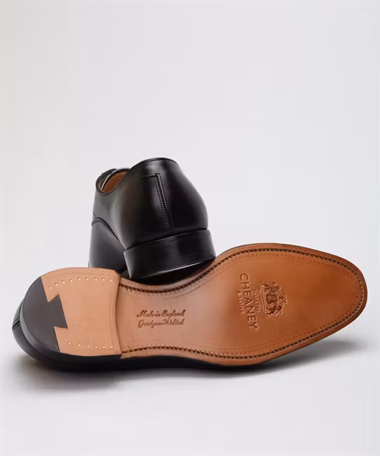 The classic oxford with capped toe from English Joseph Cheaney & Sons. Upper in premium grade calf leather. Full leather lining. Leather insole. Leather outsole. Leather stacked heel. Goodyear welted construction with 3/4 welt. Fully made in England. Last: 125 Width: F