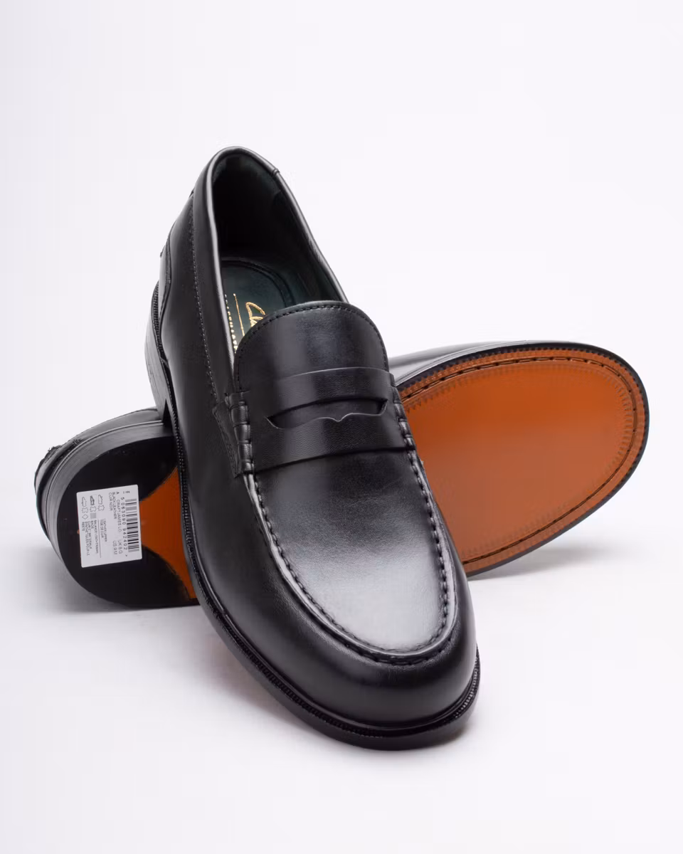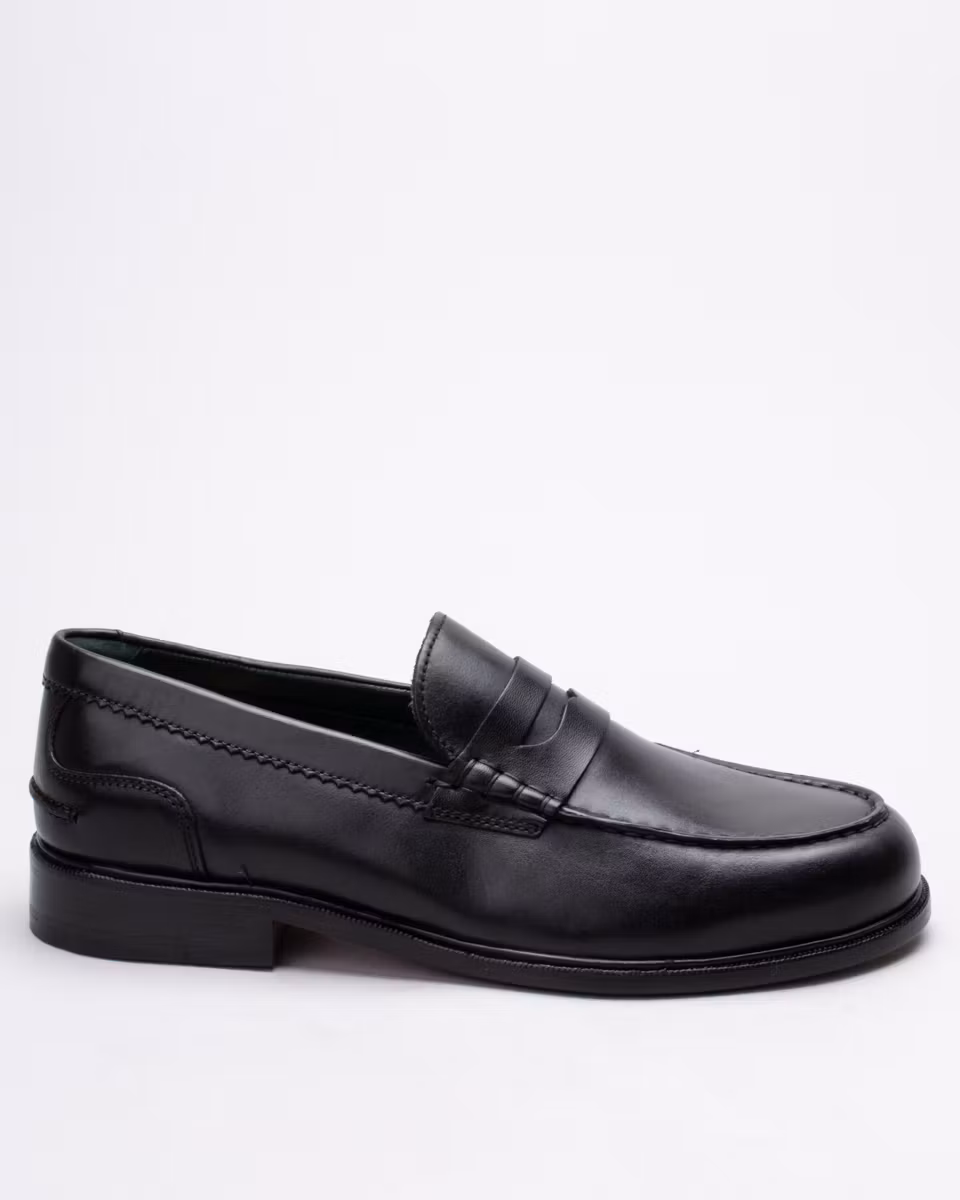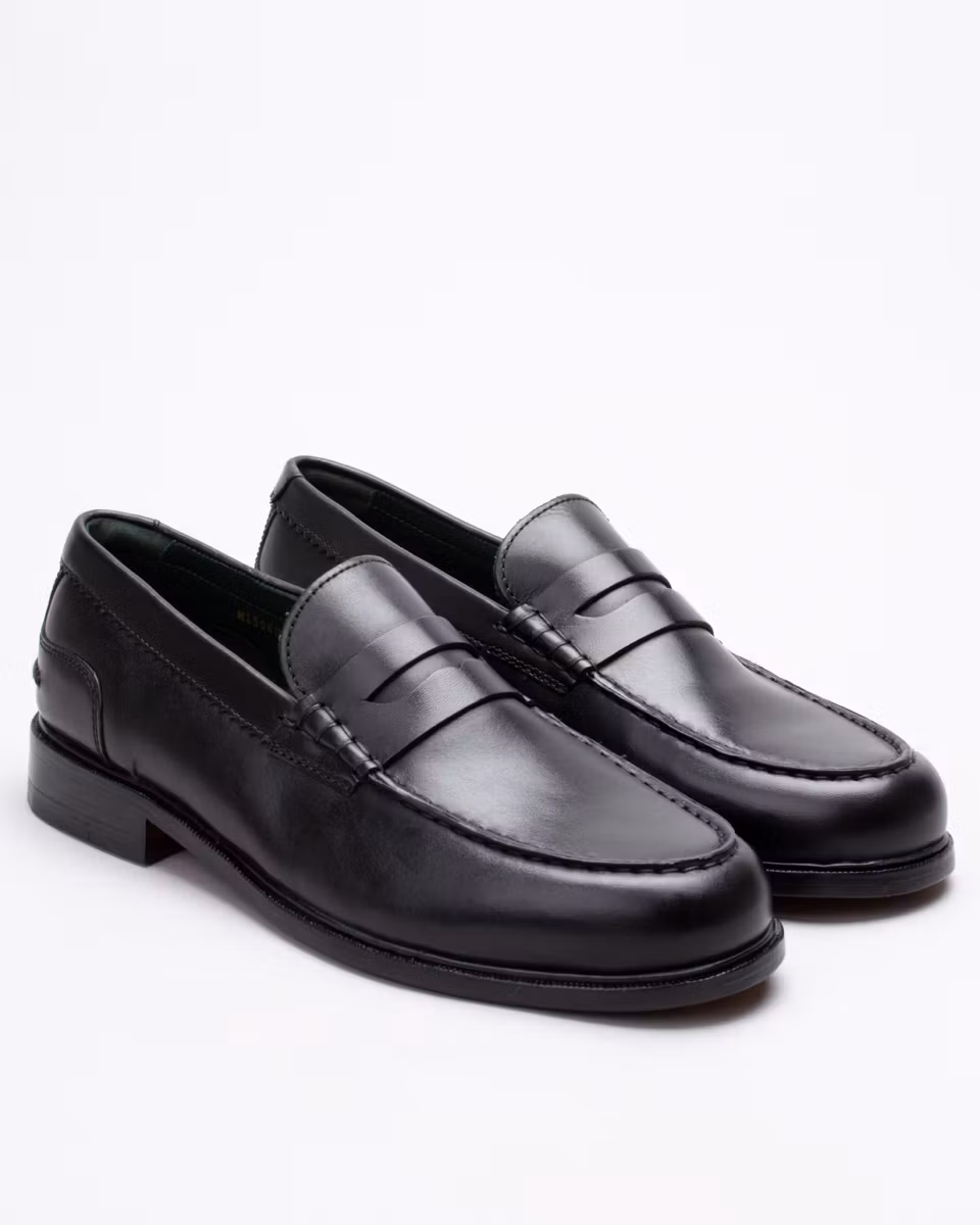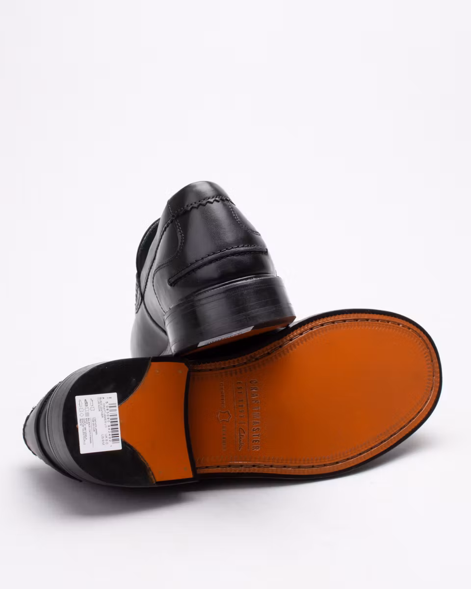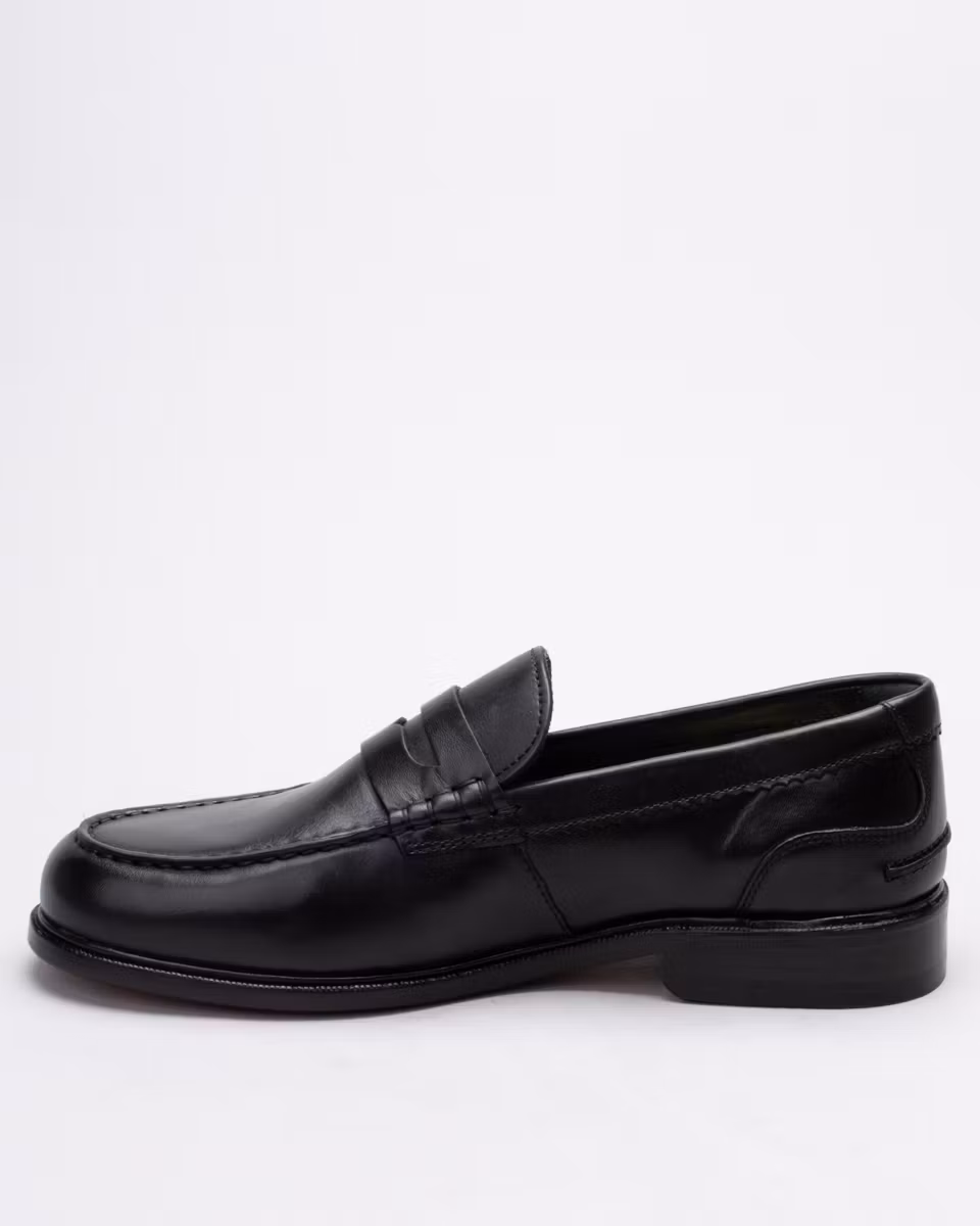 . Upper in black calf leather. Fully leather lined. Leather-covered, cushioned insole. Leather outsole. Blake-stitched construction. Made in India.