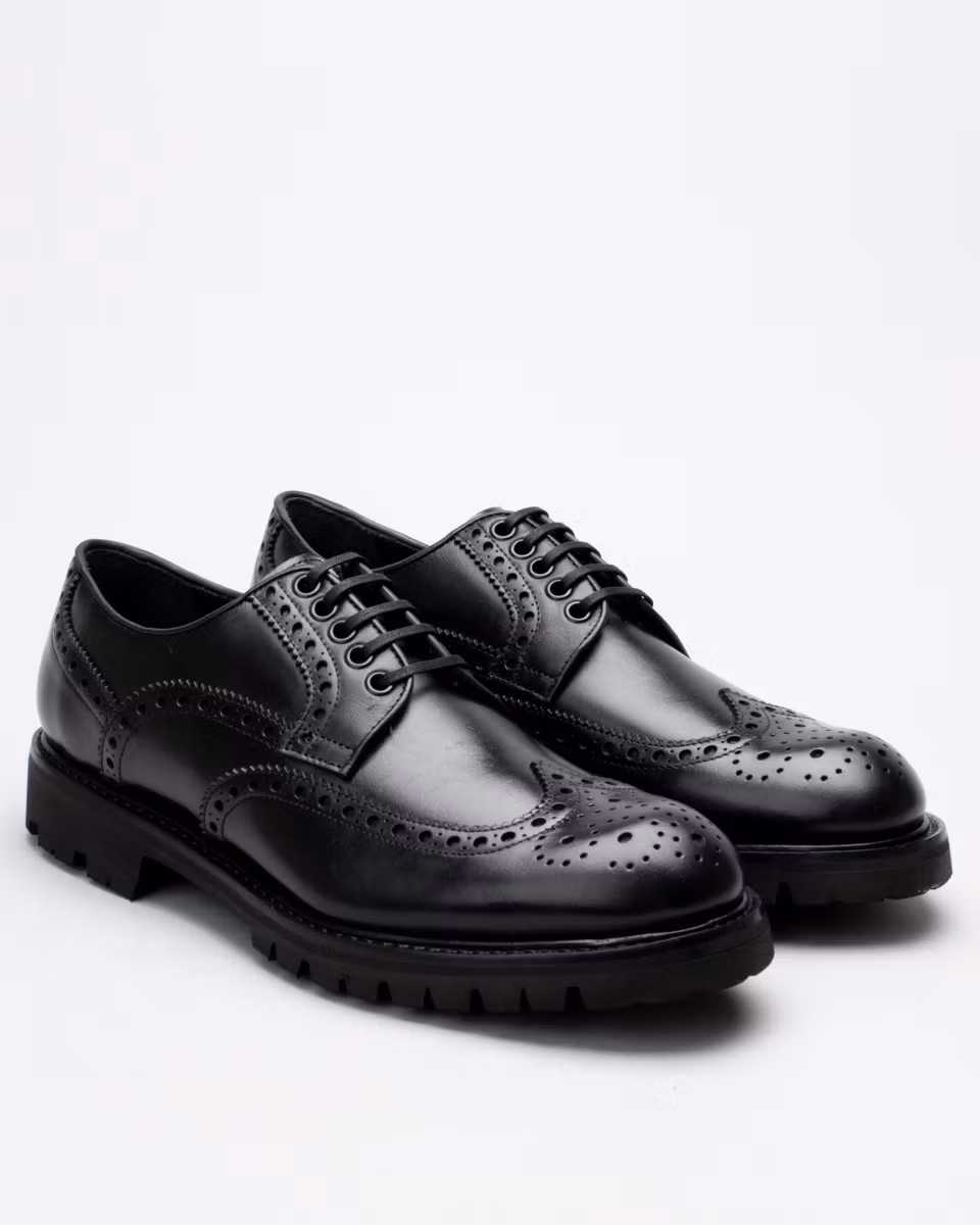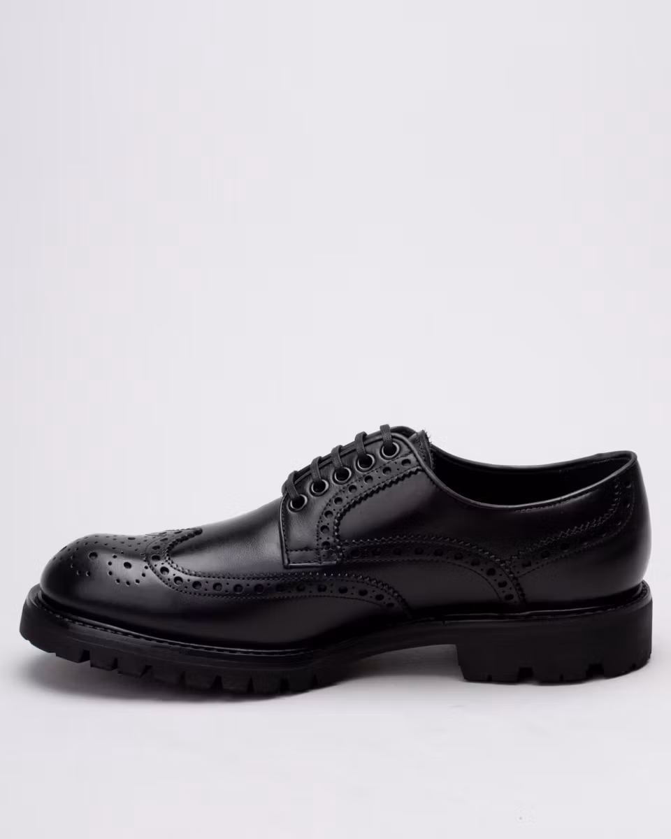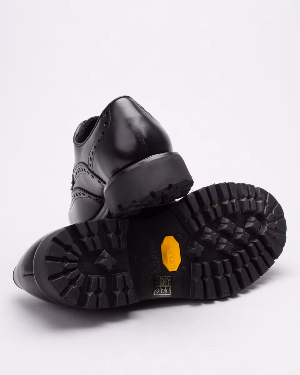Derby with full brogue. Upper in black cowhide leather. Fully leather-lined. Leather insole. Vibram® Montagna, treaded rubber outsole. Goodyear welt construction with storm welt. Handcrafted in Spain.