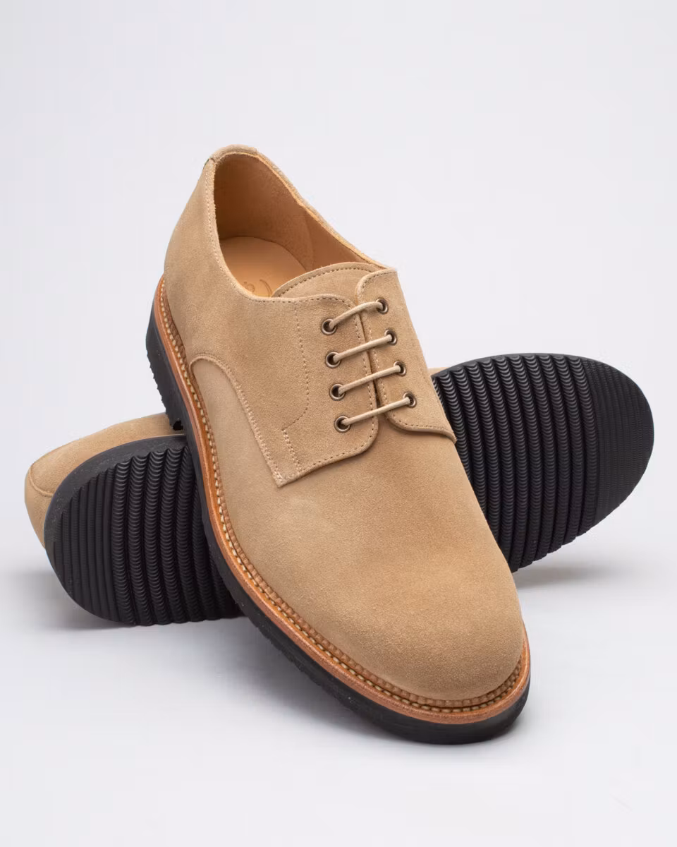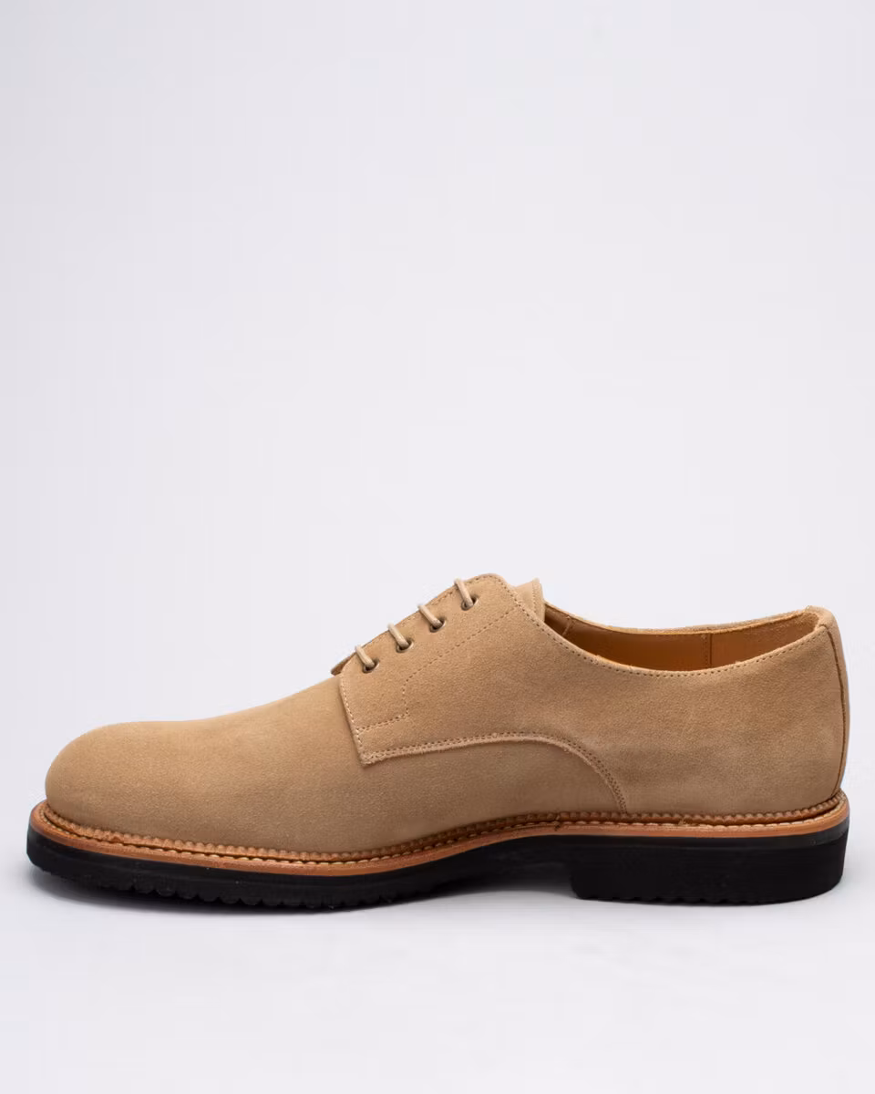 Classic derby from Fiddler. Upper in sand suede. Full leather lining. Leather insole. Vibram Liverpool lightweight rubber outsole. Goodyear welted construction with storm welt. Handcrafted in Spain.