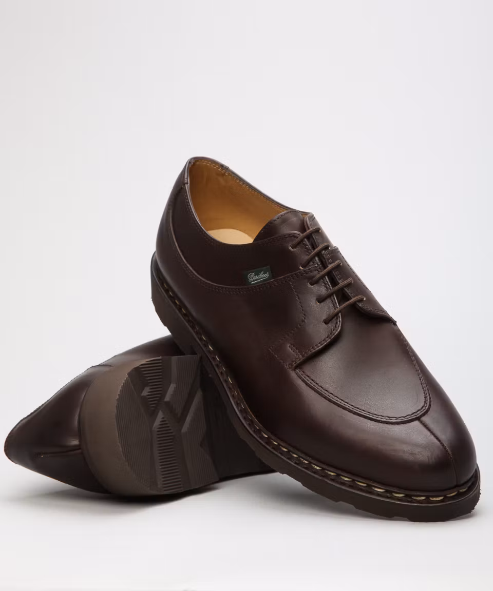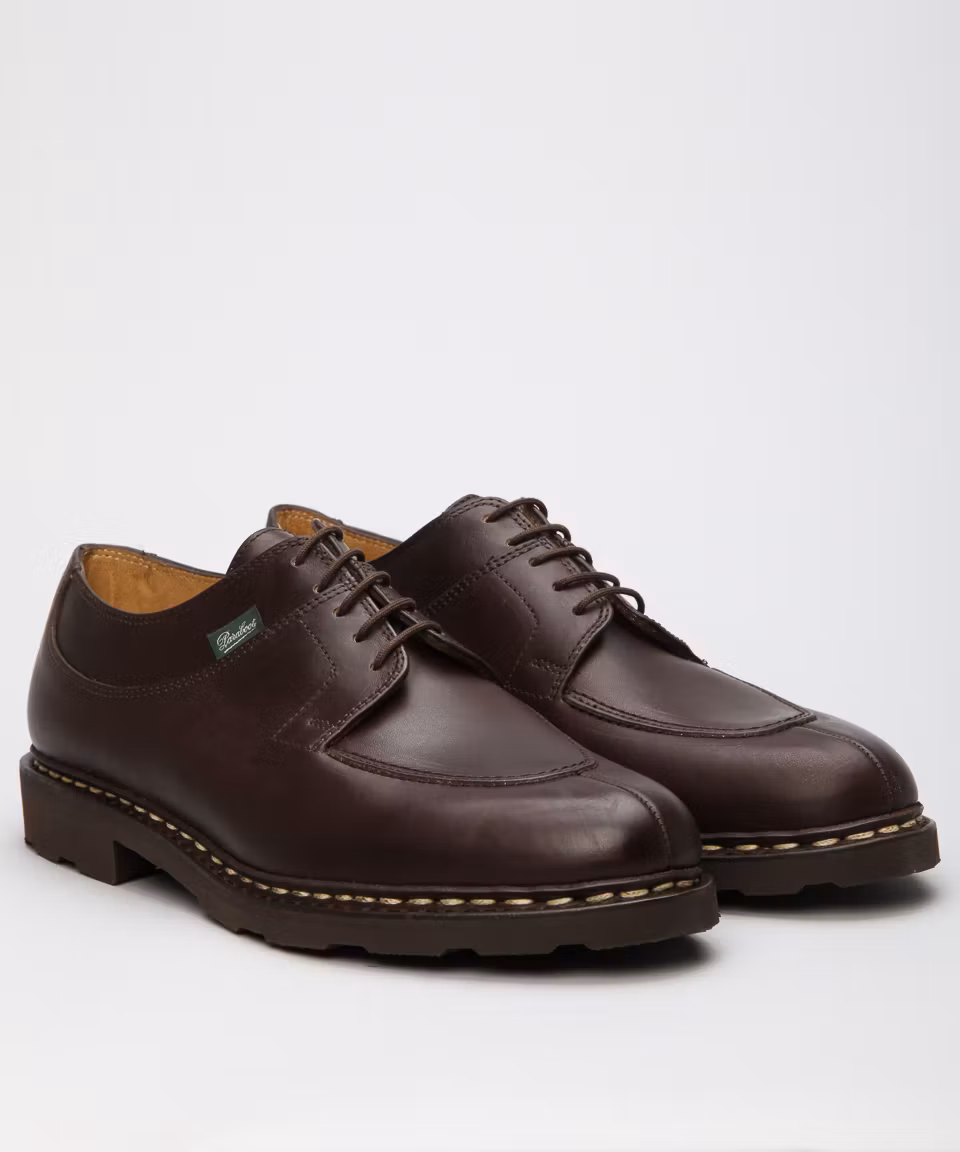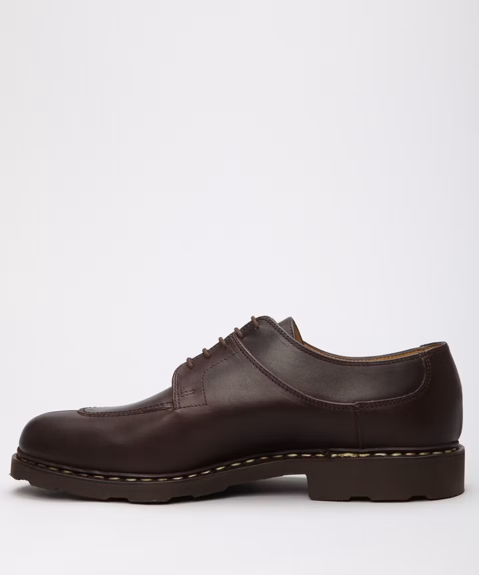 Plain shoe in dark brown waxed leather from French premium manufacturer Paraboot. Rubber outsole. Leather insole. Full leather lining. Split- toe. Norwegian welt construction. Made in France.