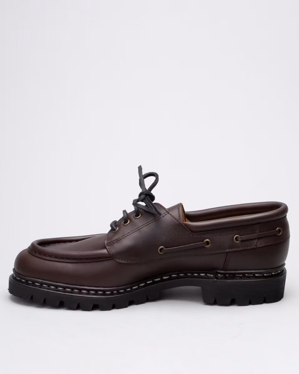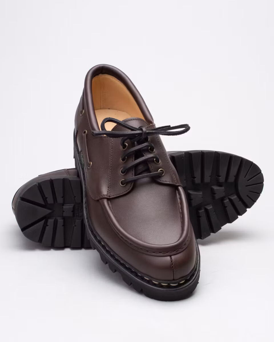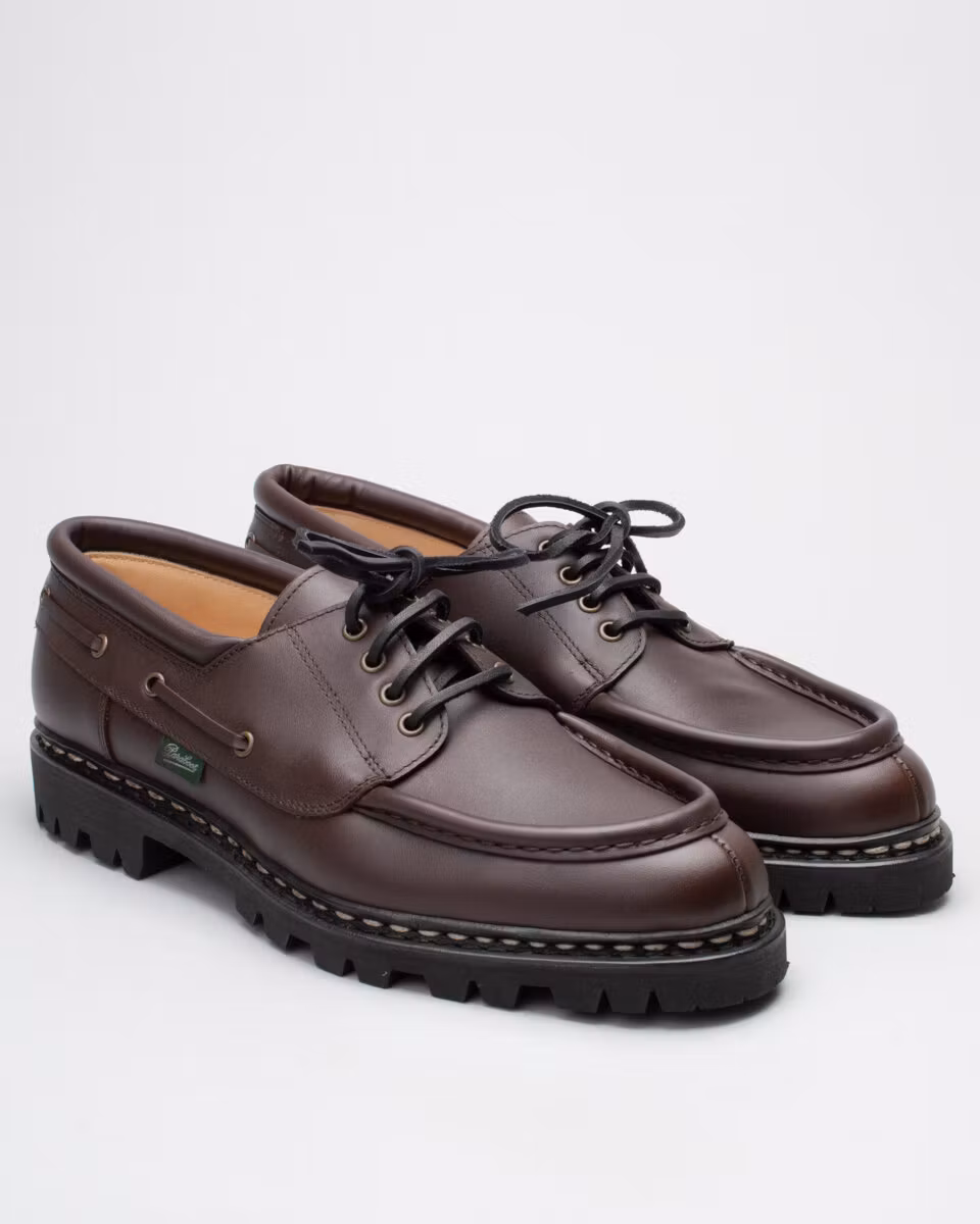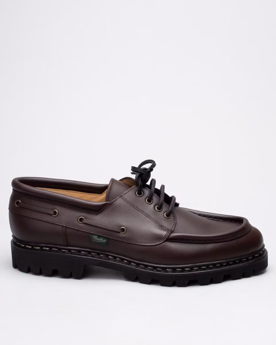 Derby shoe from French Paraboot with U-Tip and split toe. Upper in dark brown full grain leather. Full leather lining. Leather insole. Lugged rubber outsole. Norwegian welt construction. Made in France.