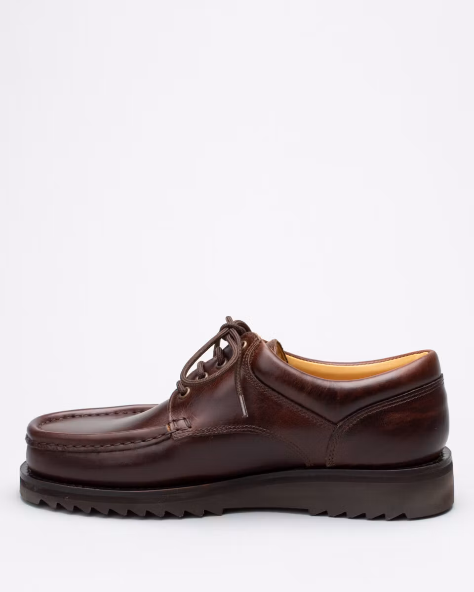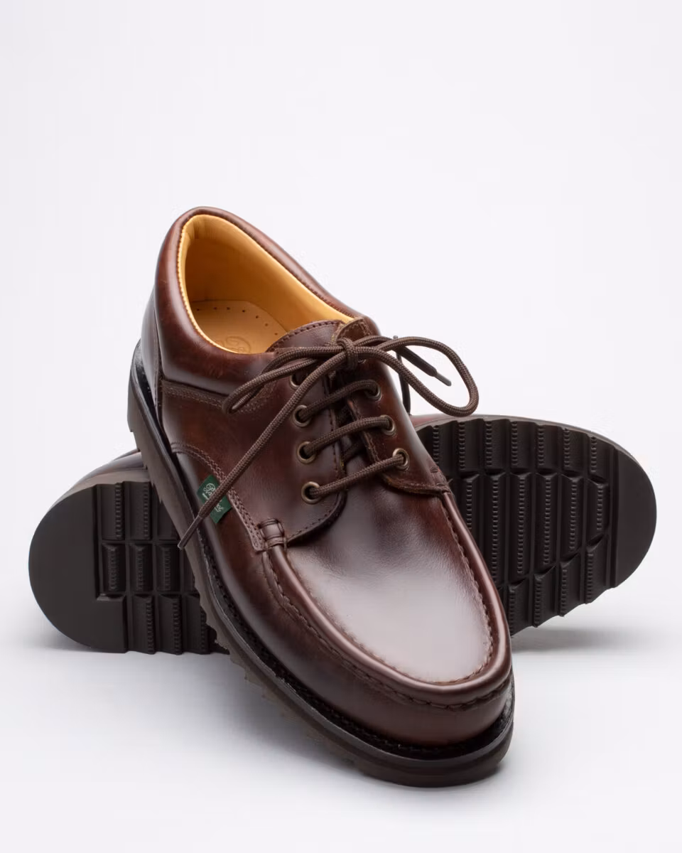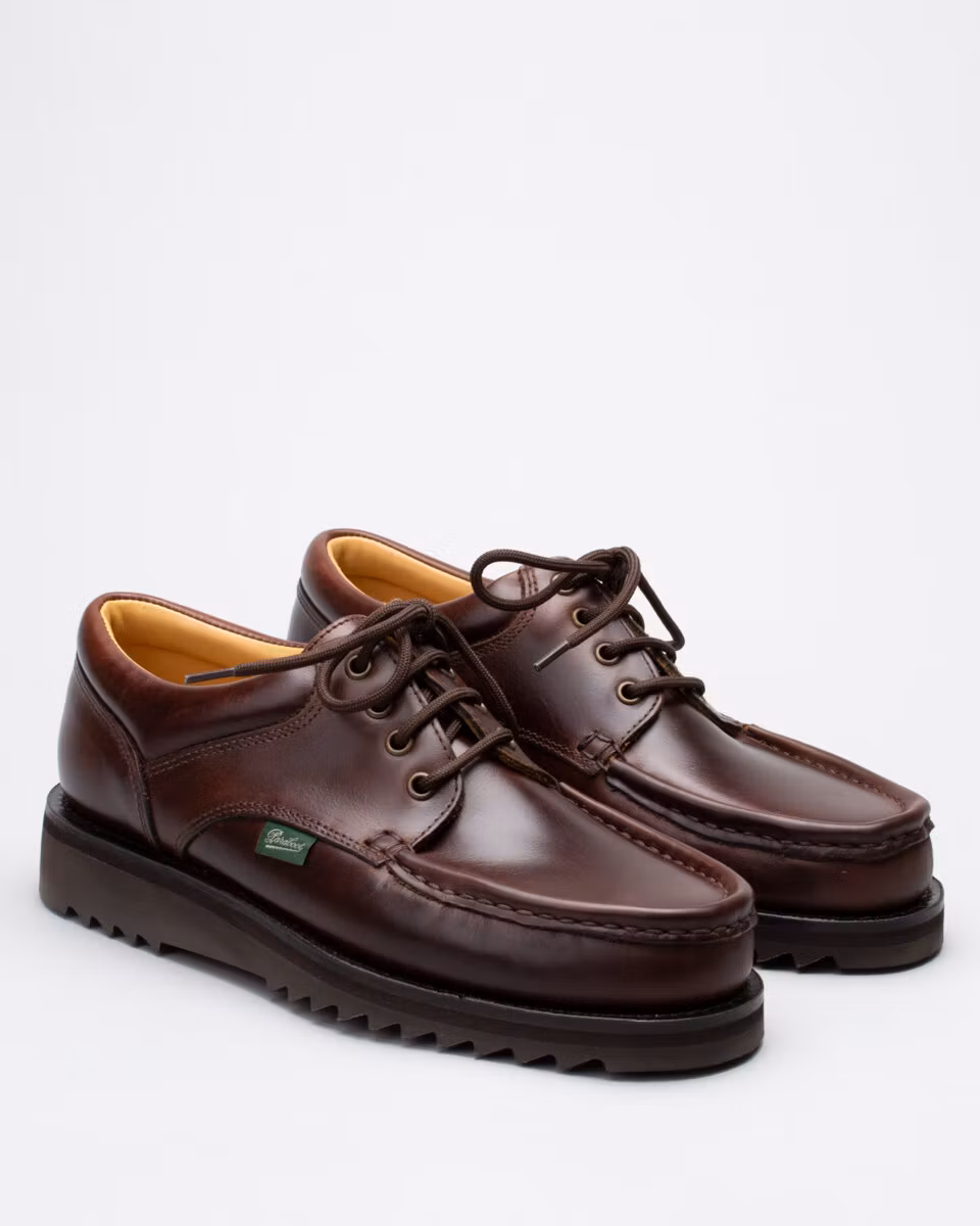 Piped seam Derby from French Paraboot. Upper in chestnut brown leather. Leather insole. Rubber outsole. Full leather lining. Blake-stitch construction. Made in Spain.