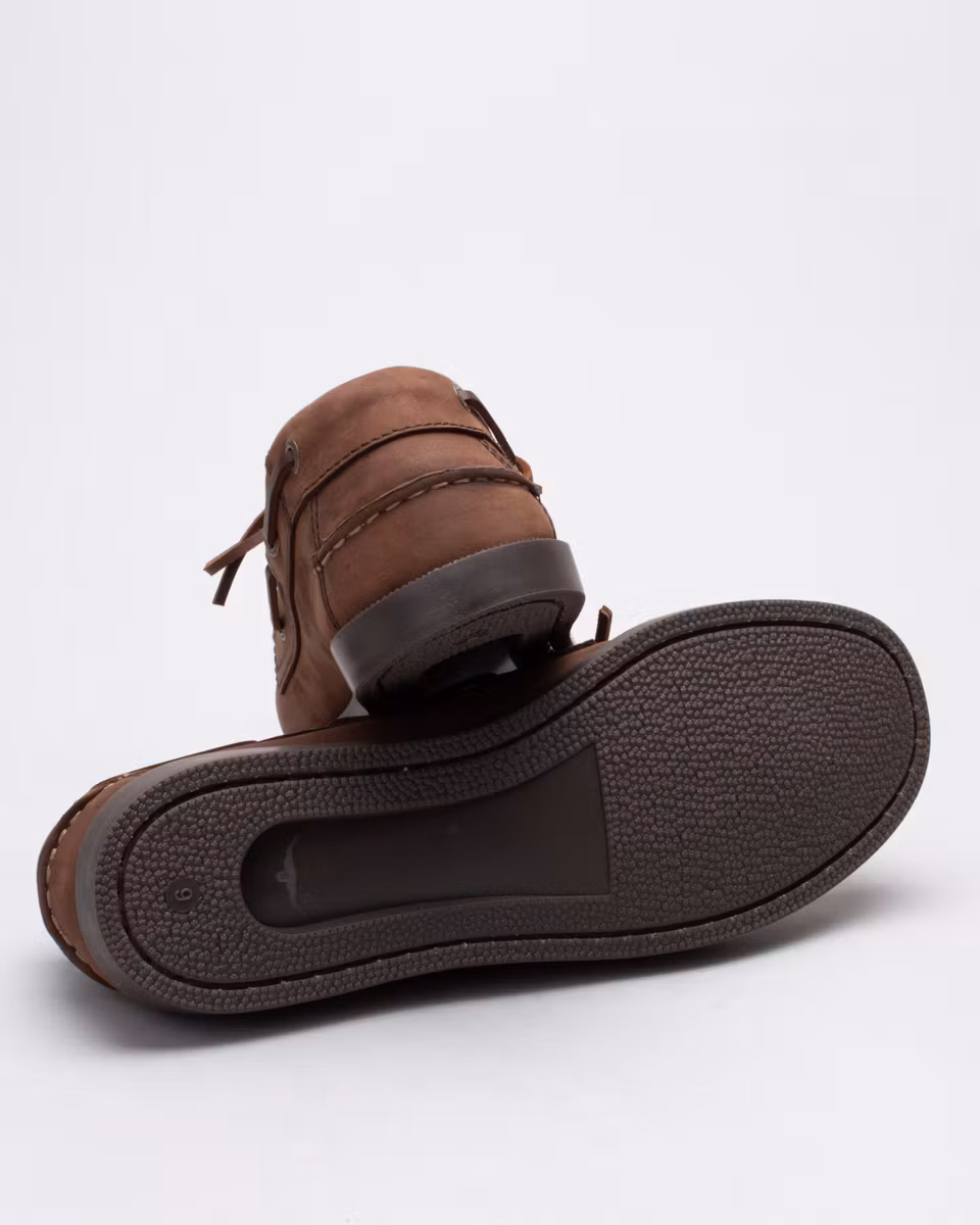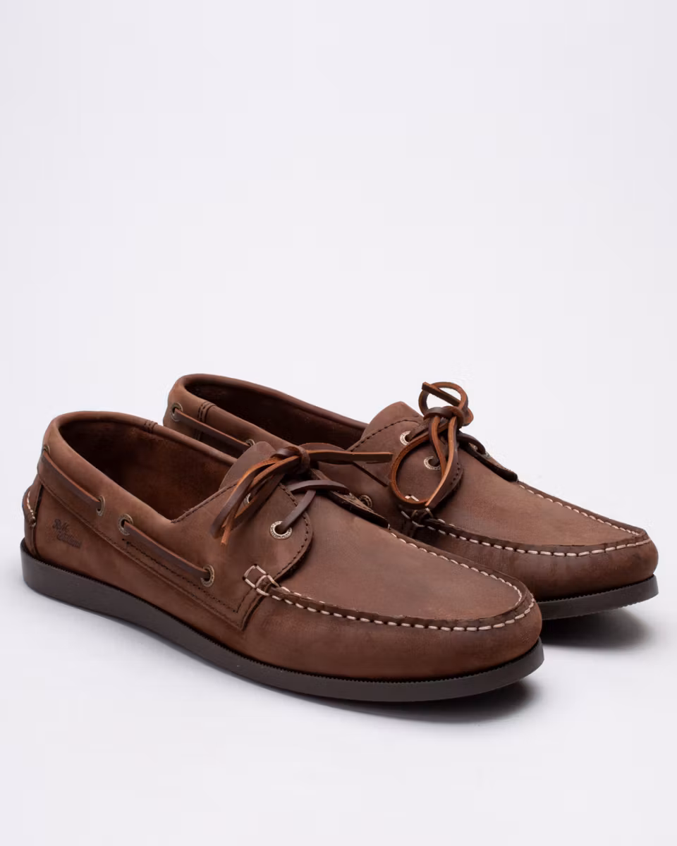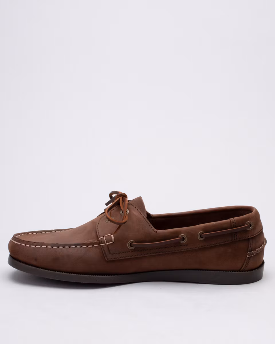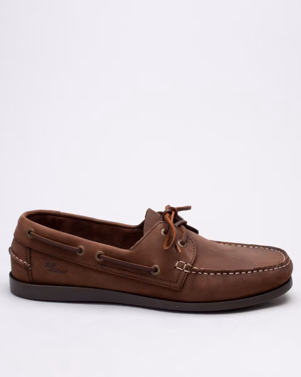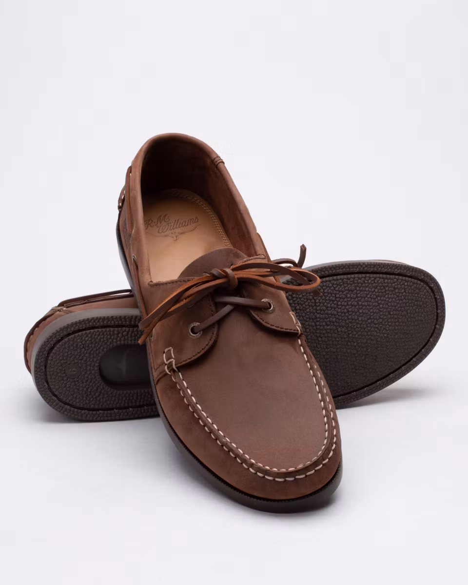 Boat shoe from R.M. Williams. Upper in dark brown nubuck. Unlined. Leather-lined insole. Rubber outsole. Blake-stitched construction. Made in Portugal.