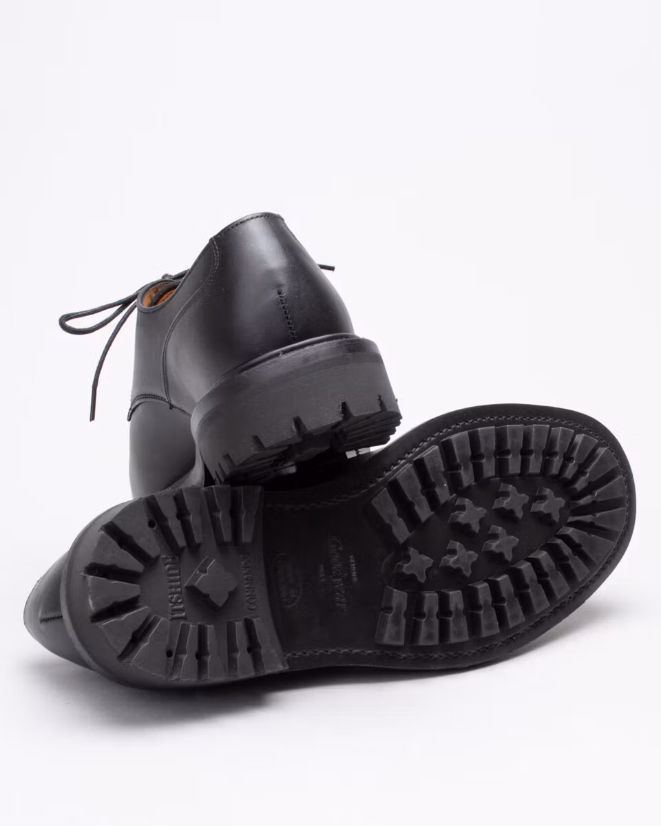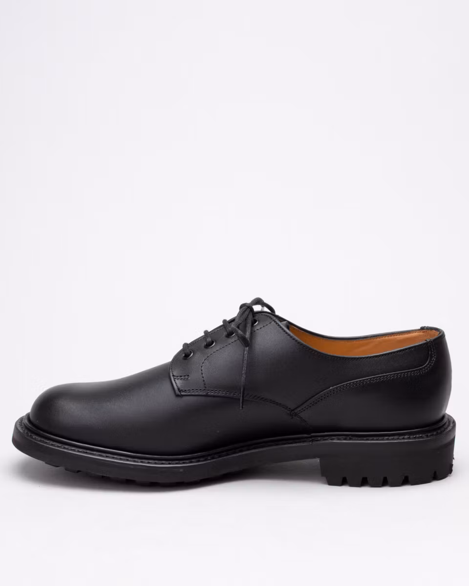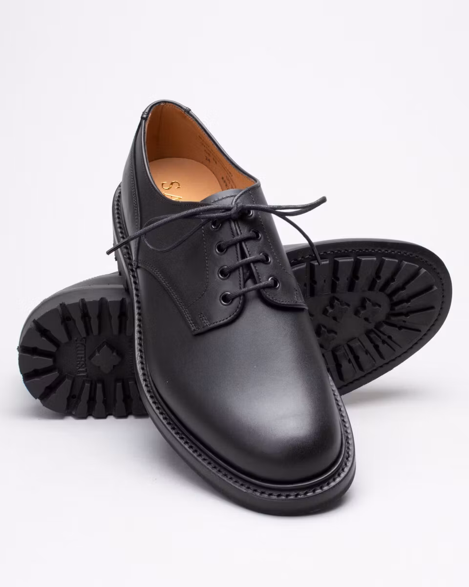 Classic derby shoe from British Sanders & Sanders. Upper in black, waxed, calf leather. Full leather lining. Leather insole. Itshide® Commando rubber outsole. Goodyear welted construction with storm welt. Made in England. Normal last, F.